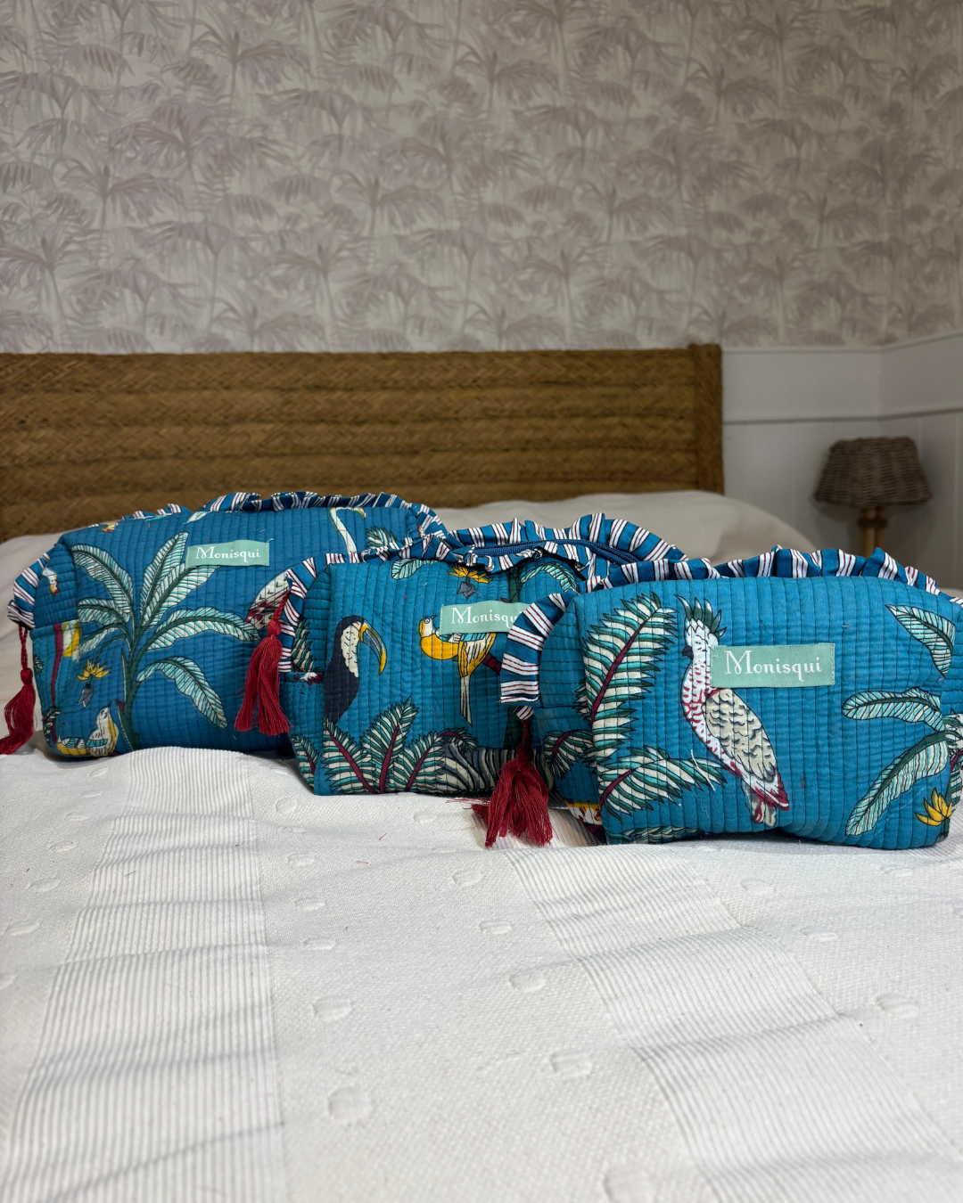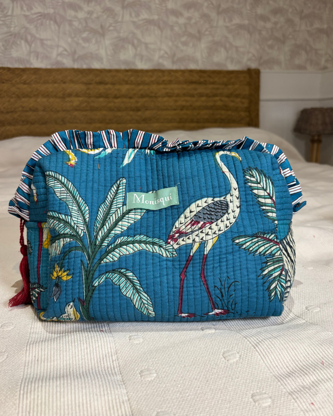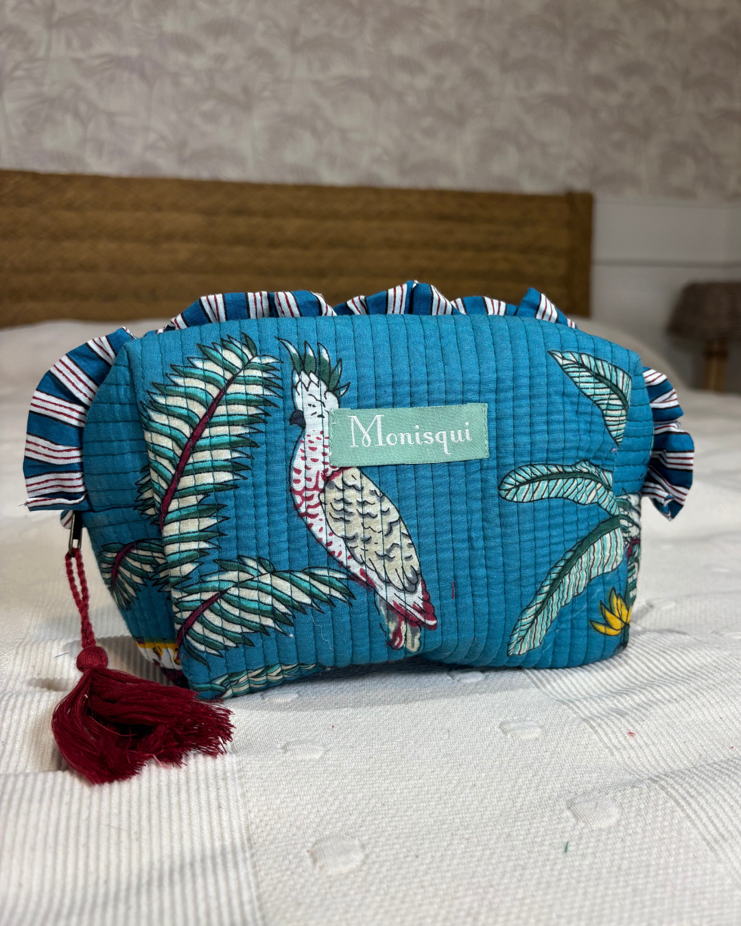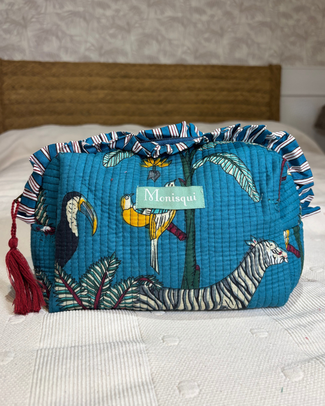 Neceser acolchado. Cierre de cremallera con borla decorativa y un volante fruncido alrededor del borde.