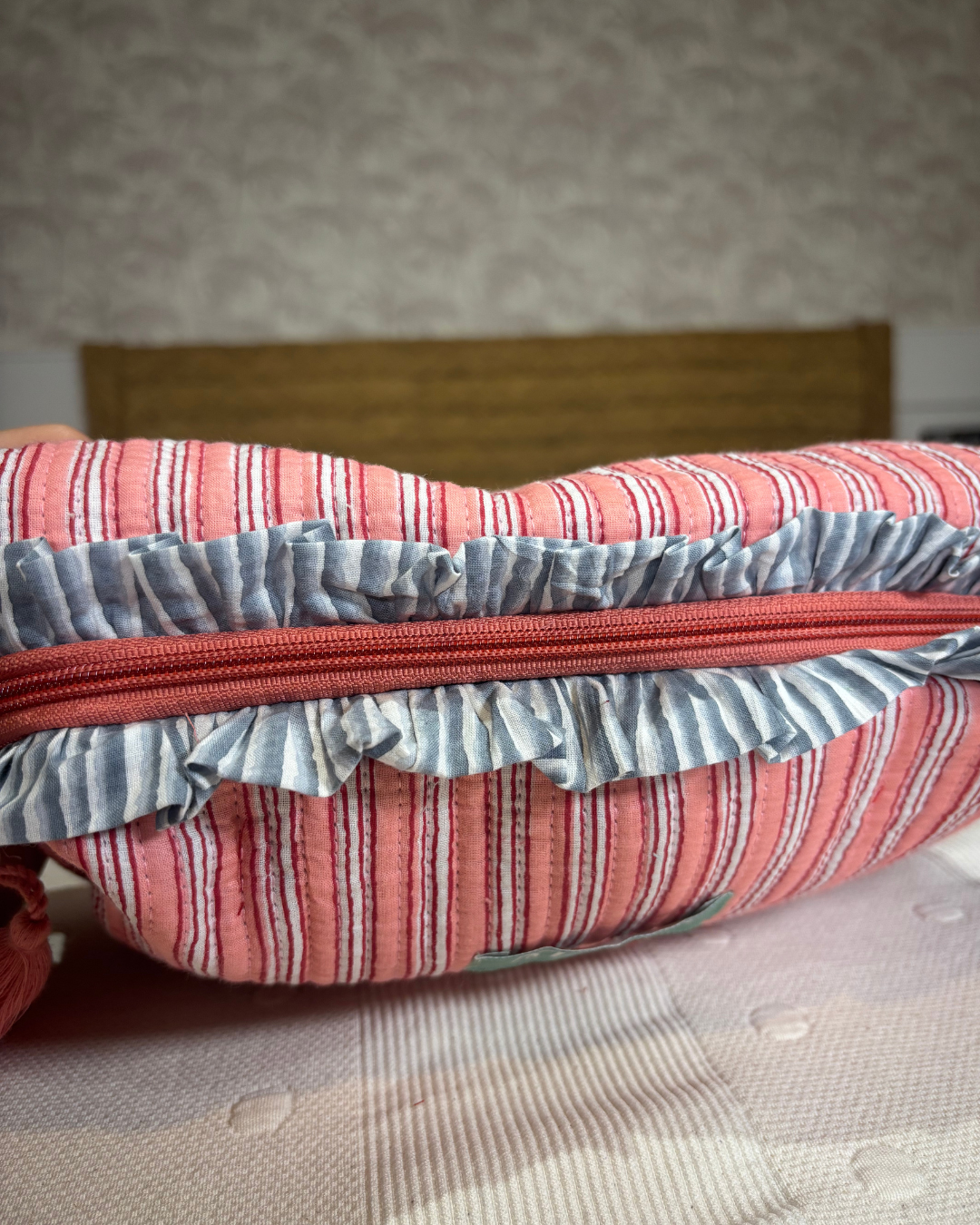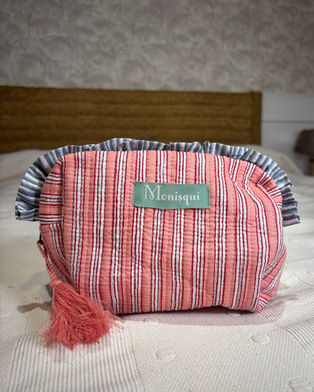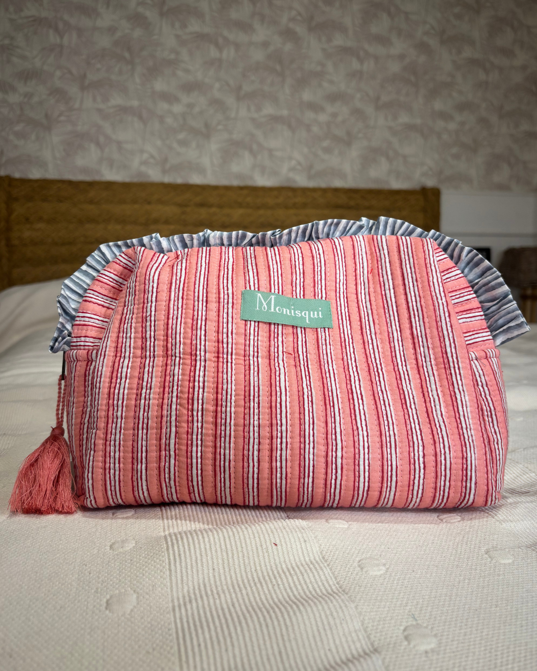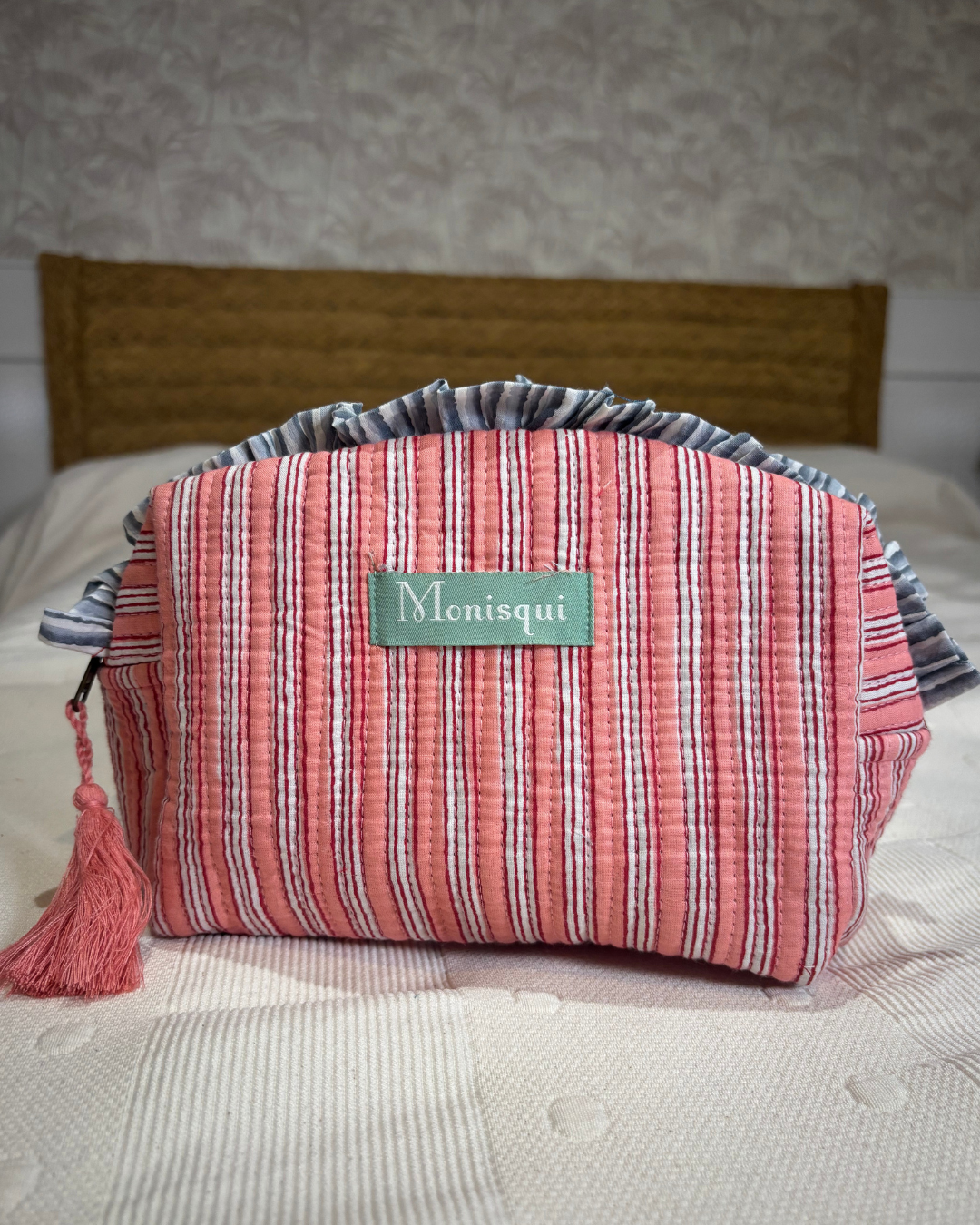 Neceser acolchado. Cierre de cremallera con borla decorativa y un volante fruncido alrededor del borde.