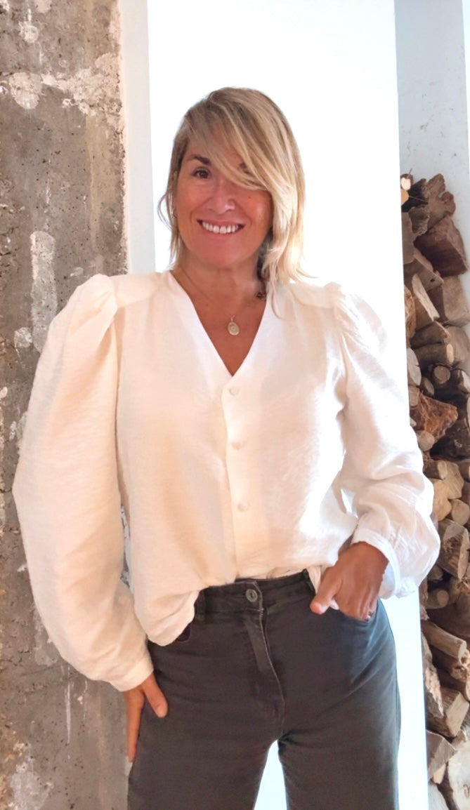 Blusa de manga larga. Escote en "V". Cierre frontal abotonado. Mangas abullonadas. Tiene hombreras