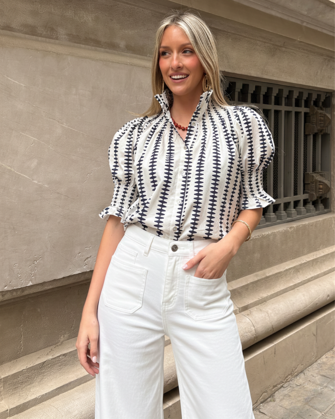 Blusa estampada de algodón, abotonada. Cuello redondo fruncido en nido de abeja. Mangas 3/4 abullonadas con puños elásticos fruncidos en nido de abeja.