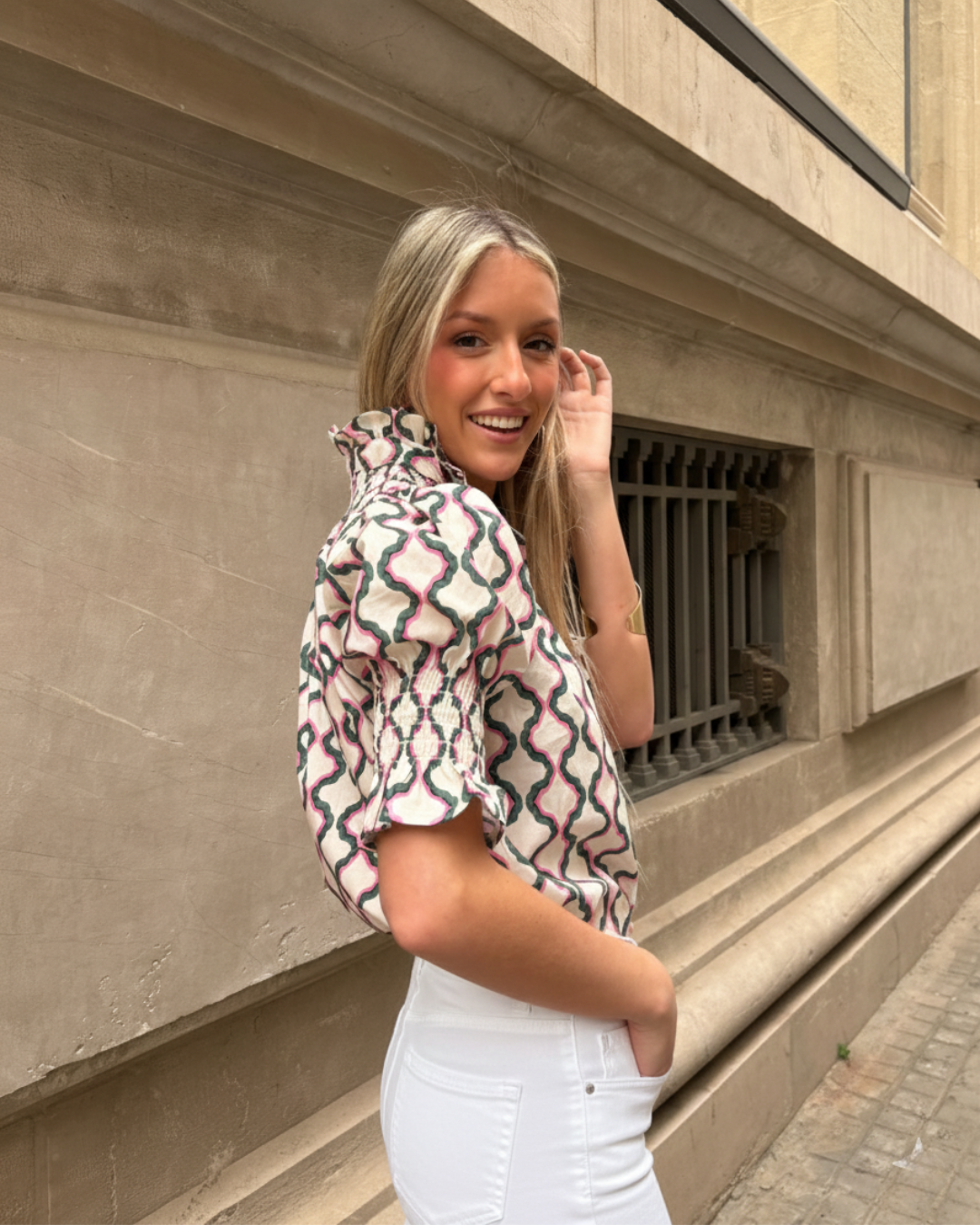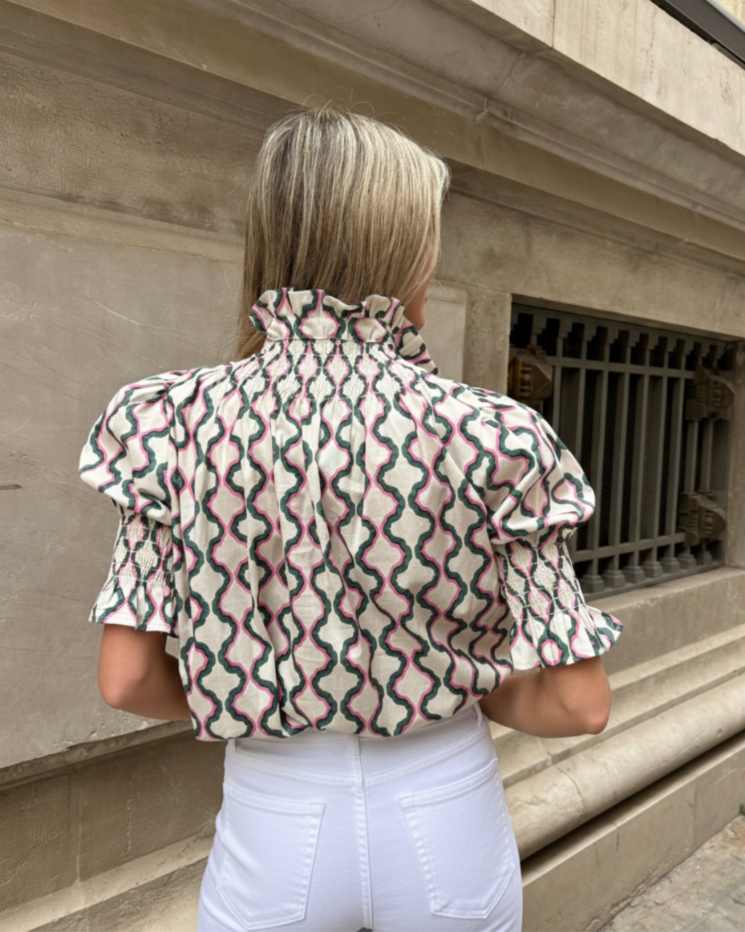 Blusa estampada de algodón, abotonada. Cuello redondo fruncido en nido de abeja. Mangas 3/4 abullonadas con puños elásticos fruncidos en nido de abeja.