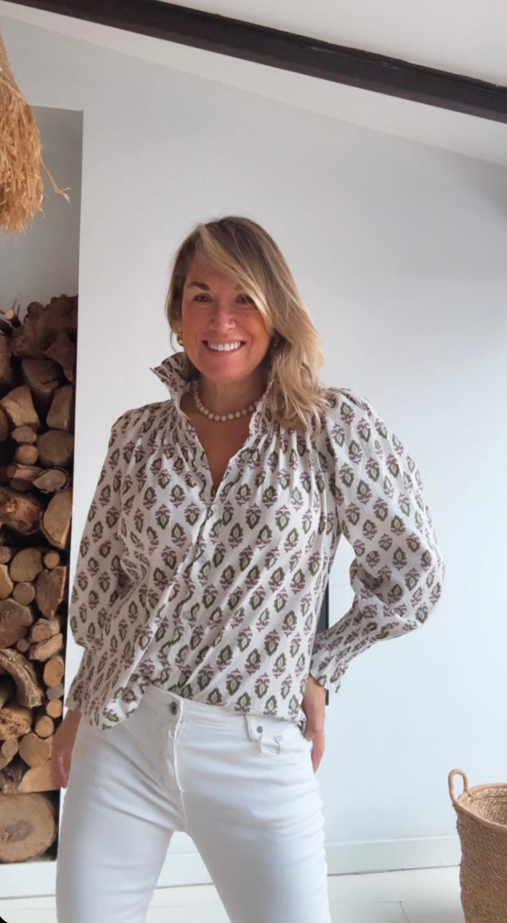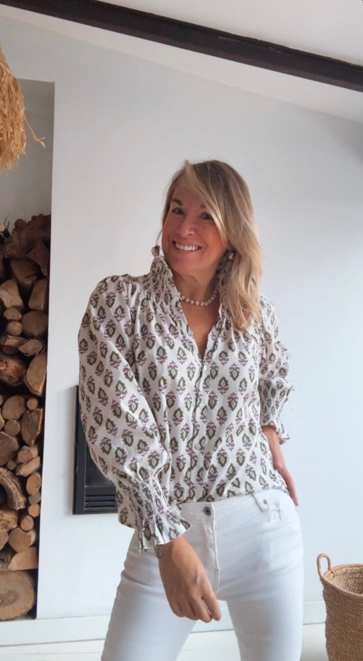 Blusa de cuello francés abotonada. Mangas largas ligeramente abullonadas con puños de goma elástica en nido de abeja.