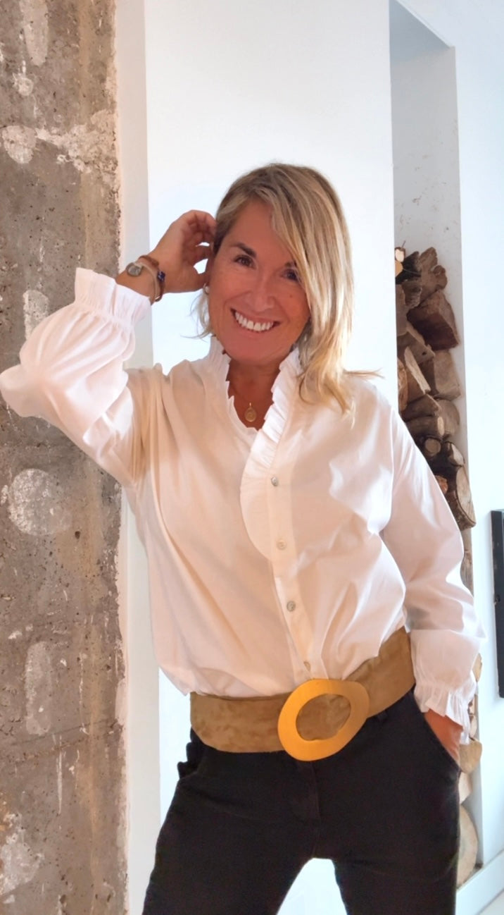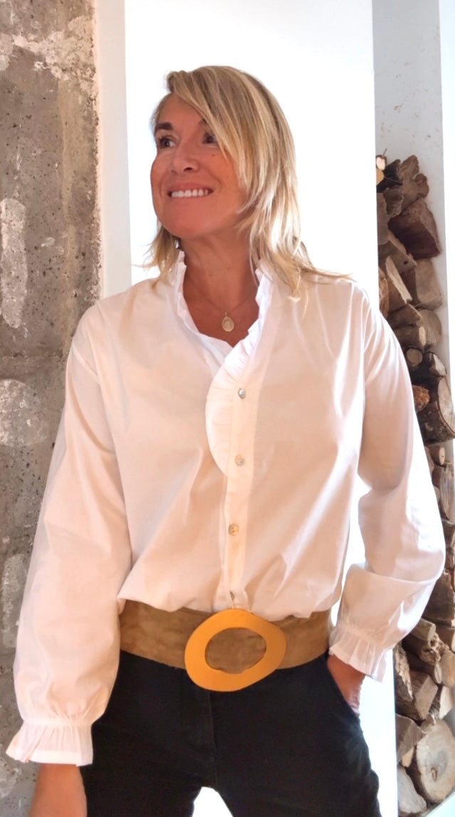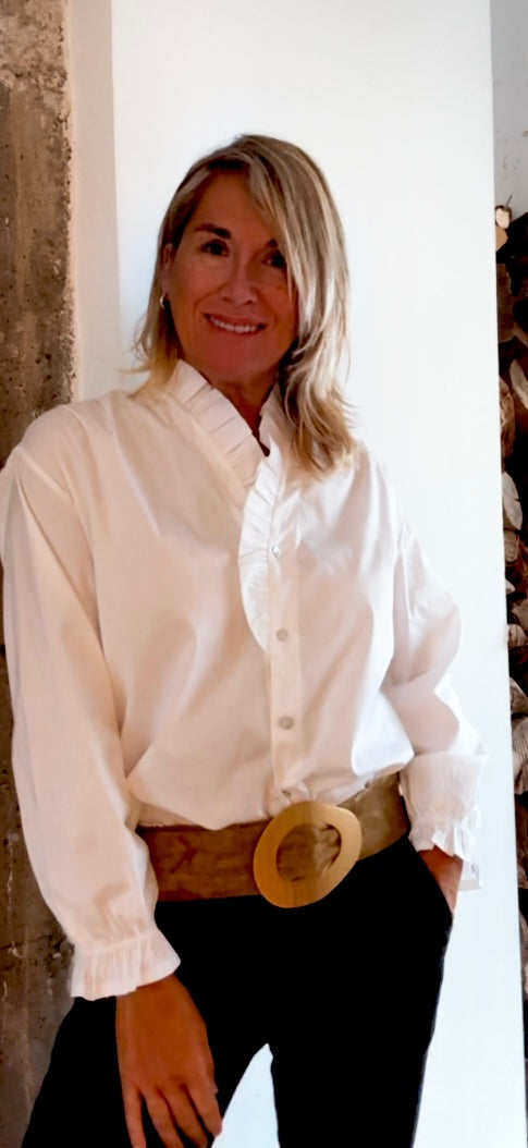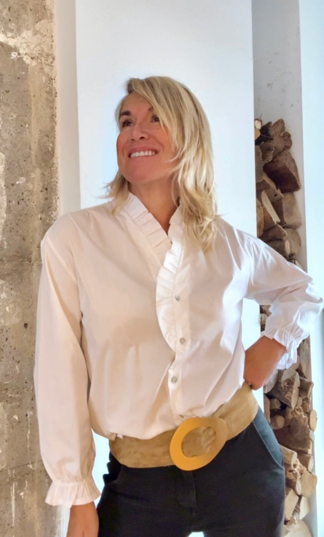 Camisa de manga larga. Cuello en "V" con detalles fruncidos. Puños fruncidos.