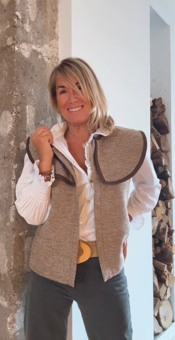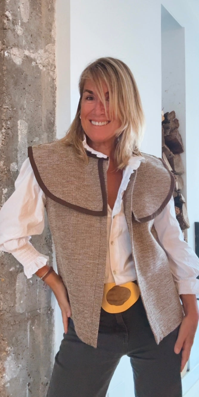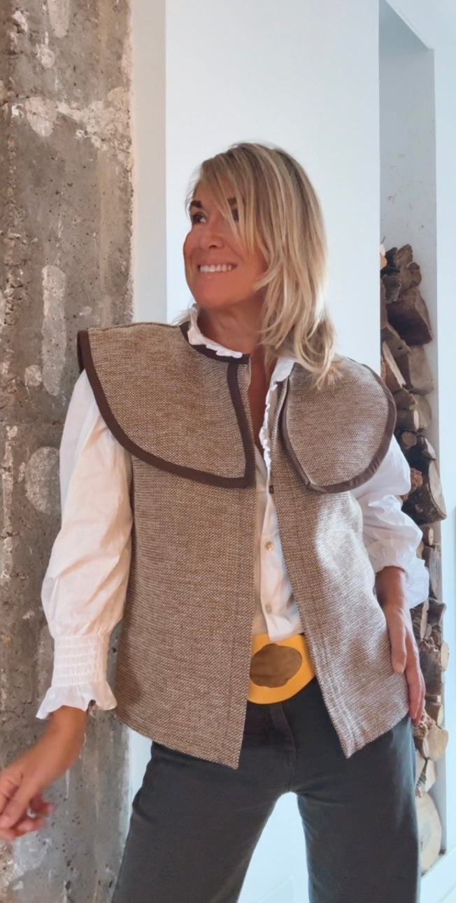 Chaleco midi. Corte recto. Cuello redondo con solapas. Sin cierre frontal.