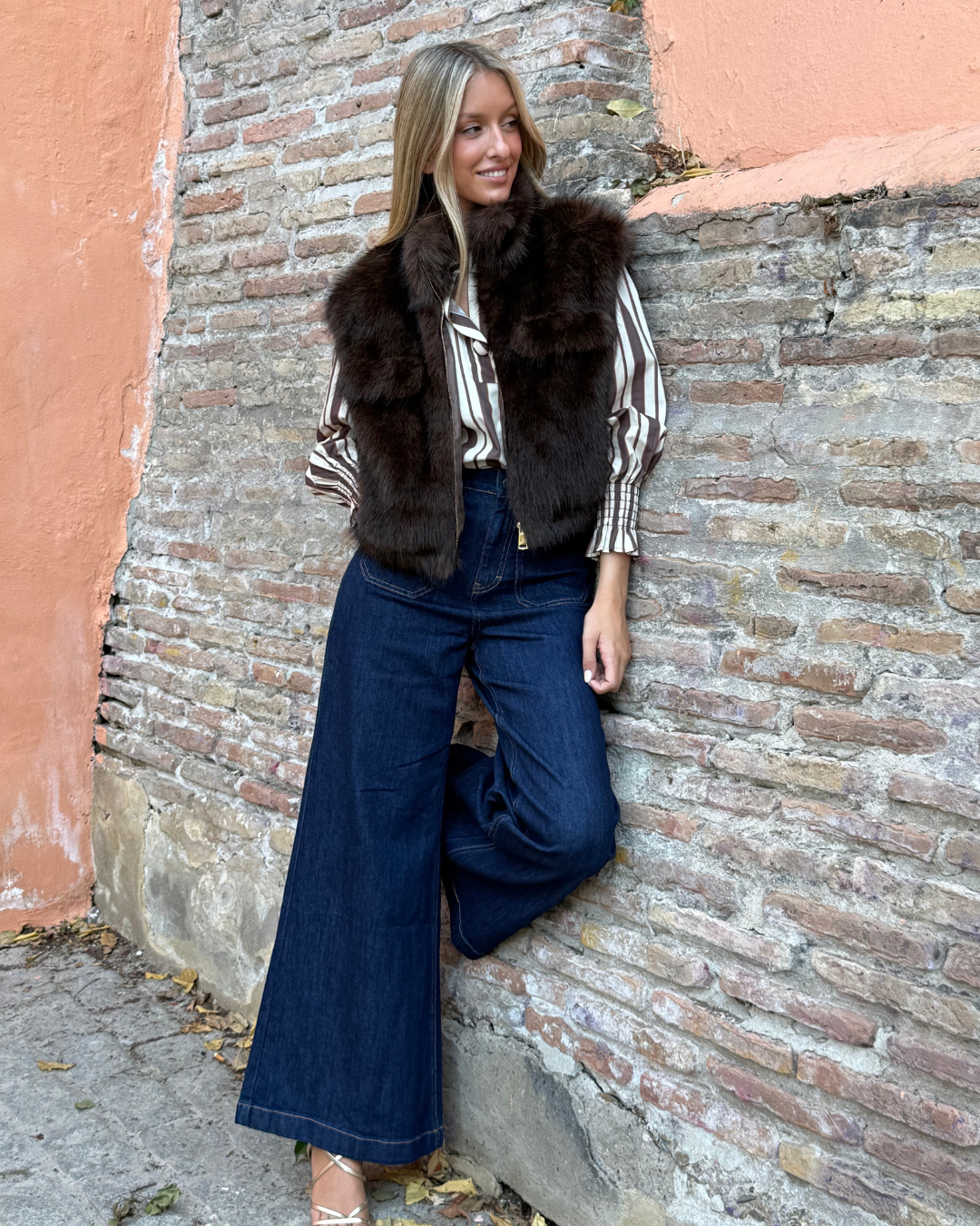 Chaleco de pelo. Corte recto. Cierre frontal con cremallera y bolsillos laterales. Sin mangas y con textura suave y voluminosa.