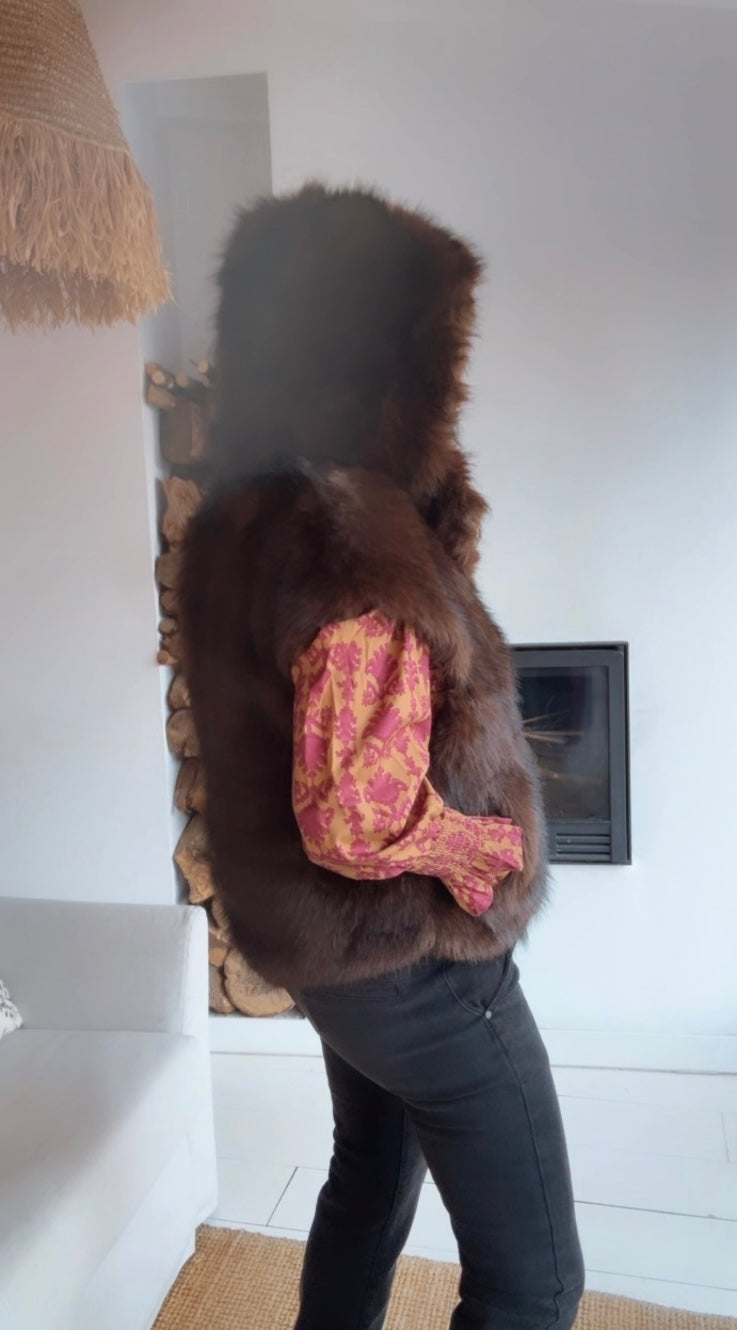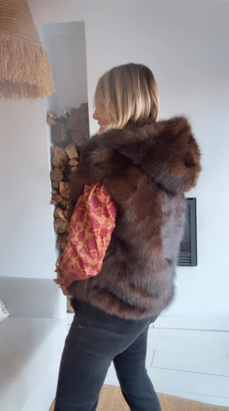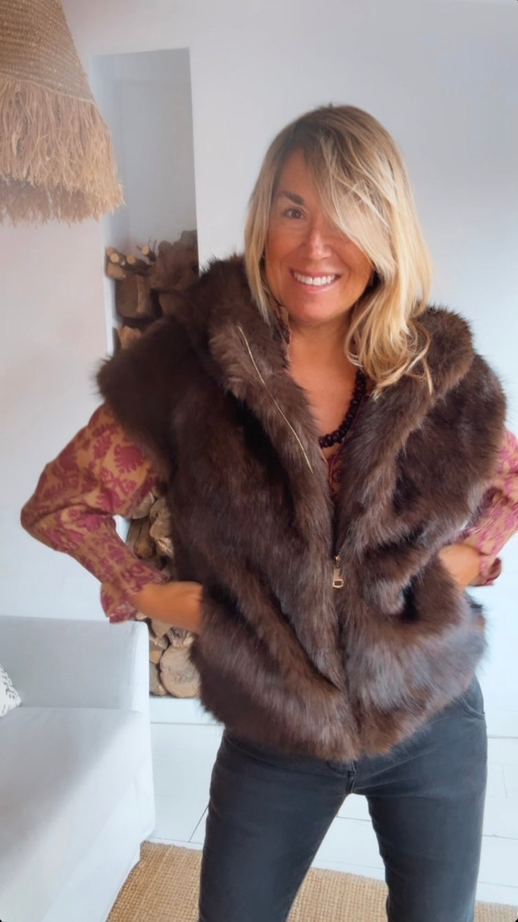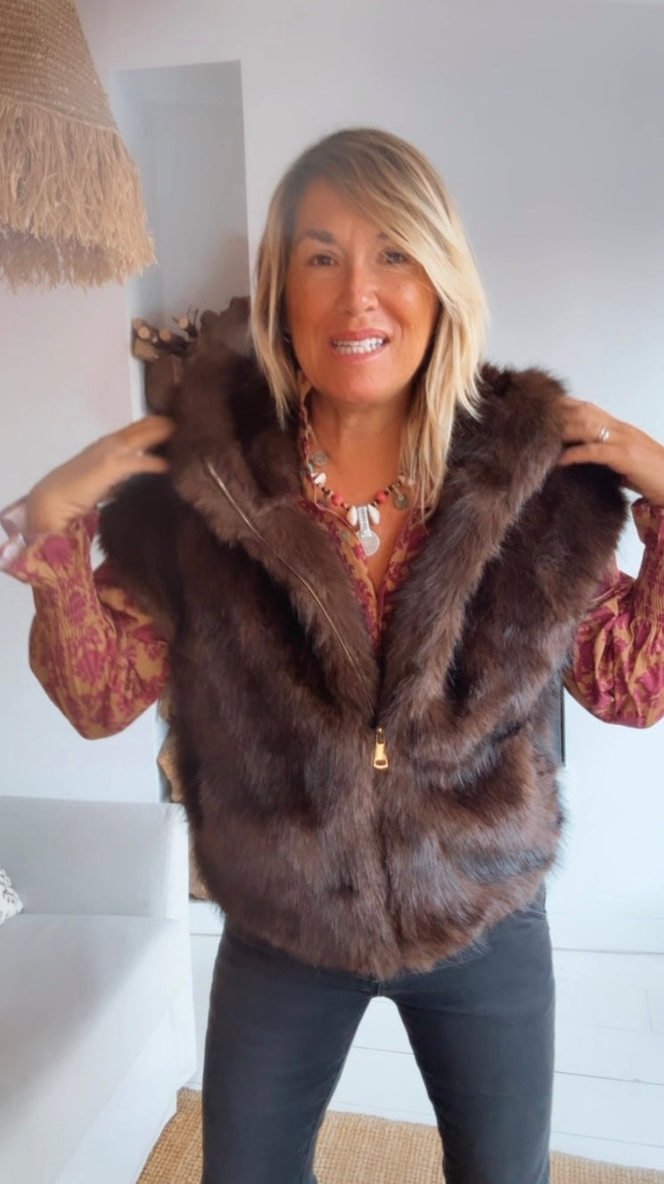 Chaleco de pelo de sintético con capucha. Corte recto. Cierre con cremallera. Sin mangas y con textura suave y voluminosa.