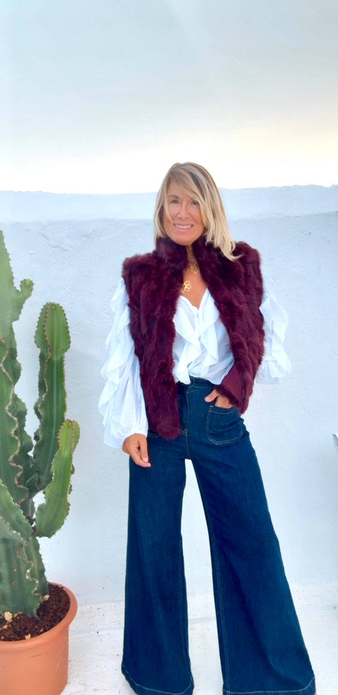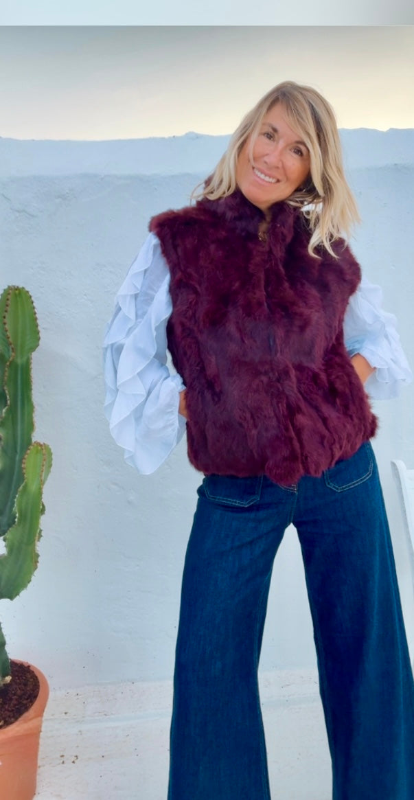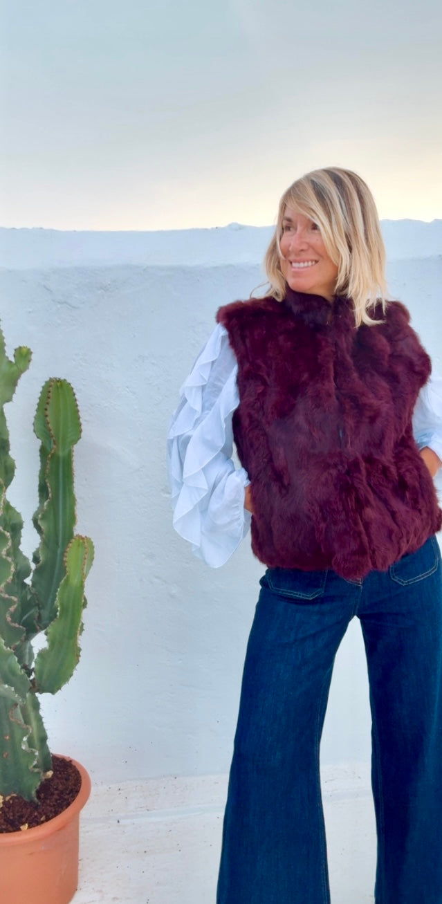 Chaleco corto de pelo natural. Corte recto. Cierre frontal con corchete y bolsillos laterales.