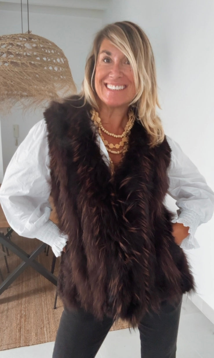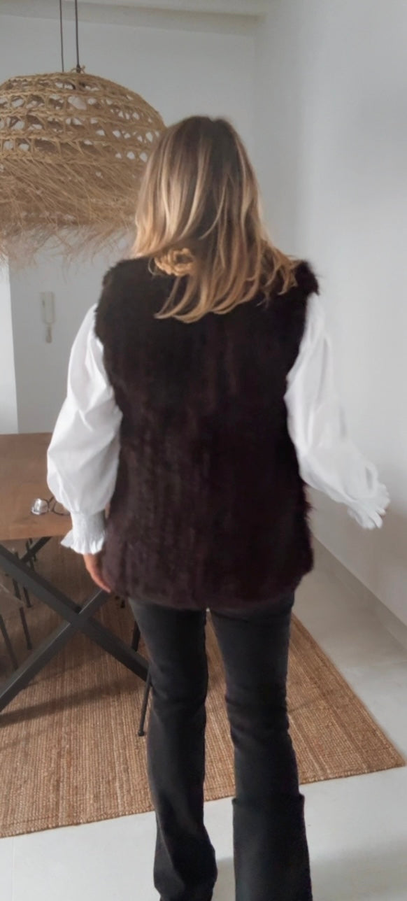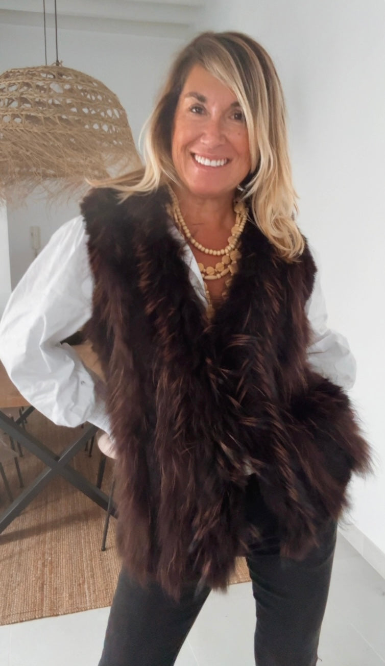 Chaleco de pelo natural. Corte recto. Cierre frontal con corchete. Pelo de conejo y zorro.