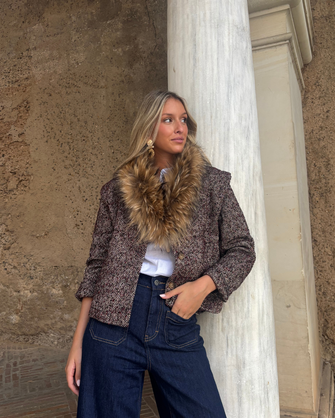 Chaqueta de tejido espigado. Corte recto. Mangas largas. Cierre frontal con botones.