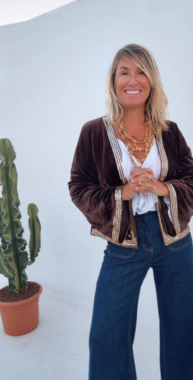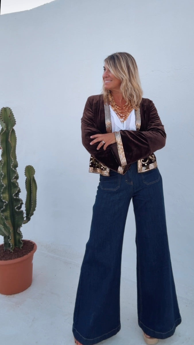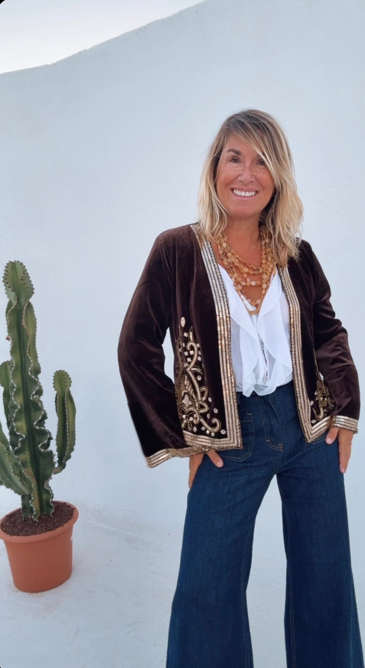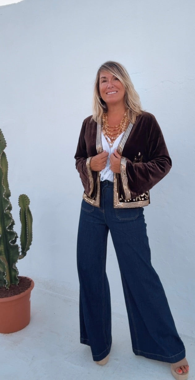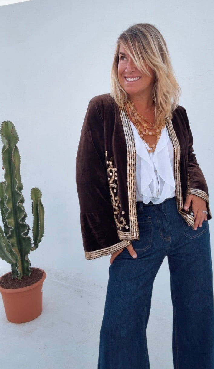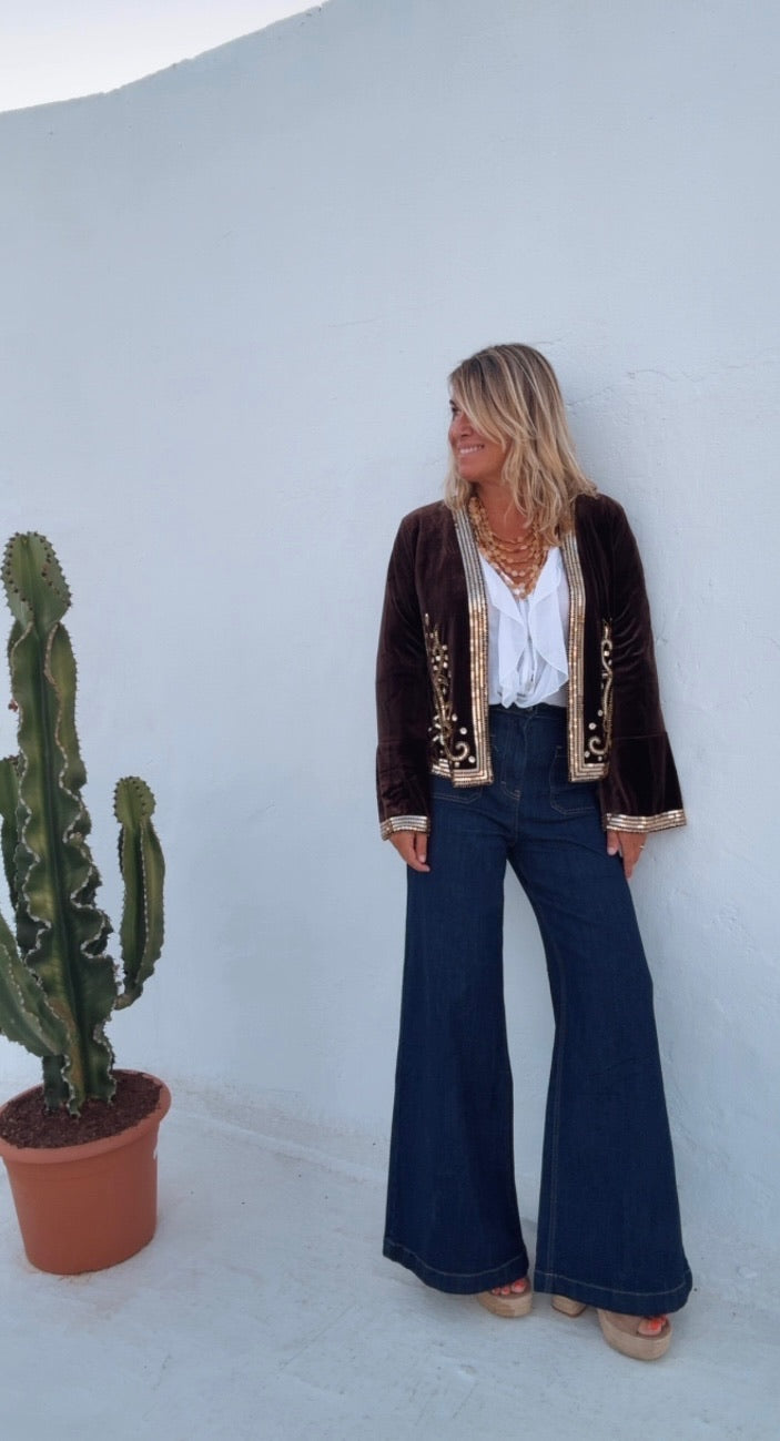 Chaqueta corta con mangas acampanadas en los puños. Tejido de terciopelo con detalle de bordados y lentejuelas. Abierta sin cierres.
