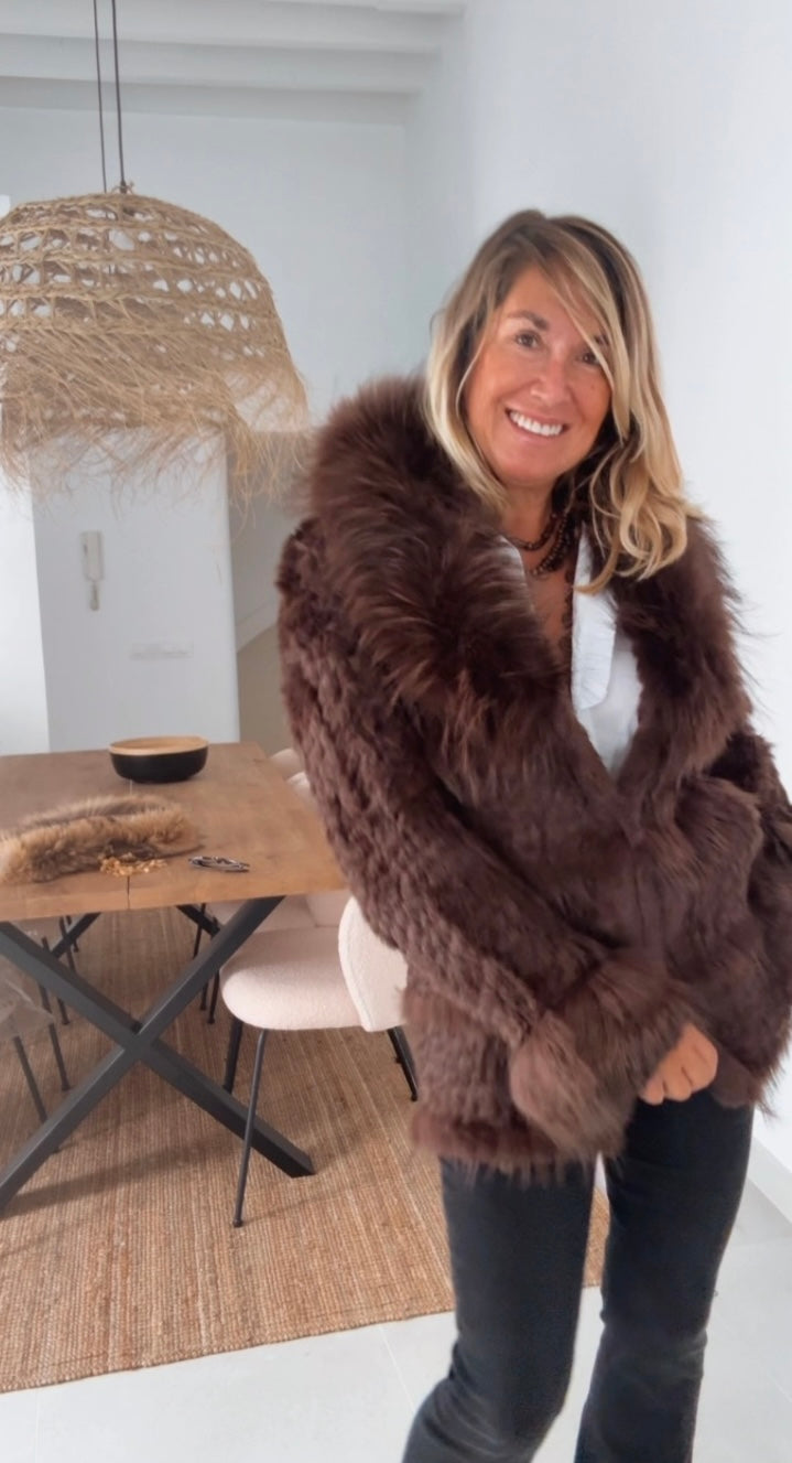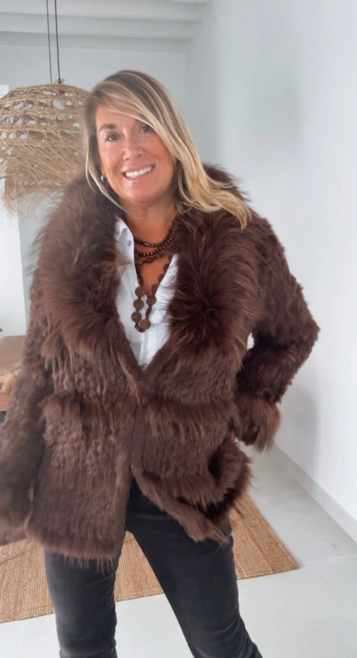 Chaqueta marrón de pelo natural. Corte recto. Cuello de solapa ancha amplia con pelo voluminoso. Cierre con corchetes.