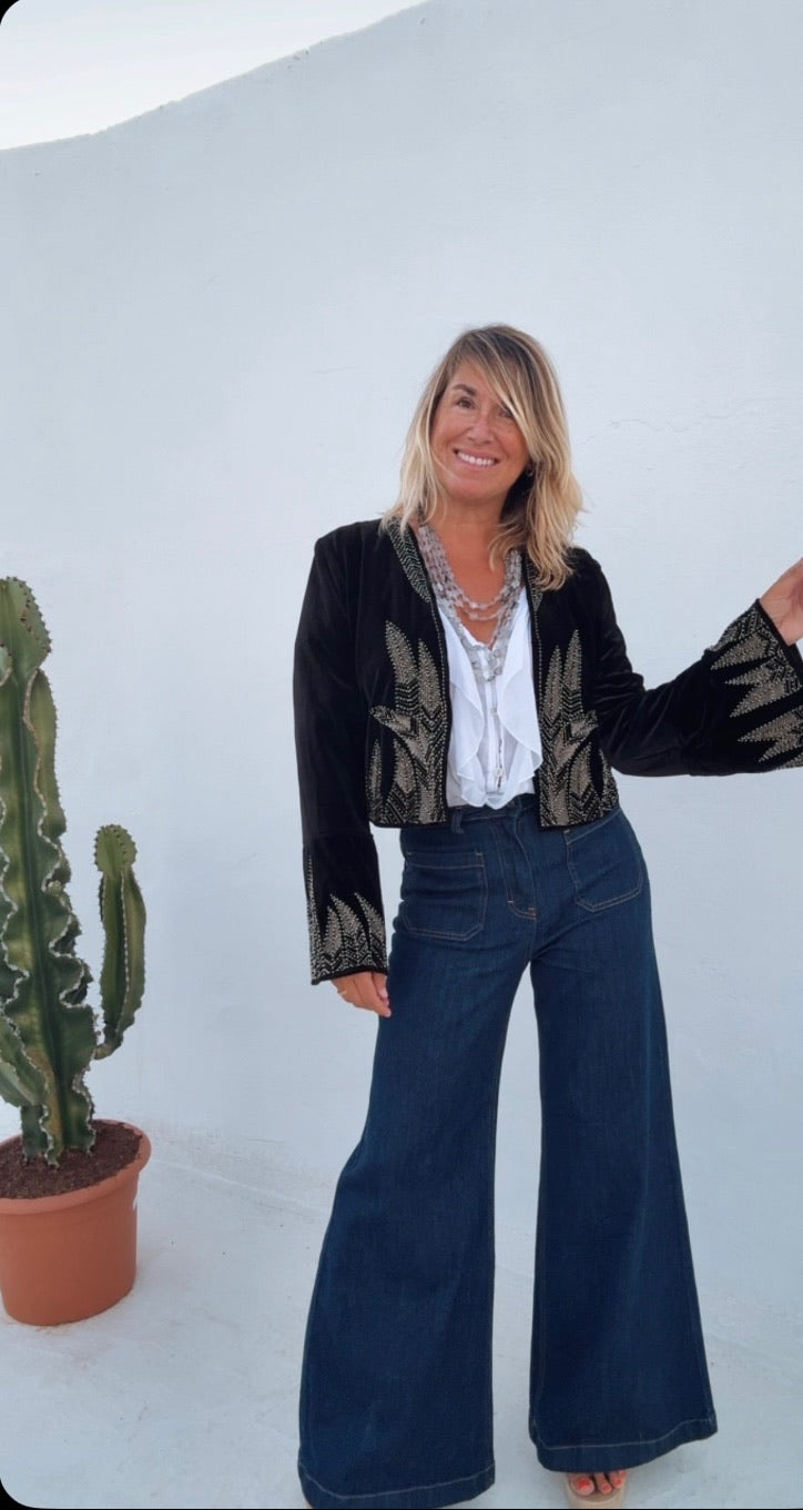 Chaqueta corta con mangas acampanadas en los puños. Tejido de terciopelo con detalle de bordados y lentejuelas. Abierta sin cierres.