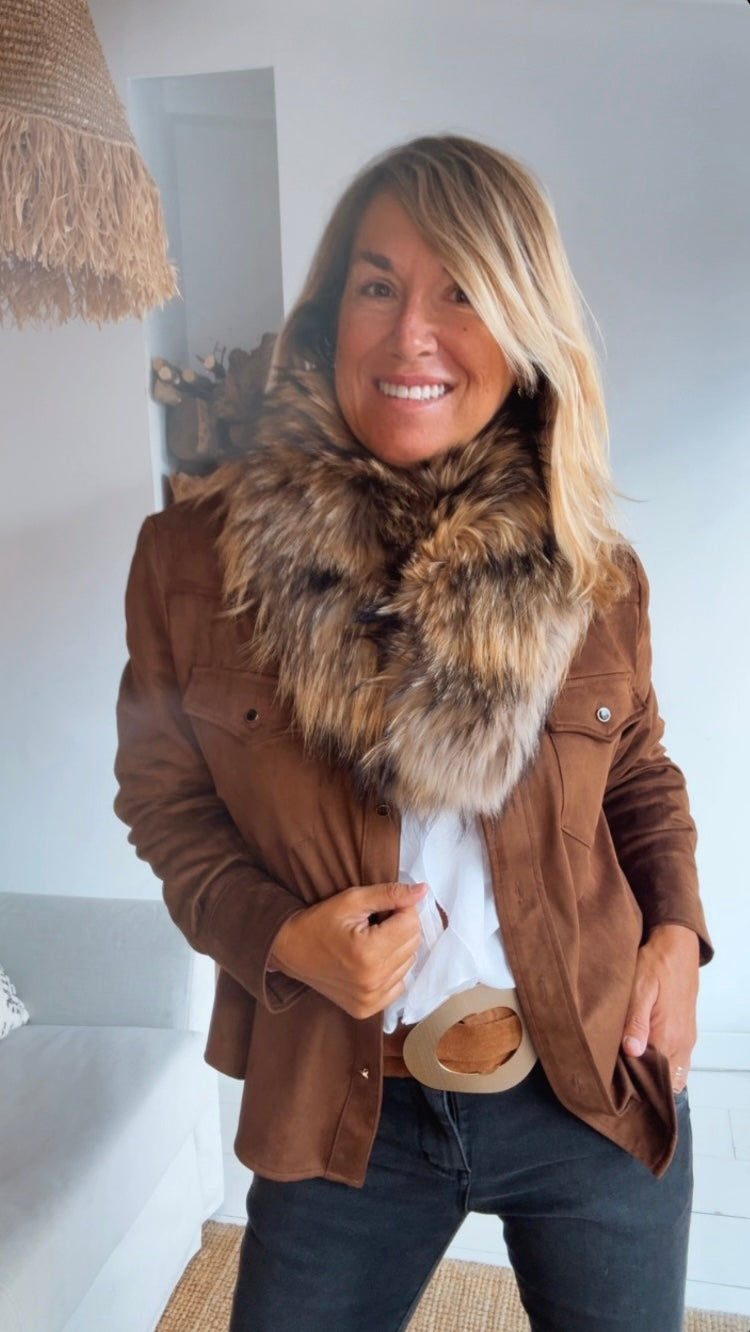 Cuello de pelo natural. Forro en la parte inferior. Cierre mediante una pinza.