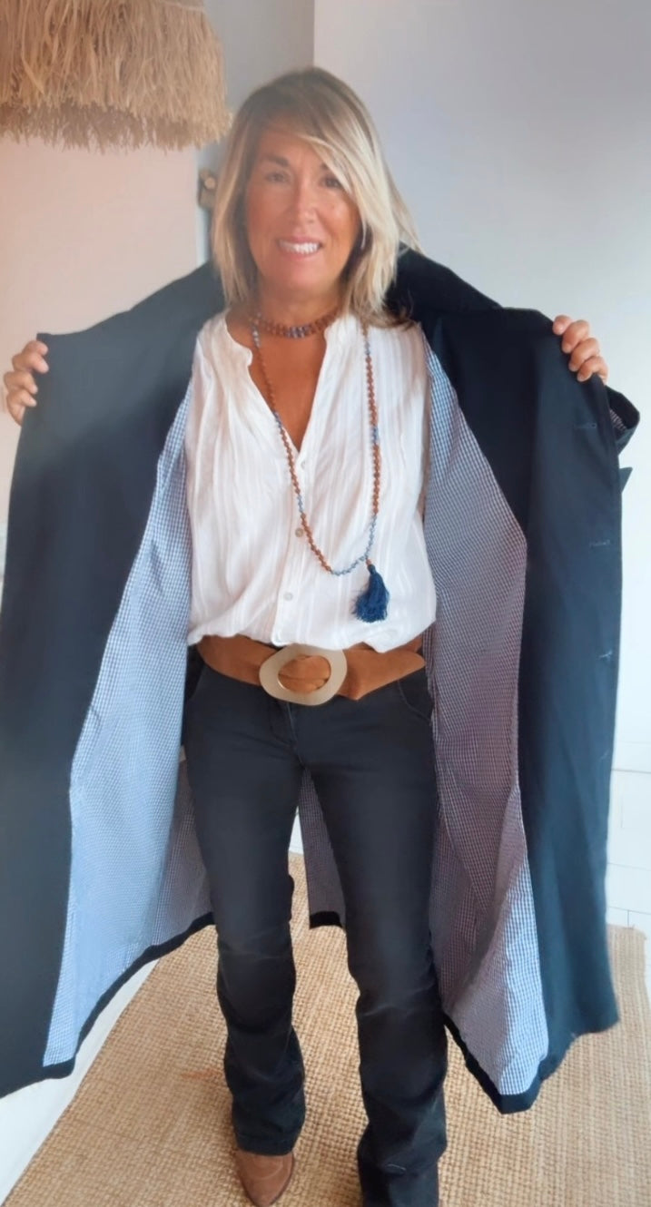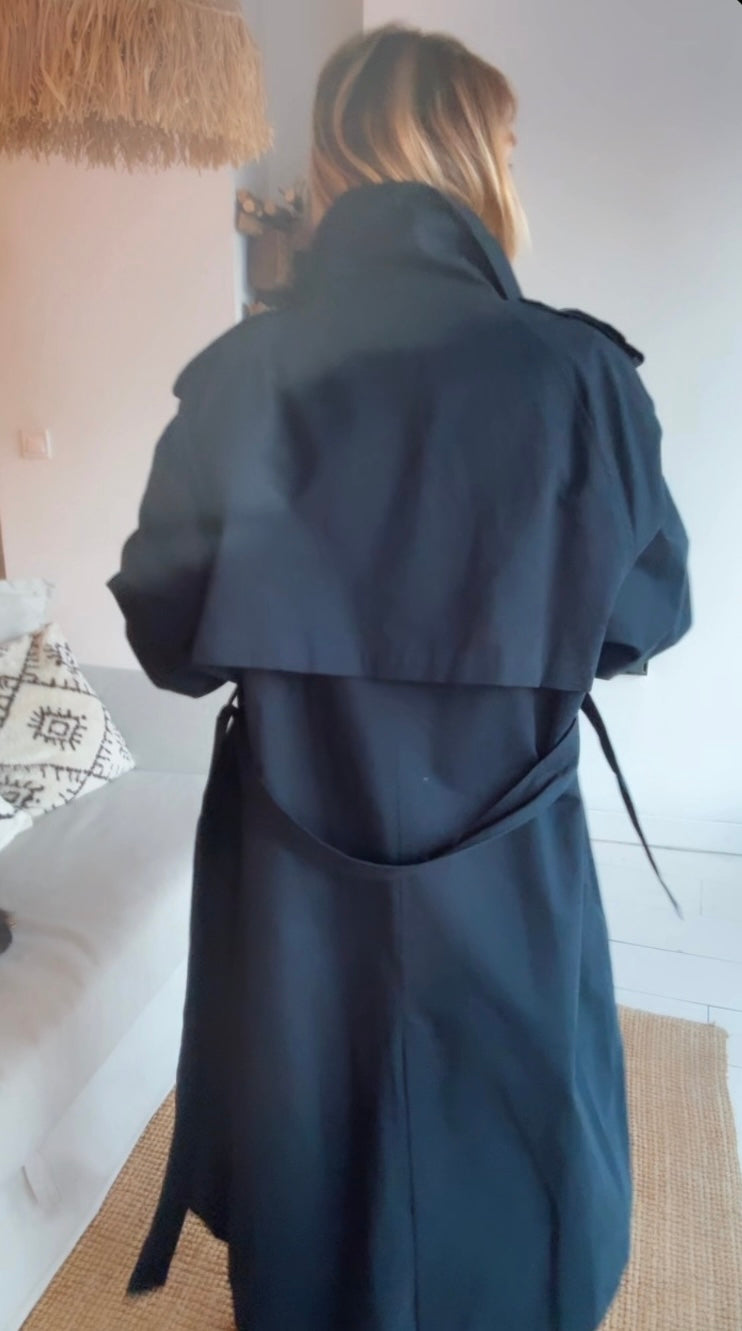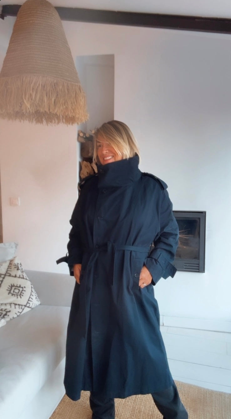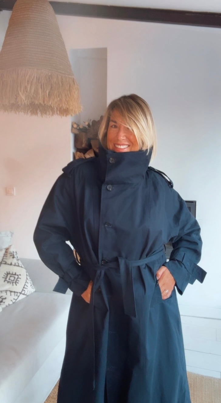 Gabardina larga marino. Corte recto y largo. Cuello alto. Cierre frontal de abotonadura visible con botones grandes. Bolsillos diagonales. Incluye cinturón a juego para ajustar a la cintura.