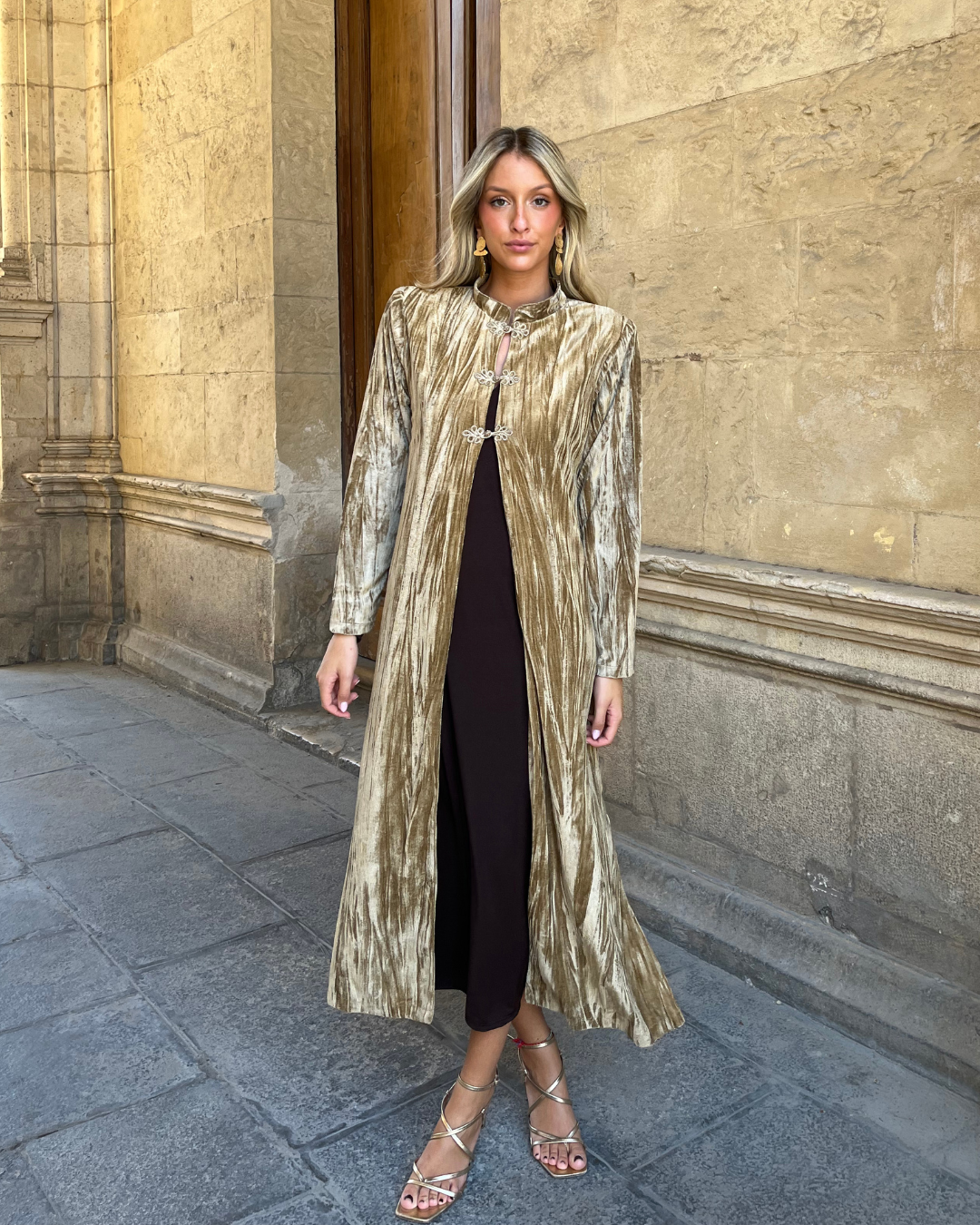 Kimono largo. Corte recto con acabado brillante. Cuello mao y cierre frontal con dos alamares florales decorativos. Manga larga recta. Abertura delantera central sin cierre completo
