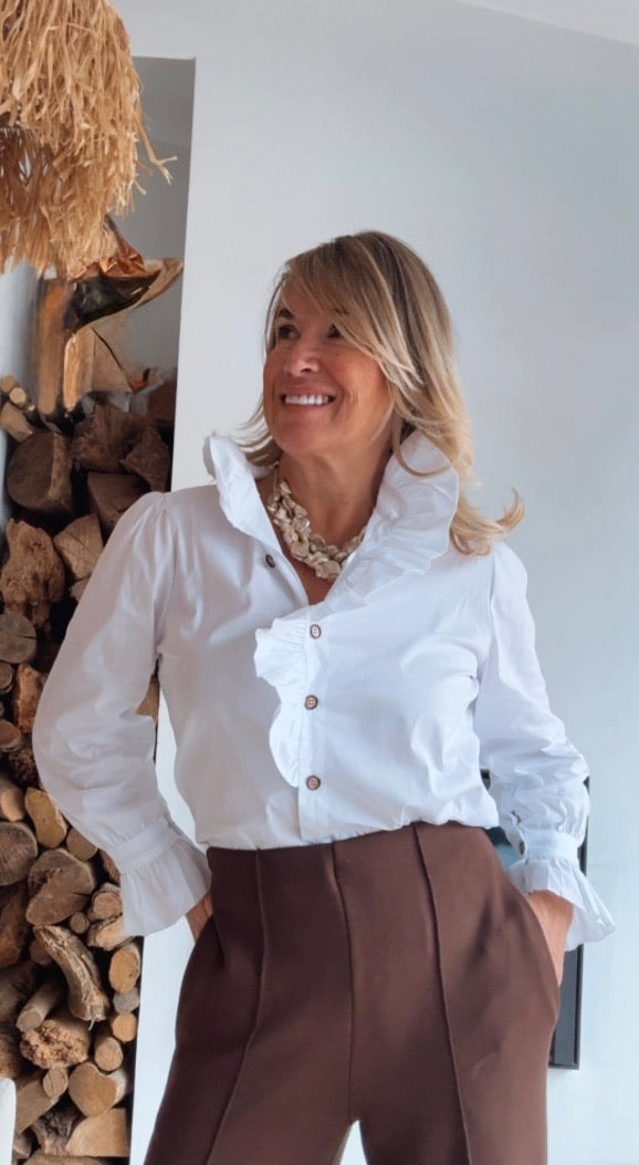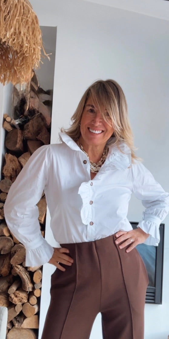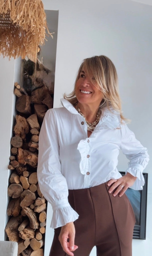 Camisa de manga larga. Cuello camisero alto con volante. Cierre frontal con botones. Tapeta frontal con volante. Mangas con puños con volante.