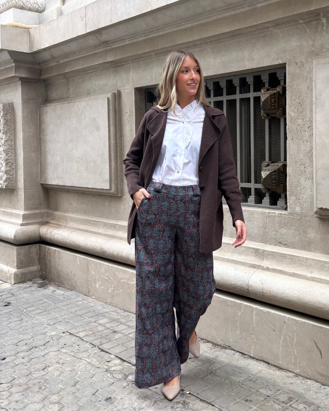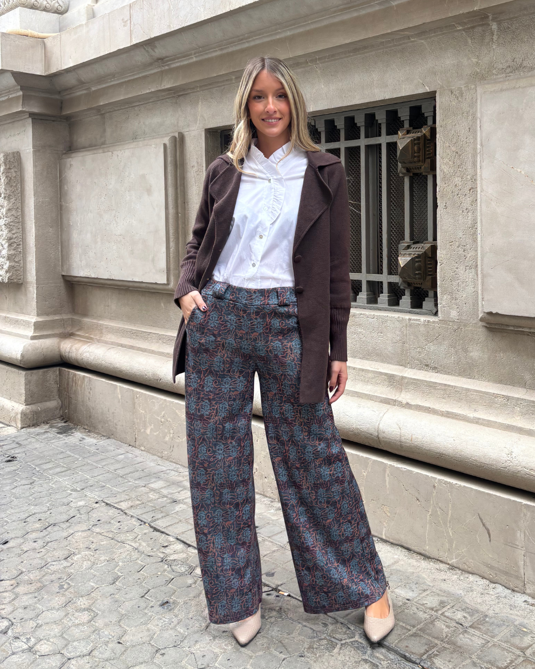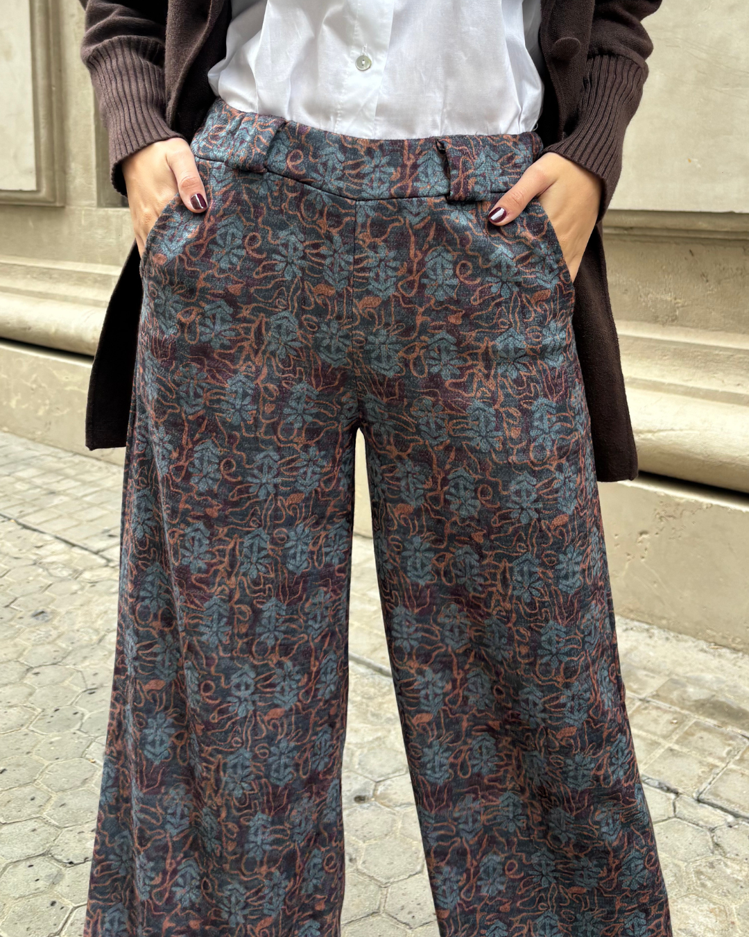 Pantalón de tiro medio-alto Caída amplia. Cintura de goma elástica. Sin cierre frontal. Dos bolsillos laterales.