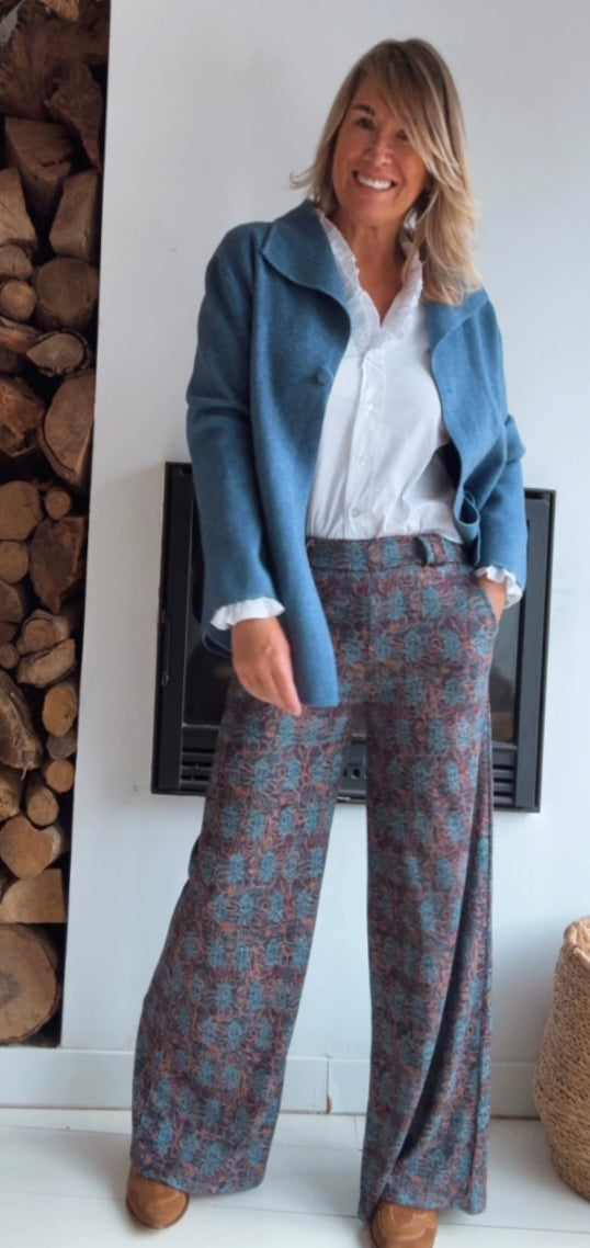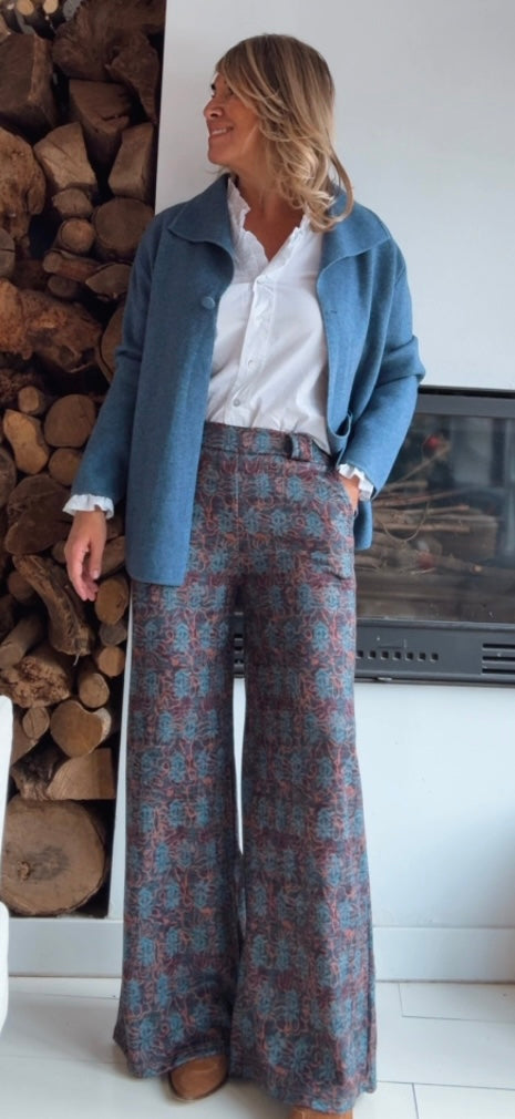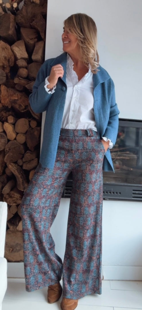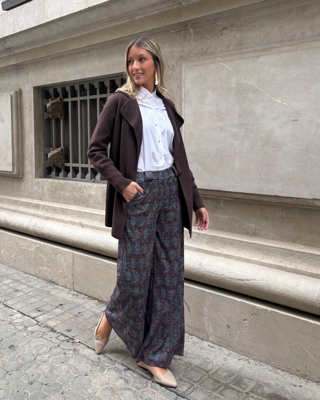 Pantalón de tiro medio-alto Caída amplia. Cintura de goma elástica. Sin cierre frontal. Dos bolsillos laterales.