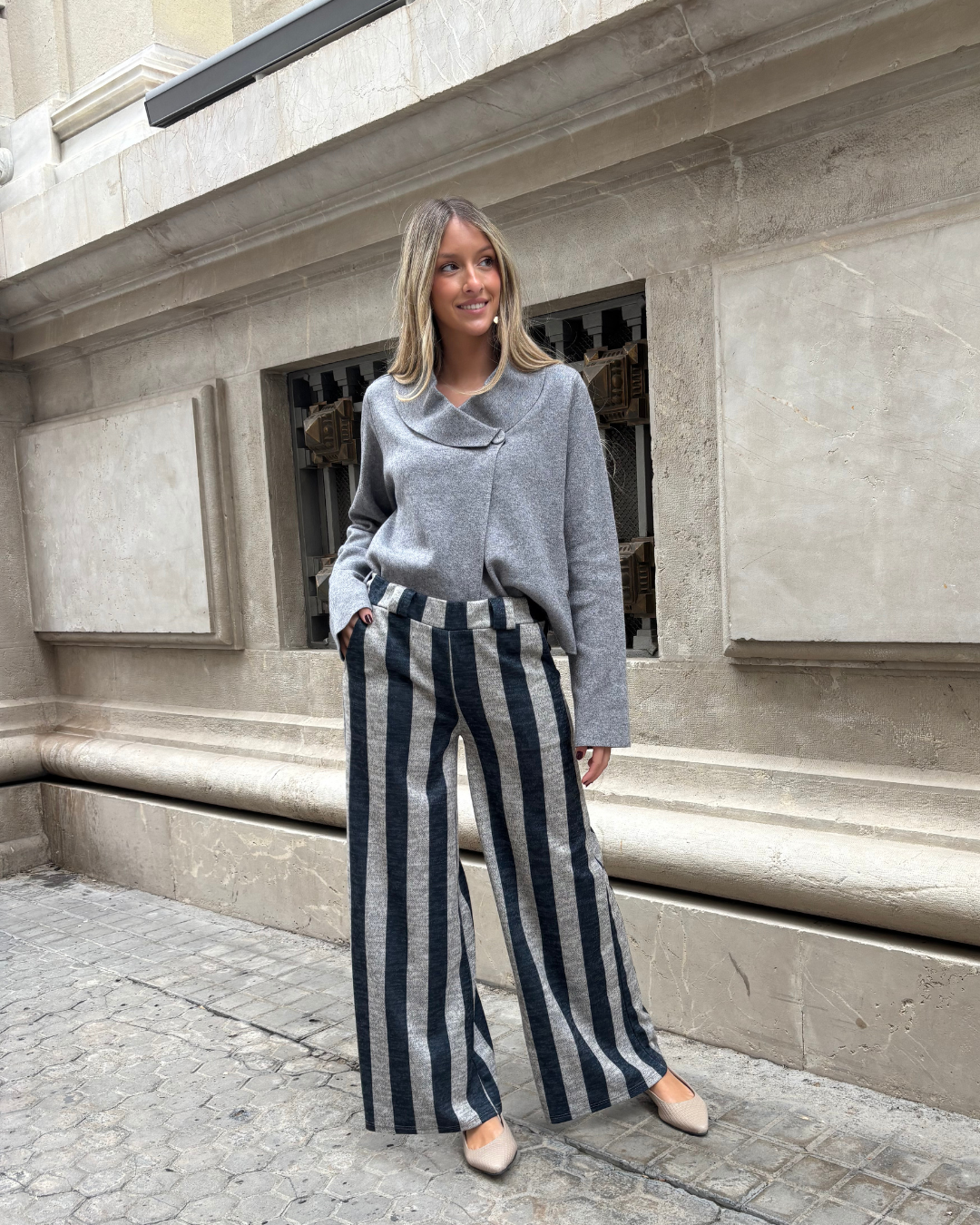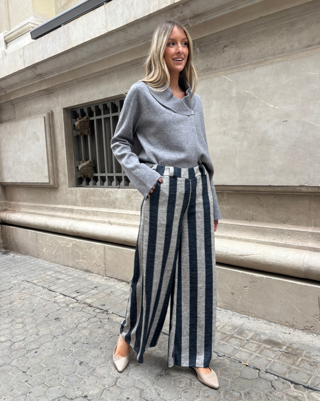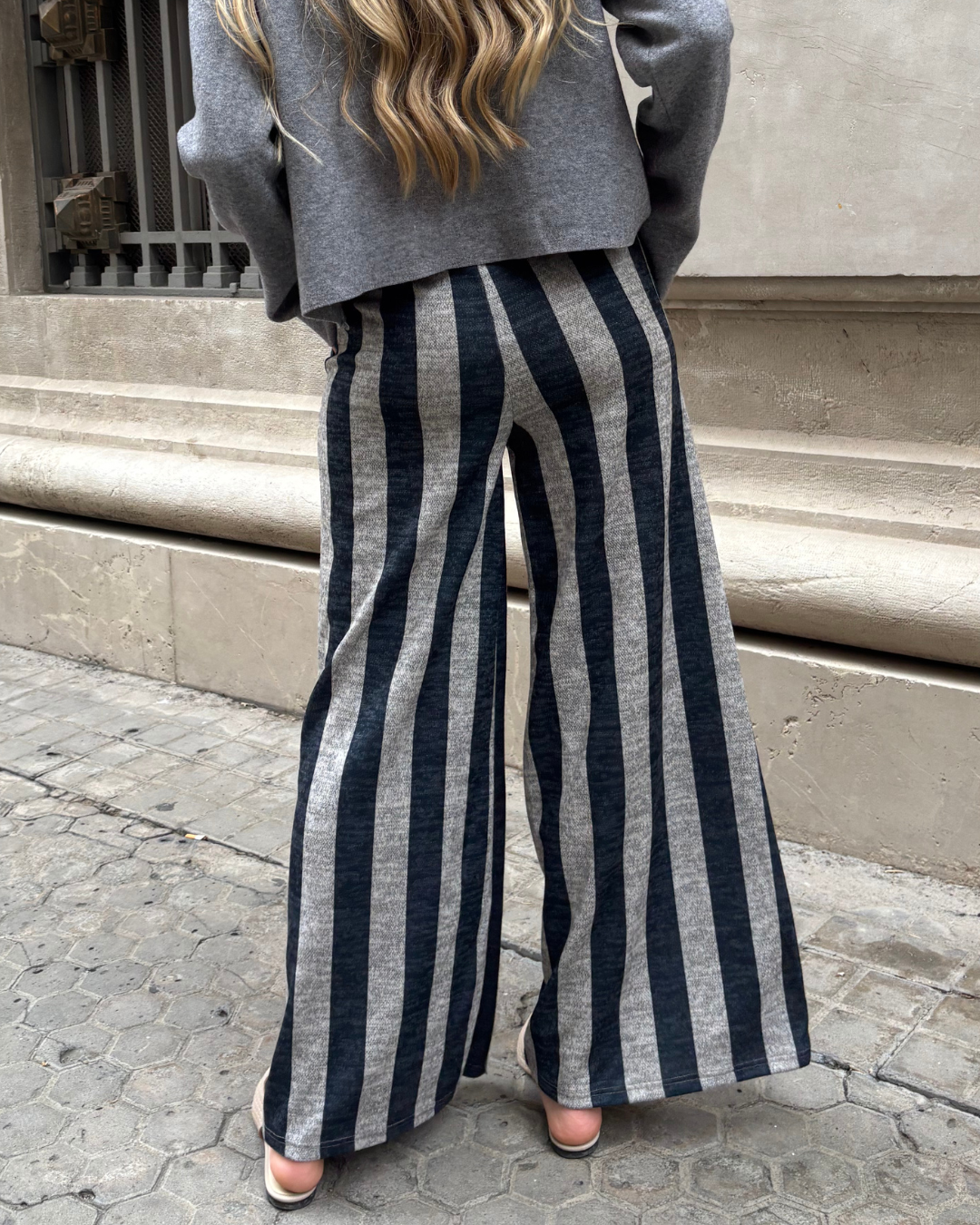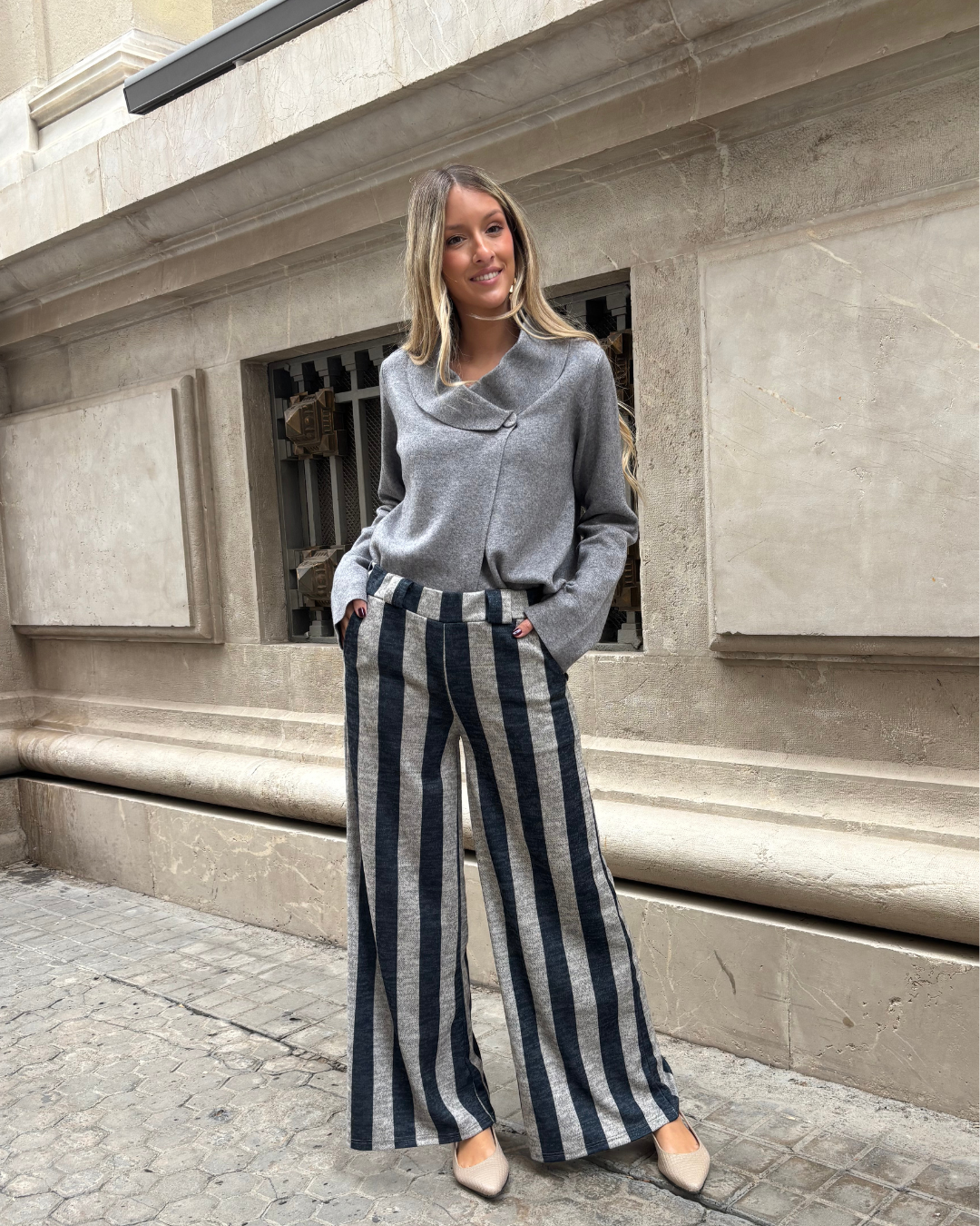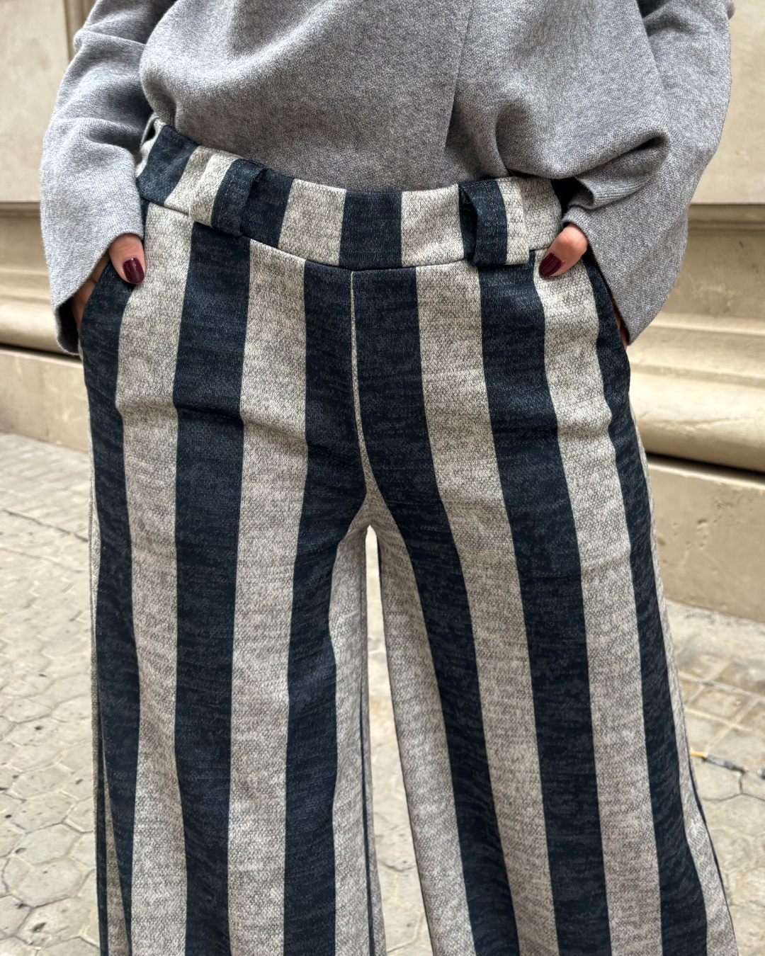 Pantalón largo de tiro medio-alto. Cintura de goma elástica con trabillas para cinturón. Sin cierre frontal. Corte ancho desde cadera. Dos bolsillos laterales.