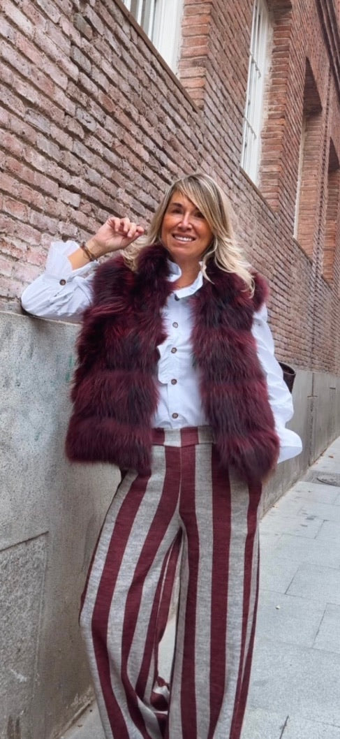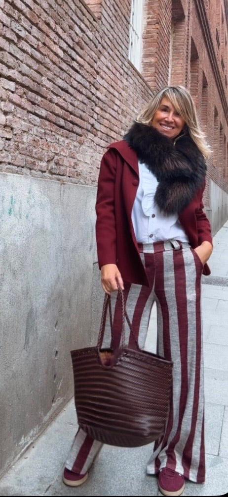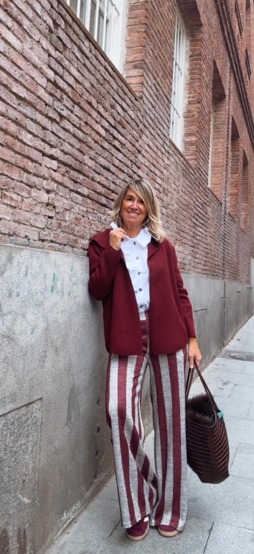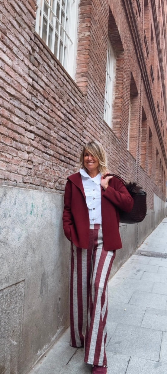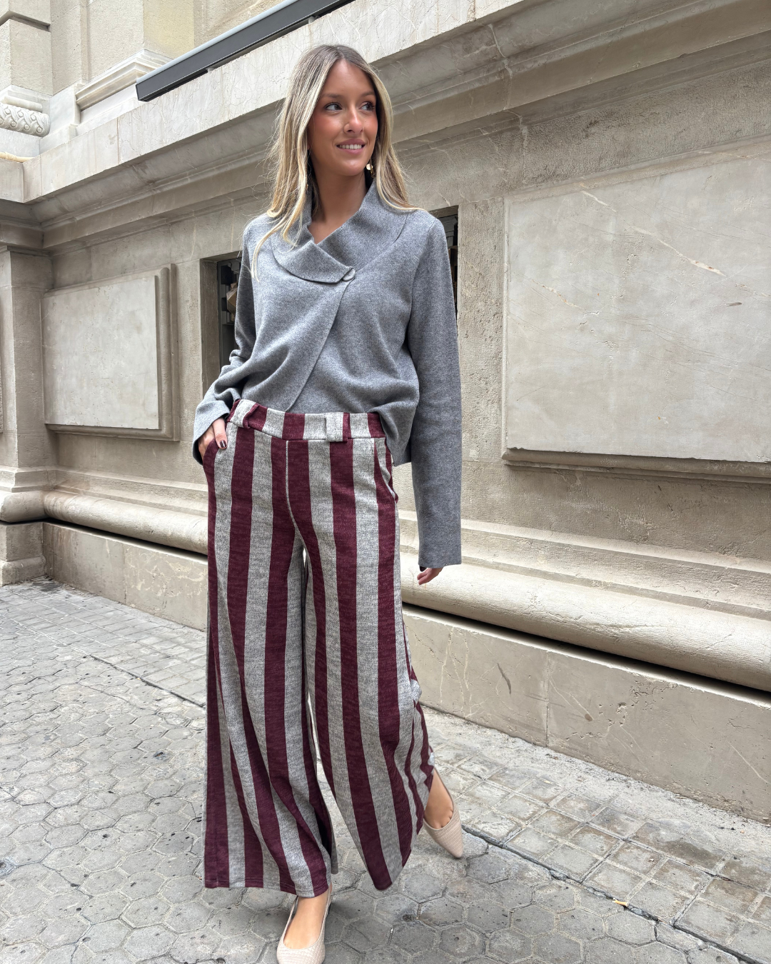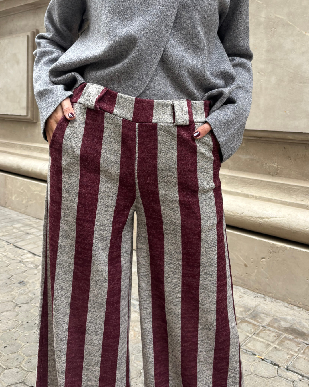 Pantalón largo de tiro medio-alto. Cintura de goma elástica con trabillas para cinturón. Sin cierre frontal. Corte ancho desde cadera. Dos bolsillos laterales.