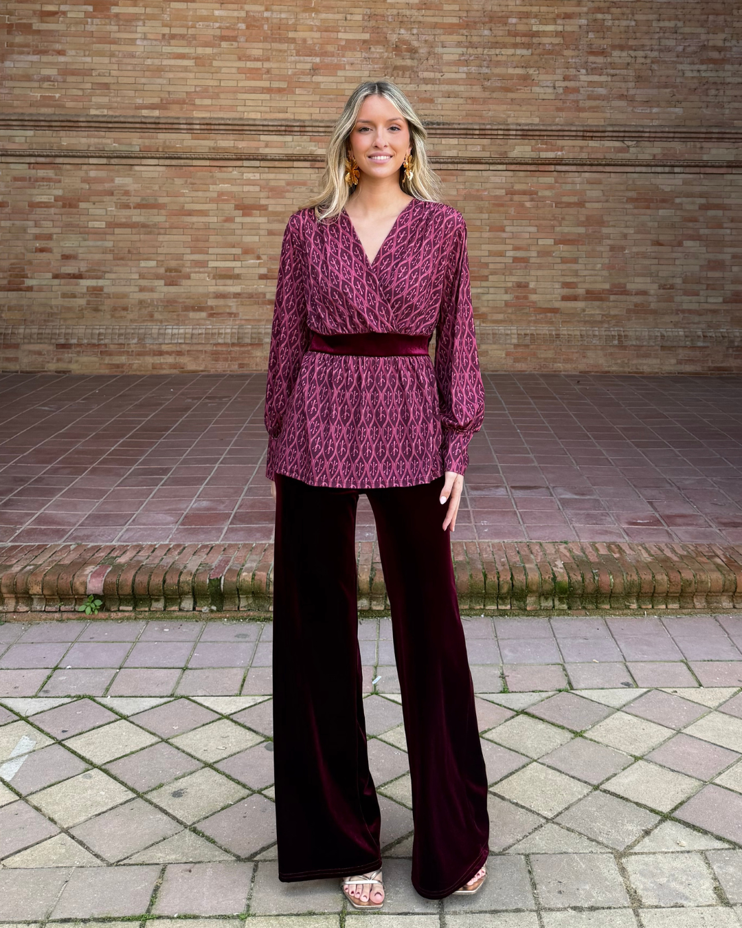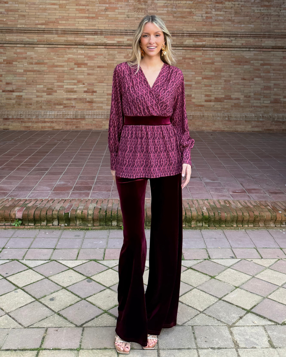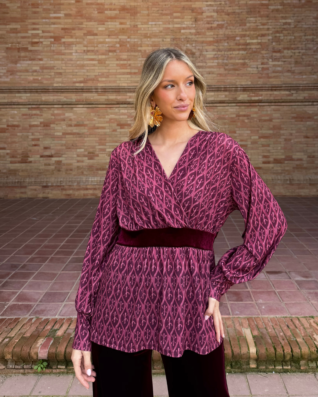 Blusa de tejido fluido con estampado geométrico, escote en V cruzado, manga larga con puño elástico y corte imperio con banda de terciopelo en cintura. Bajo ligeramente evasé.