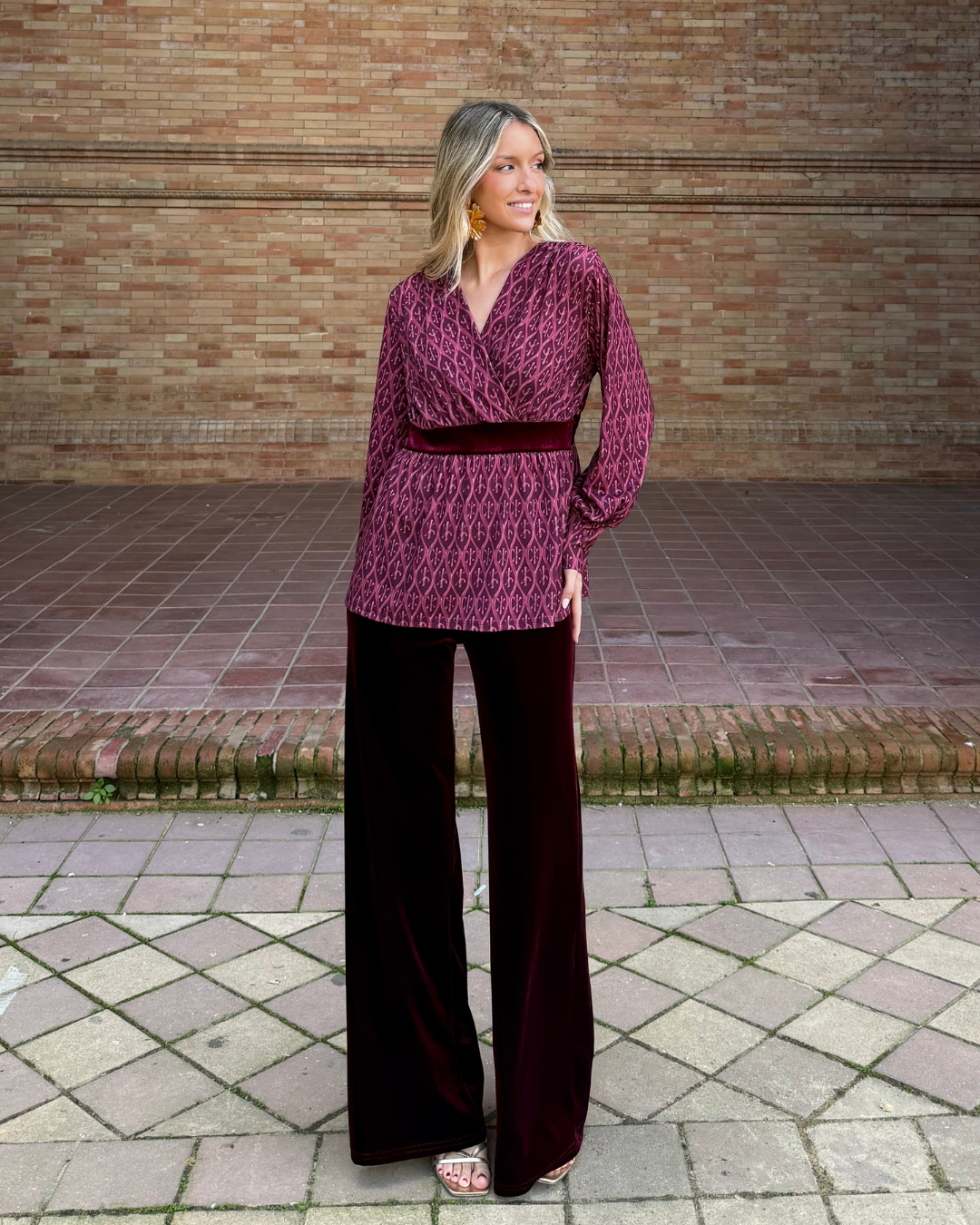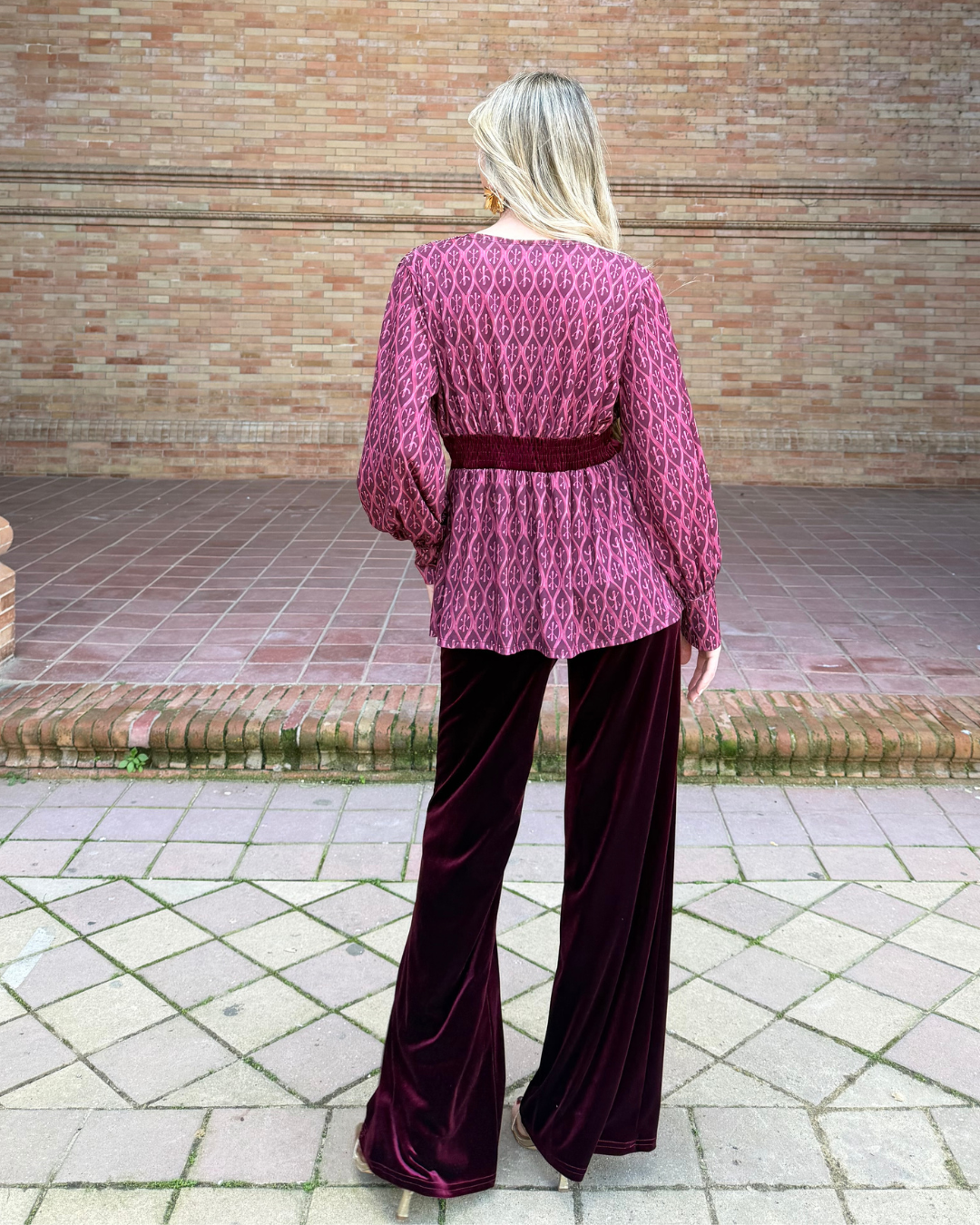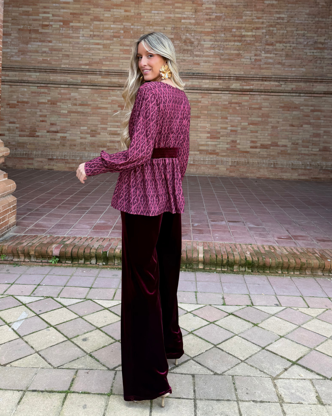 Blusa de tejido fluido con estampado geométrico, escote en V cruzado, manga larga con puño elástico y corte imperio con banda de terciopelo en cintura. Bajo ligeramente evasé.