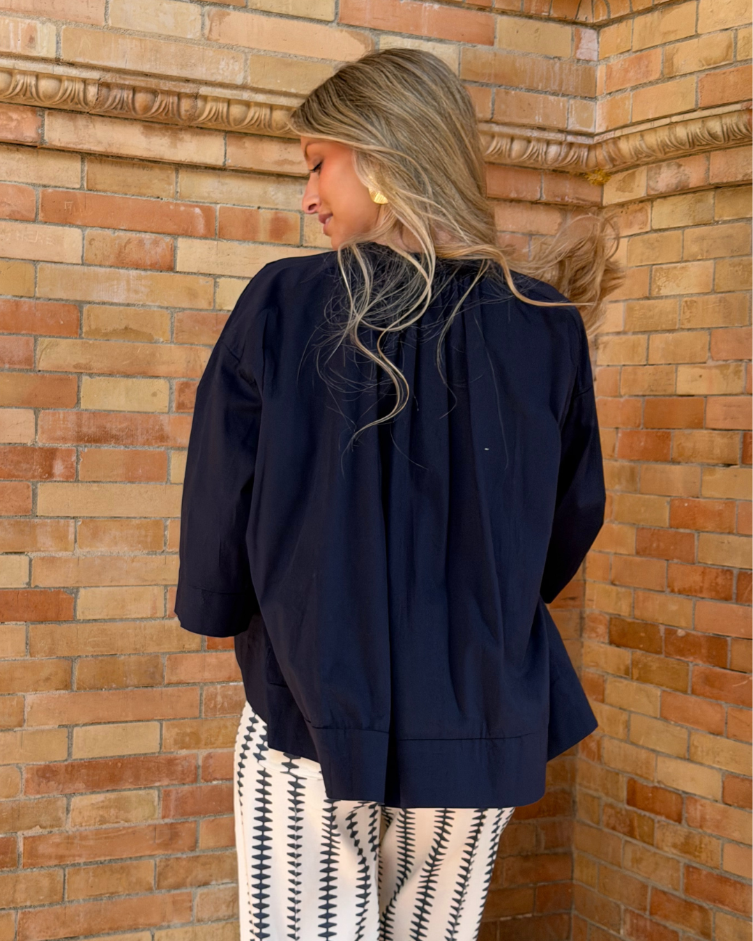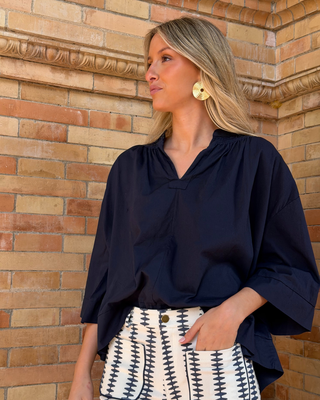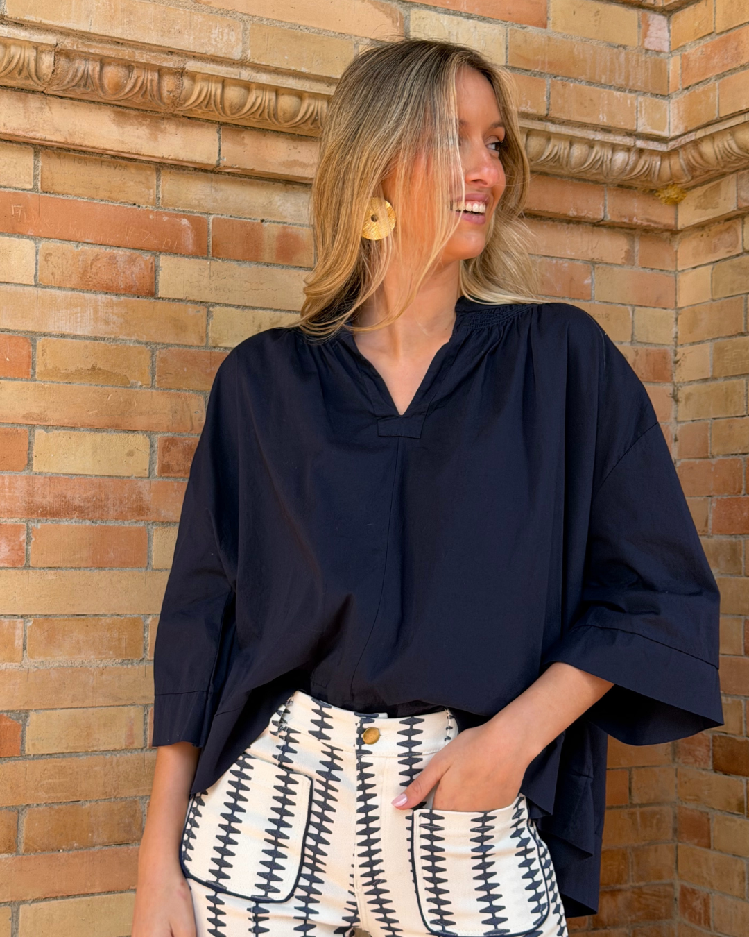 Blusa oversize de corte rectangular. Cuello redondo fruncido con abertura en V. Mangas 3/4. Tejido fluido.