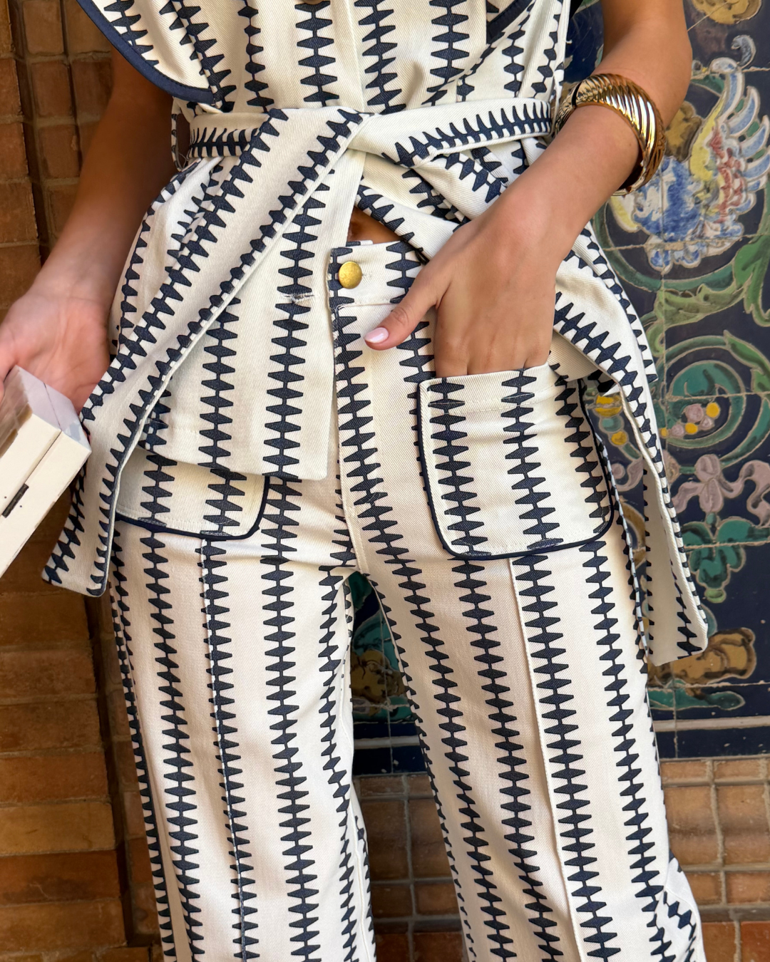 Diseño exclusivo disponible en color blanco crudo y estampado azul marino. 4 tallas disponibles.