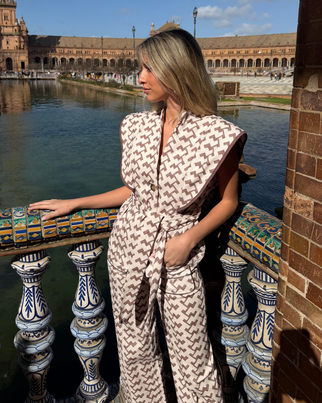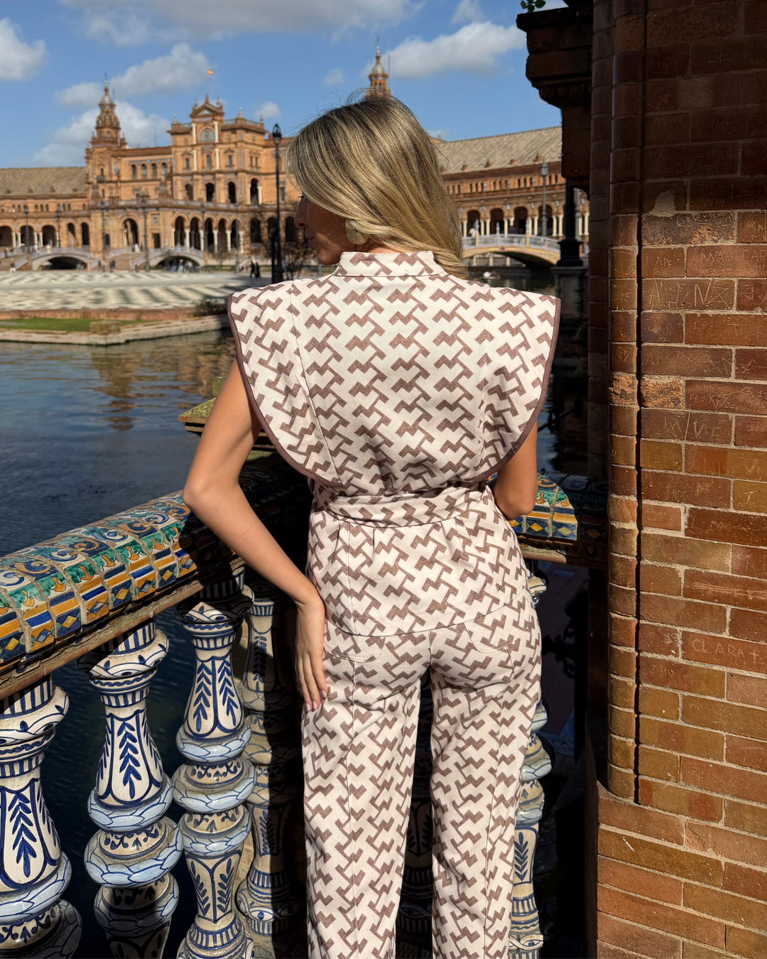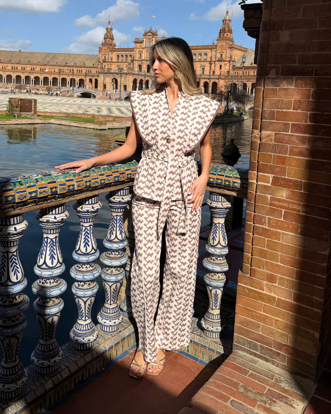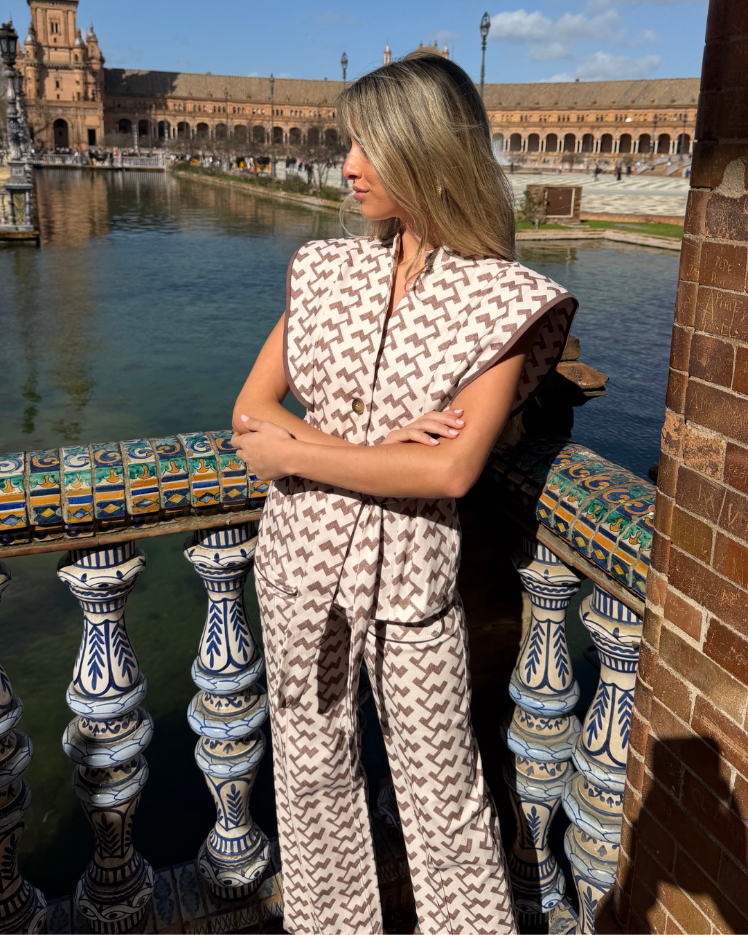 Diseño exclusivo disponible en estampado geométrico. Color blanco y marrón-taupe. 4 tallas disponibles.