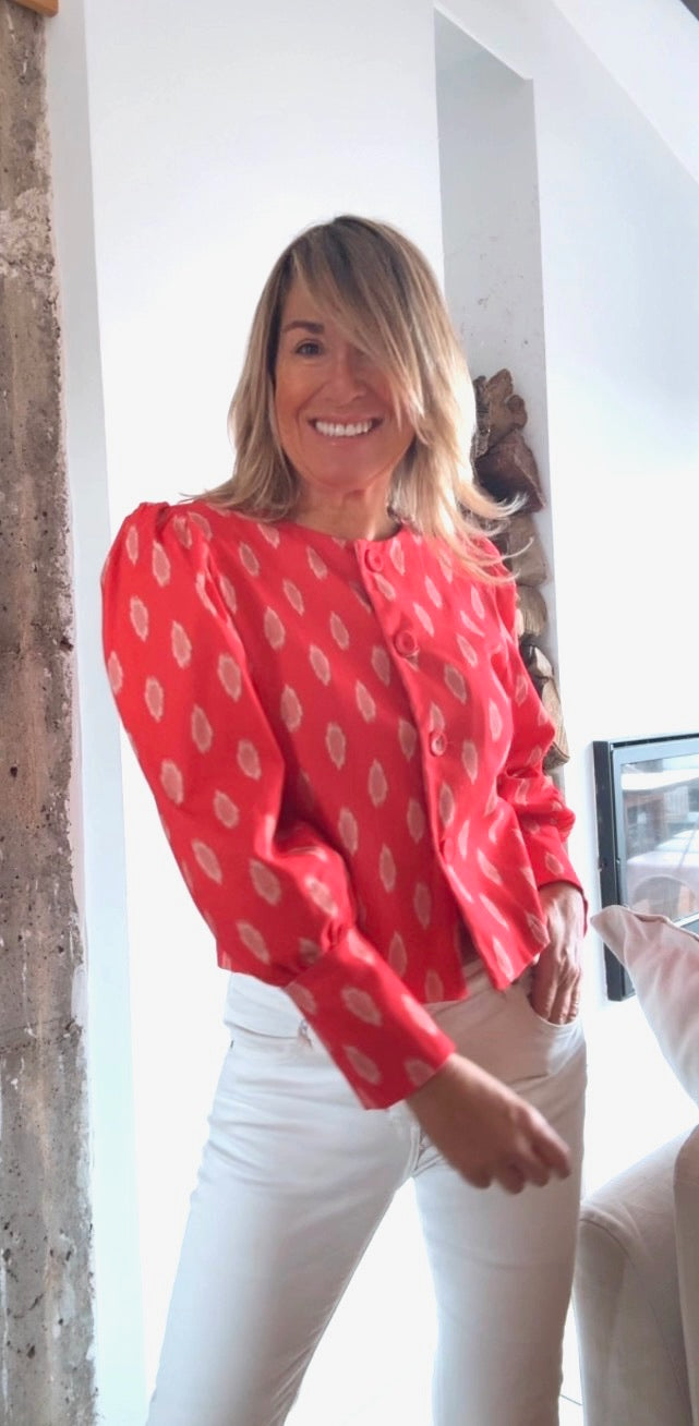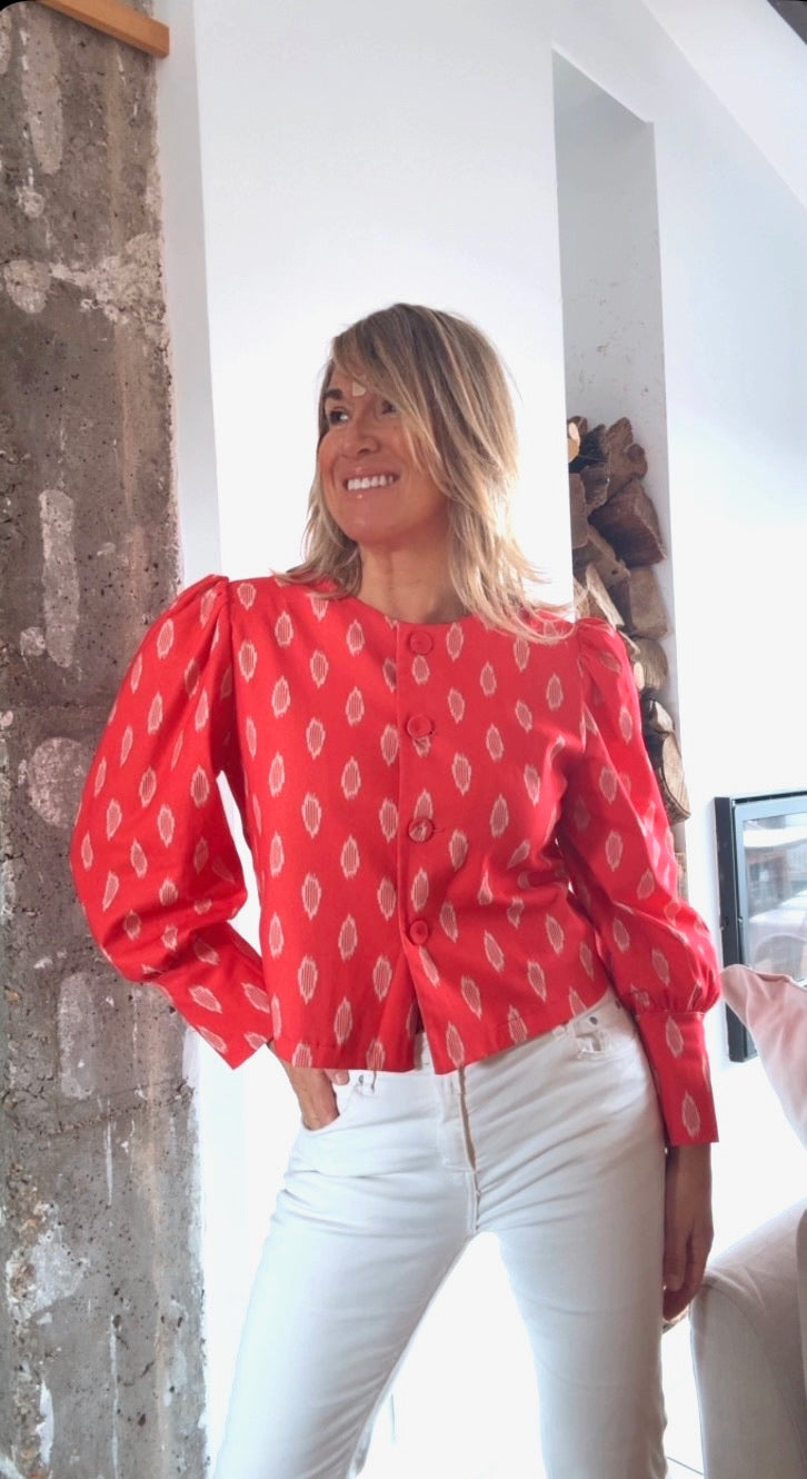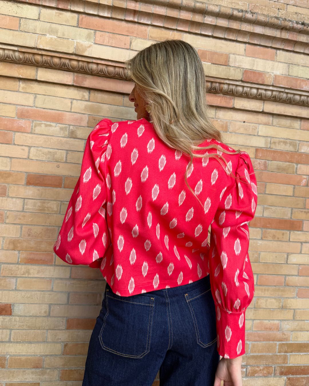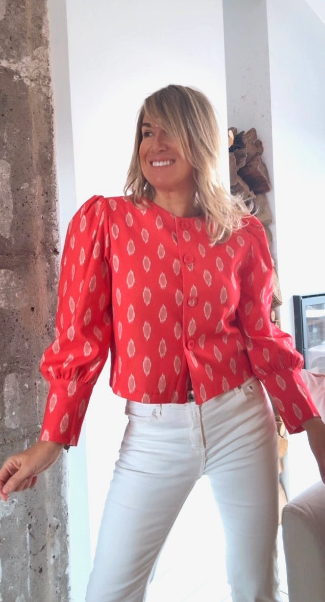 Chaqueta estampada abotonada. Cuello redondo. Diseño cropped con mangas abullonadas con hombreras. Puños ajustados sin botón, no elásticos.