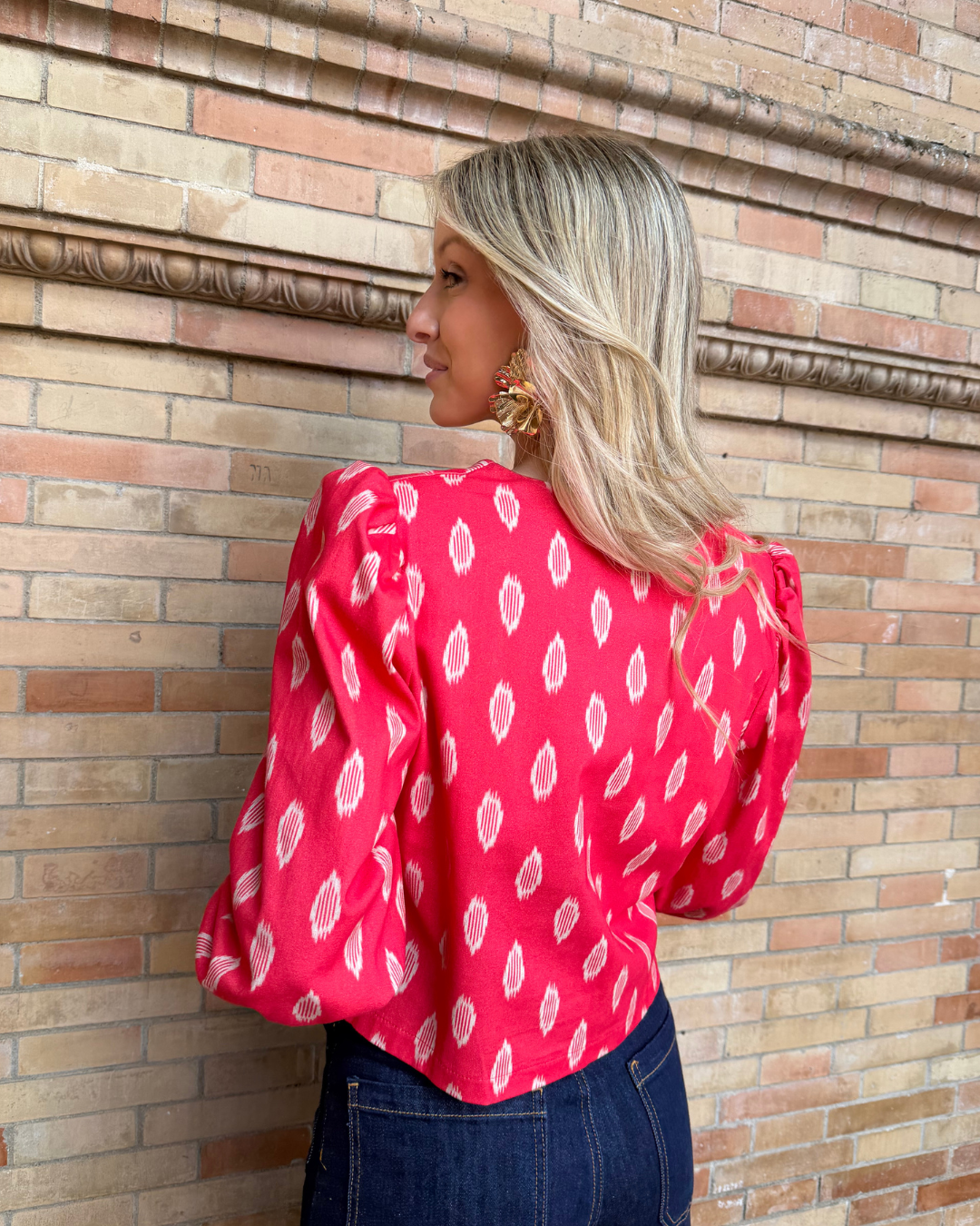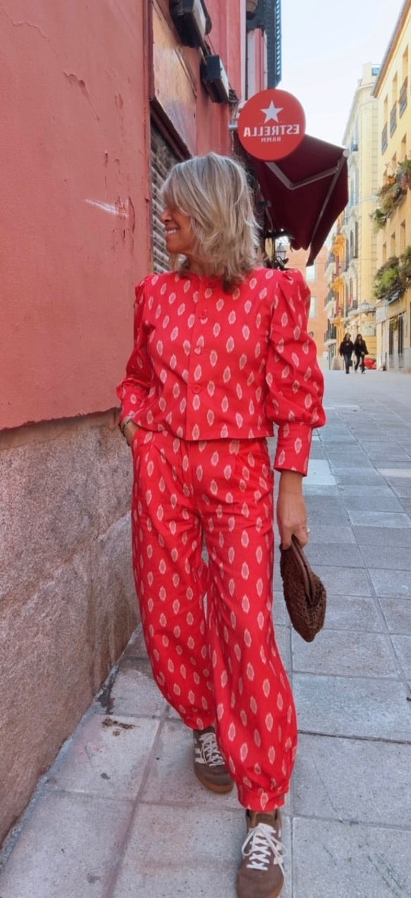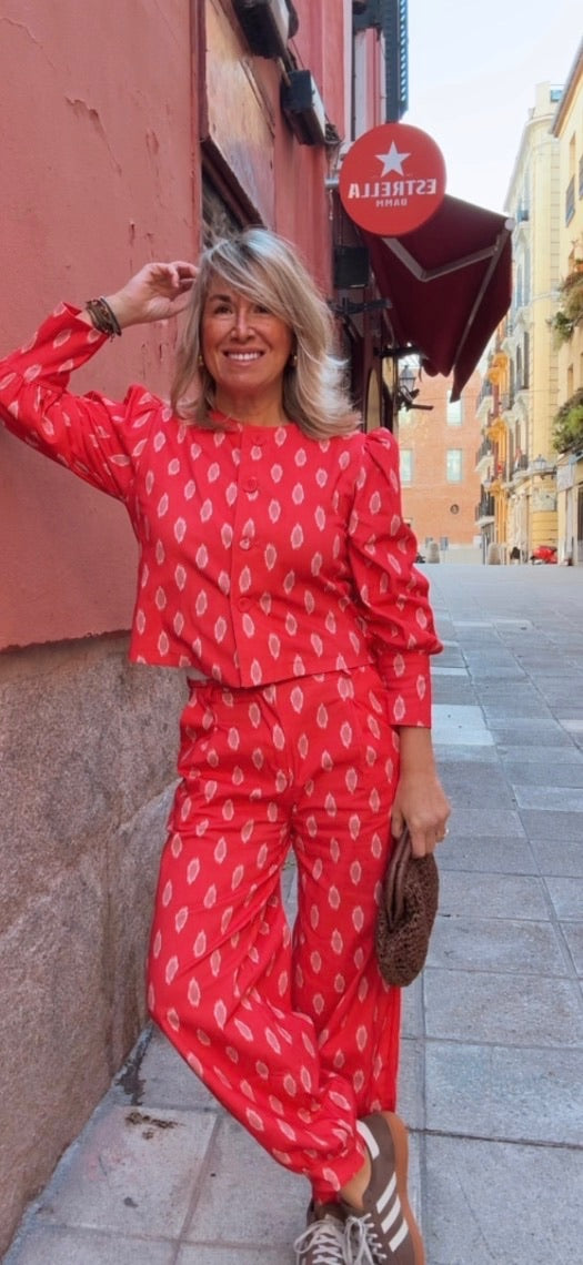 Diseño exclusivo en color rojo coral y estampado en patrón blanco. 3 tallas disponibles.