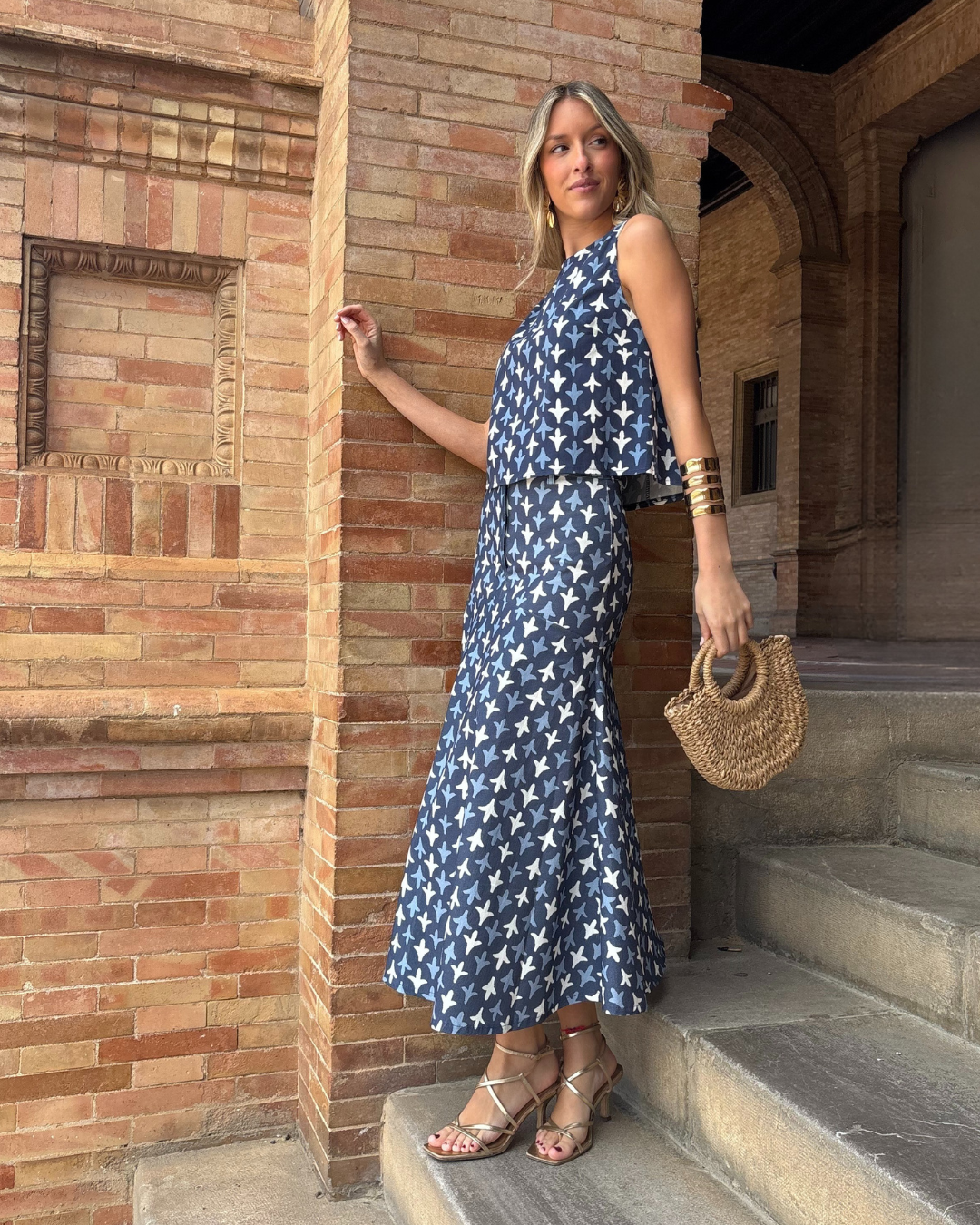 Modelo exclusivo disponible en azul marino y estampado de colores blanco y azul claro. 3 tallas disponibles.