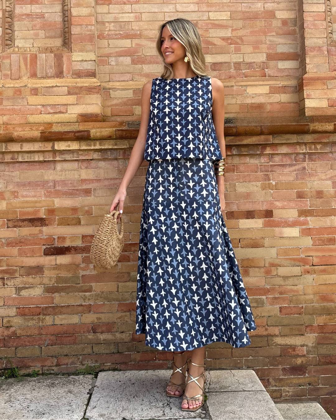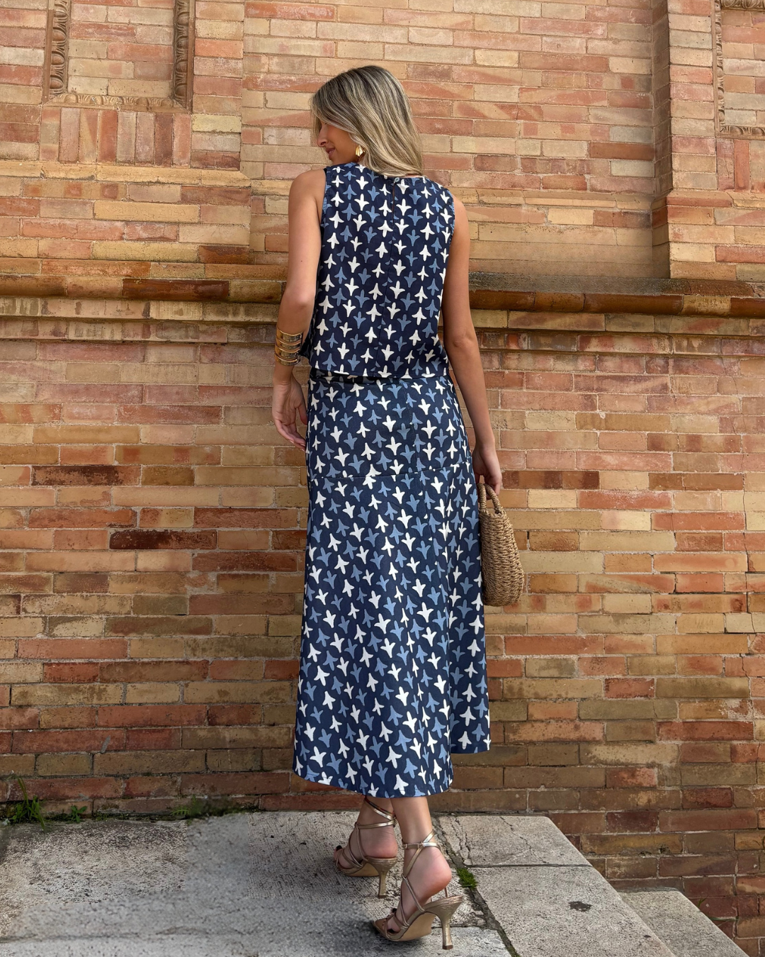 Top estampado confeccionado en tejido elástico y ligero. Cuello redondo con cierre de botón trasero.