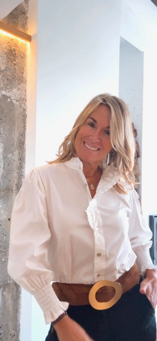 Camisa de manga larga. Cuello clásico. Cierre abotonado frontal y puño. Fruncidos en cuello y tapeta. Corte recto.