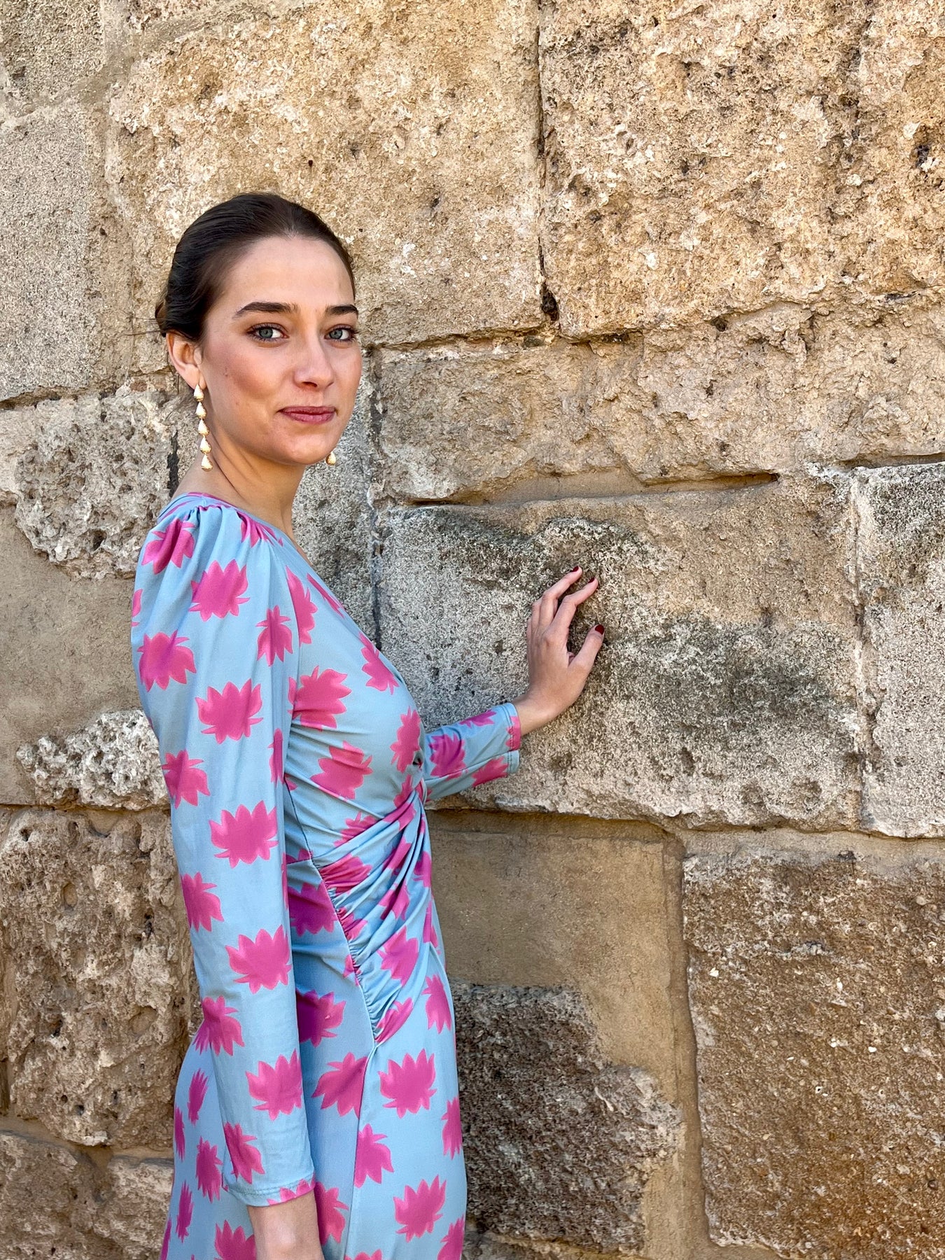 Queda claro que nos gusta estilizar la figura y conseguir un efecto "vientre plano" y es por ello que nuestro diseño consigue nuestro propósito. Una pieza de patrón largo con abertura delantera. Mangas largas y escote pronunciado en V sobre un drapeado cruzado súper estiloso. Además, tiene hombreras, así que multiplicamos estilo y realzamos nuestra figura, consiguiendo marcar nuestros hombros.