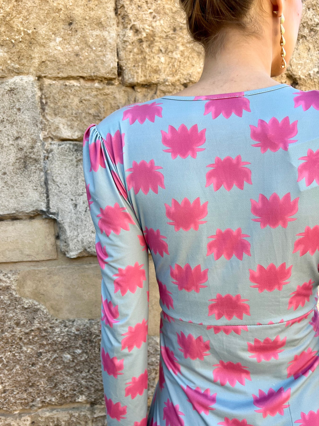 Diseño exclusivo en color azul grisáceo y estampado de patrón floral en rosa. Tejido suave y elástico. Tallas de S a XL.