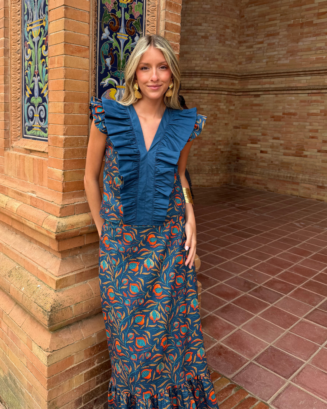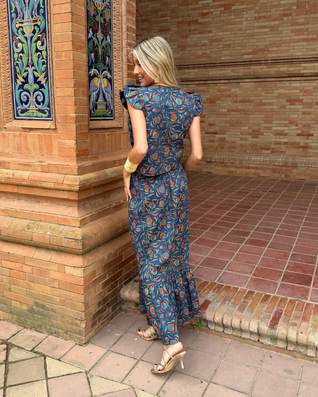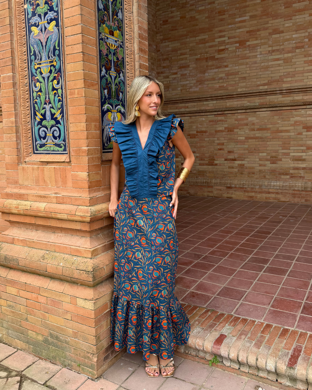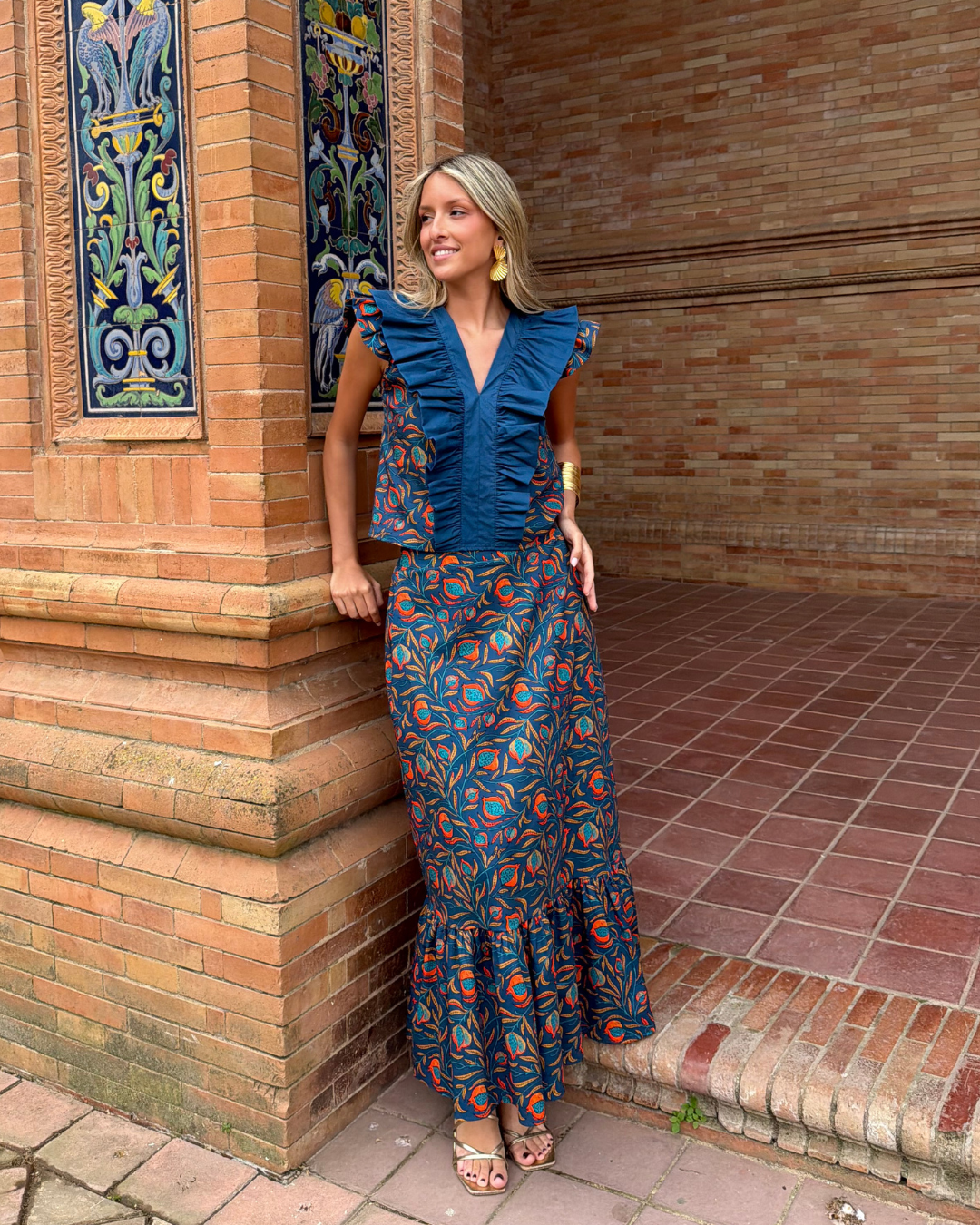 Falda midi estampada. Corte evasé con cintura ajustada con goma elástica trasera. Volante fruncido en parte inferior.