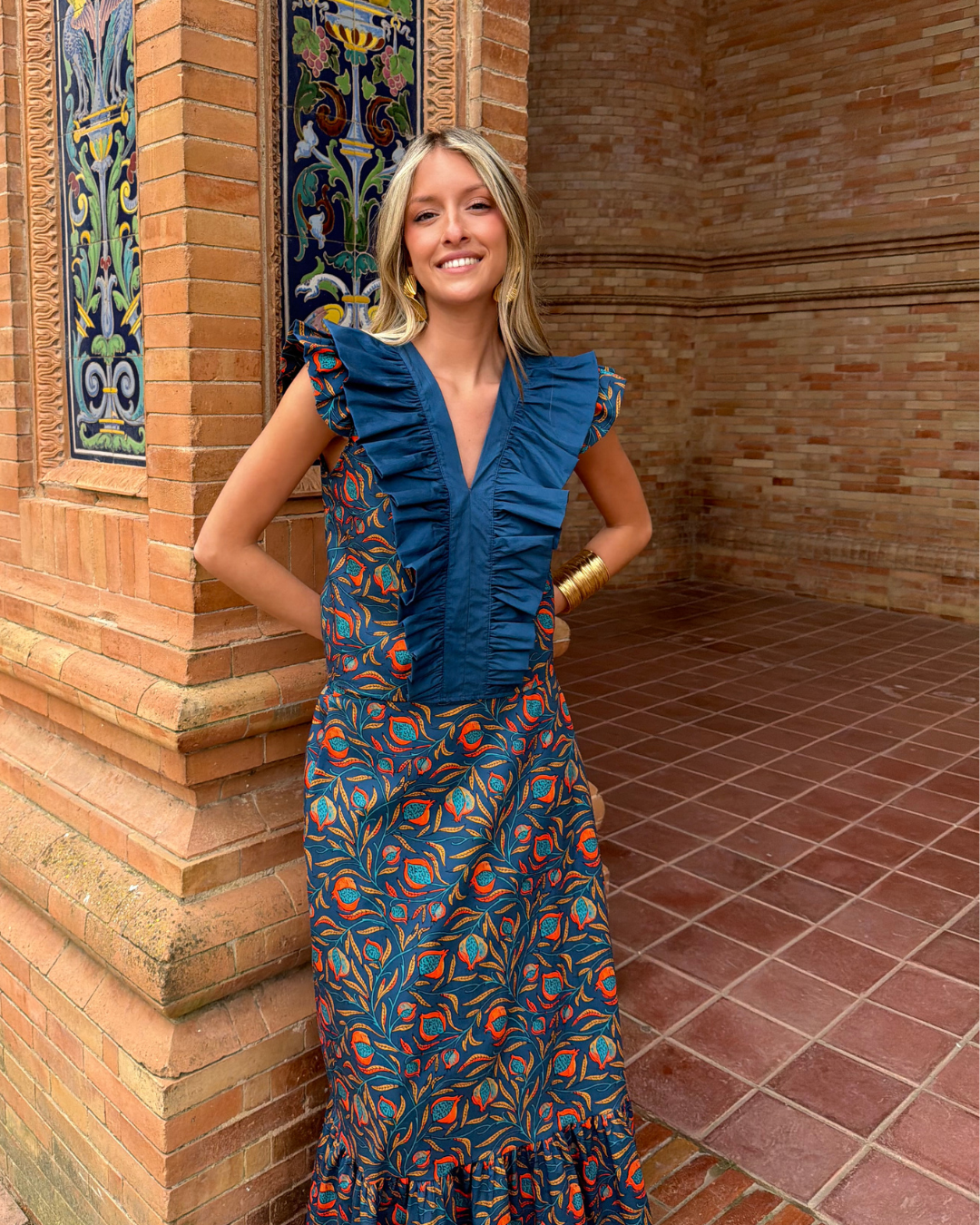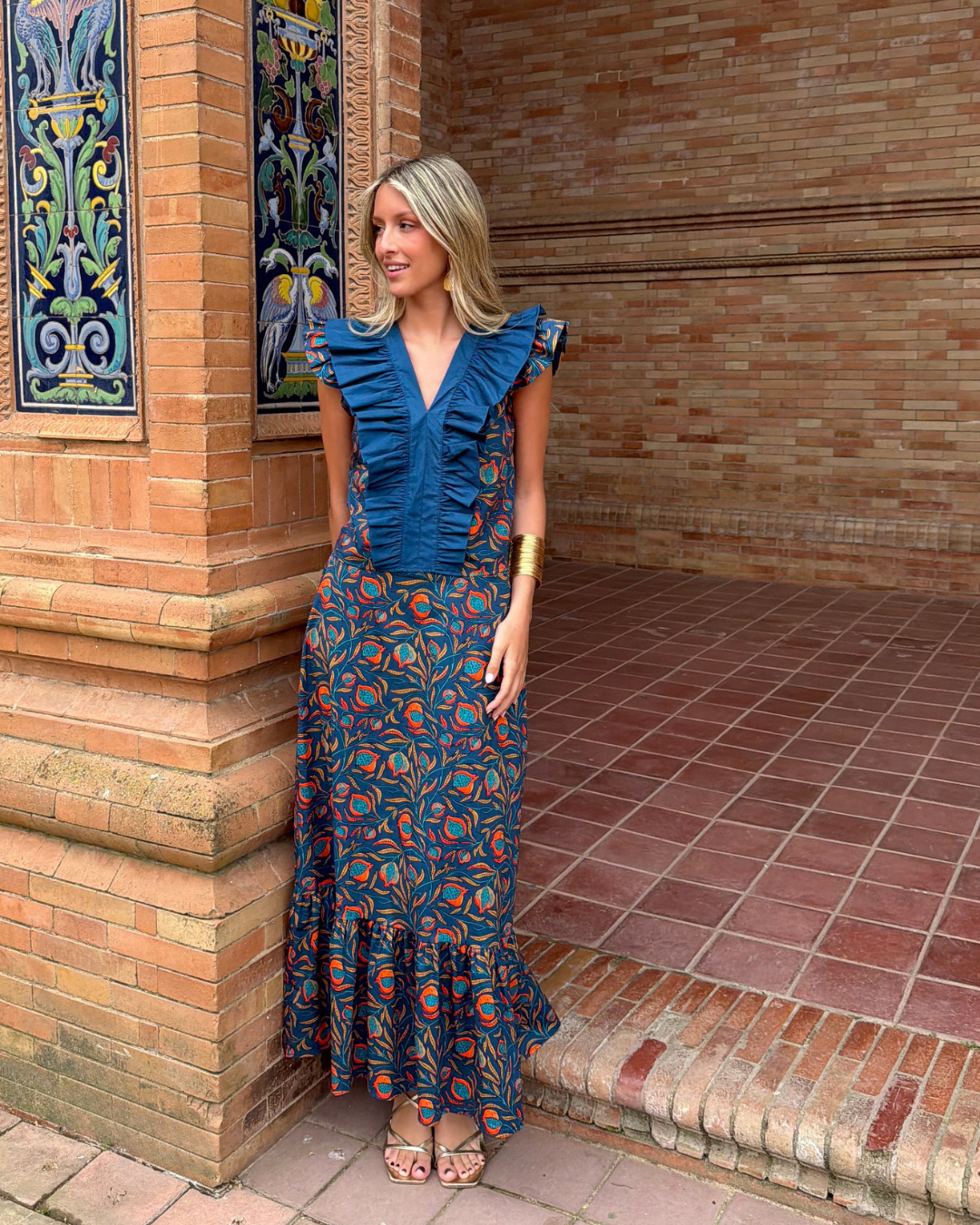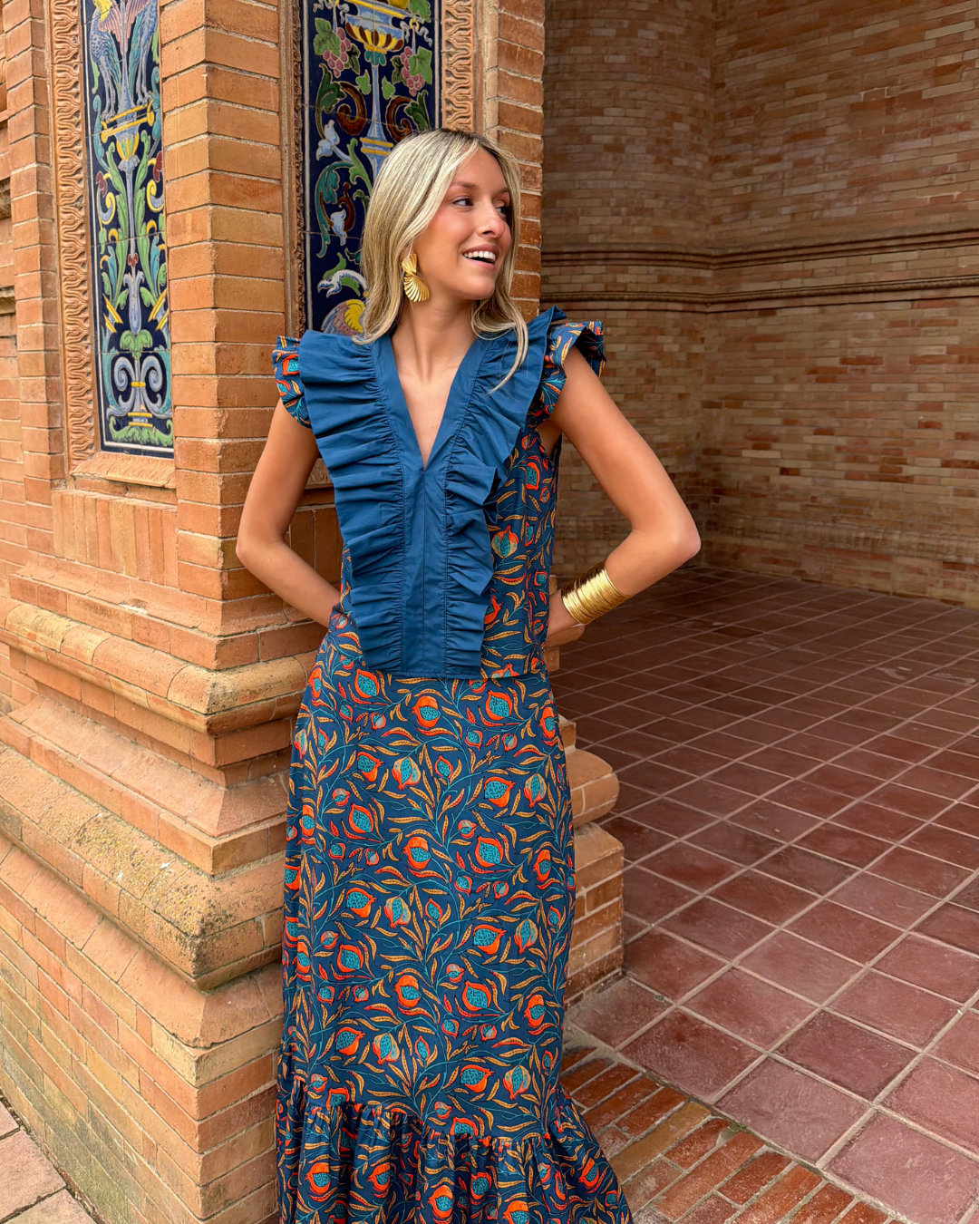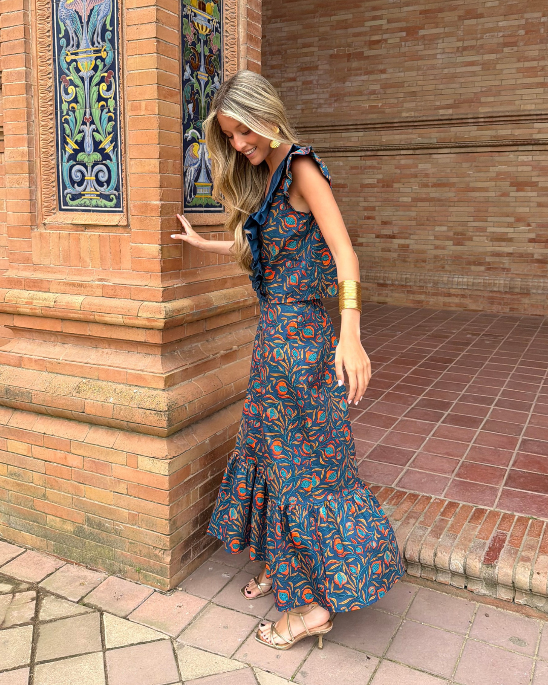 Falda midi estampada. Corte evasé con cintura ajustada con goma elástica trasera. Volante fruncido en parte inferior.