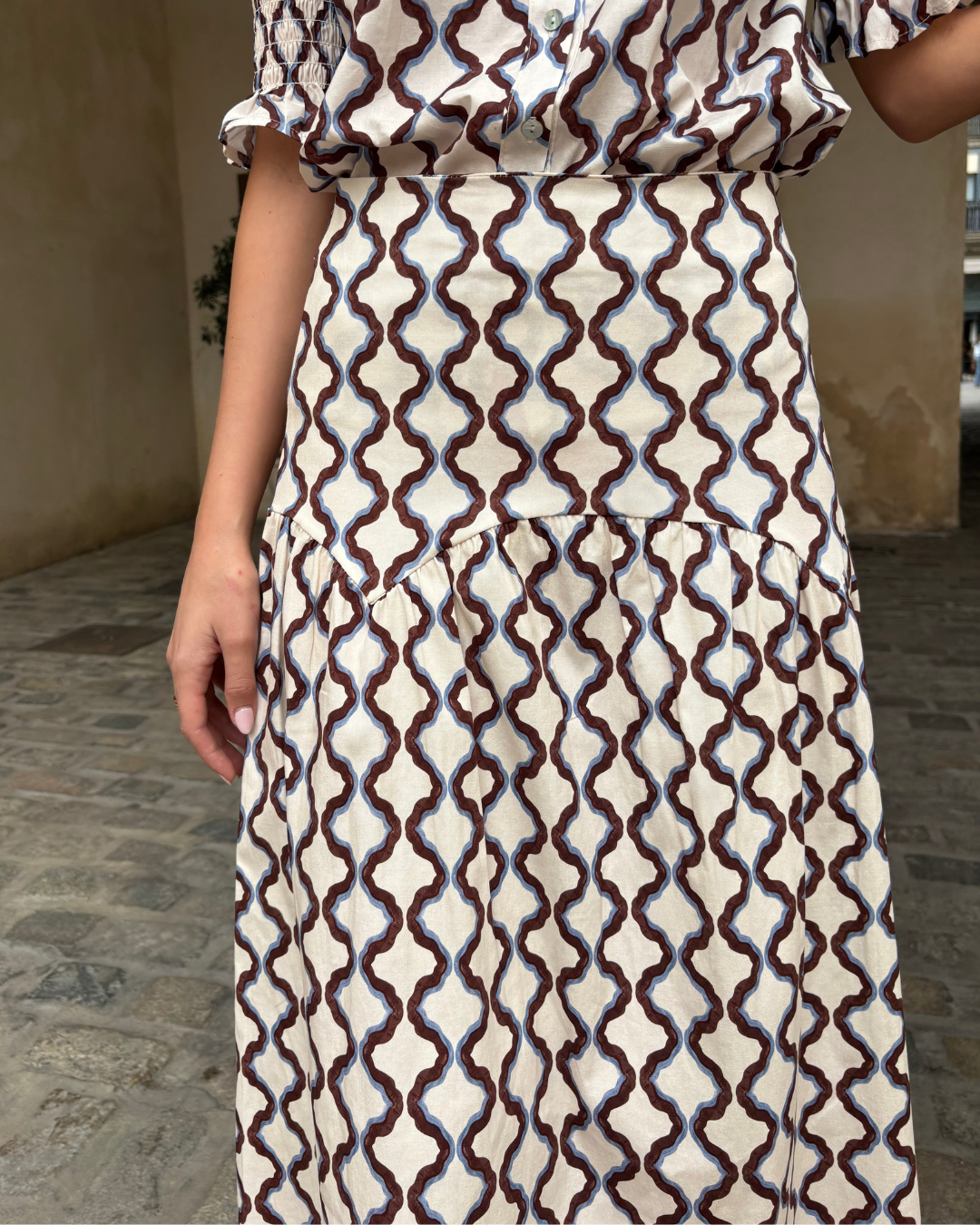 Falda midi de corte ligeramente evasé, confeccionada con cintura alta y ajustada con cierre de cremallera.