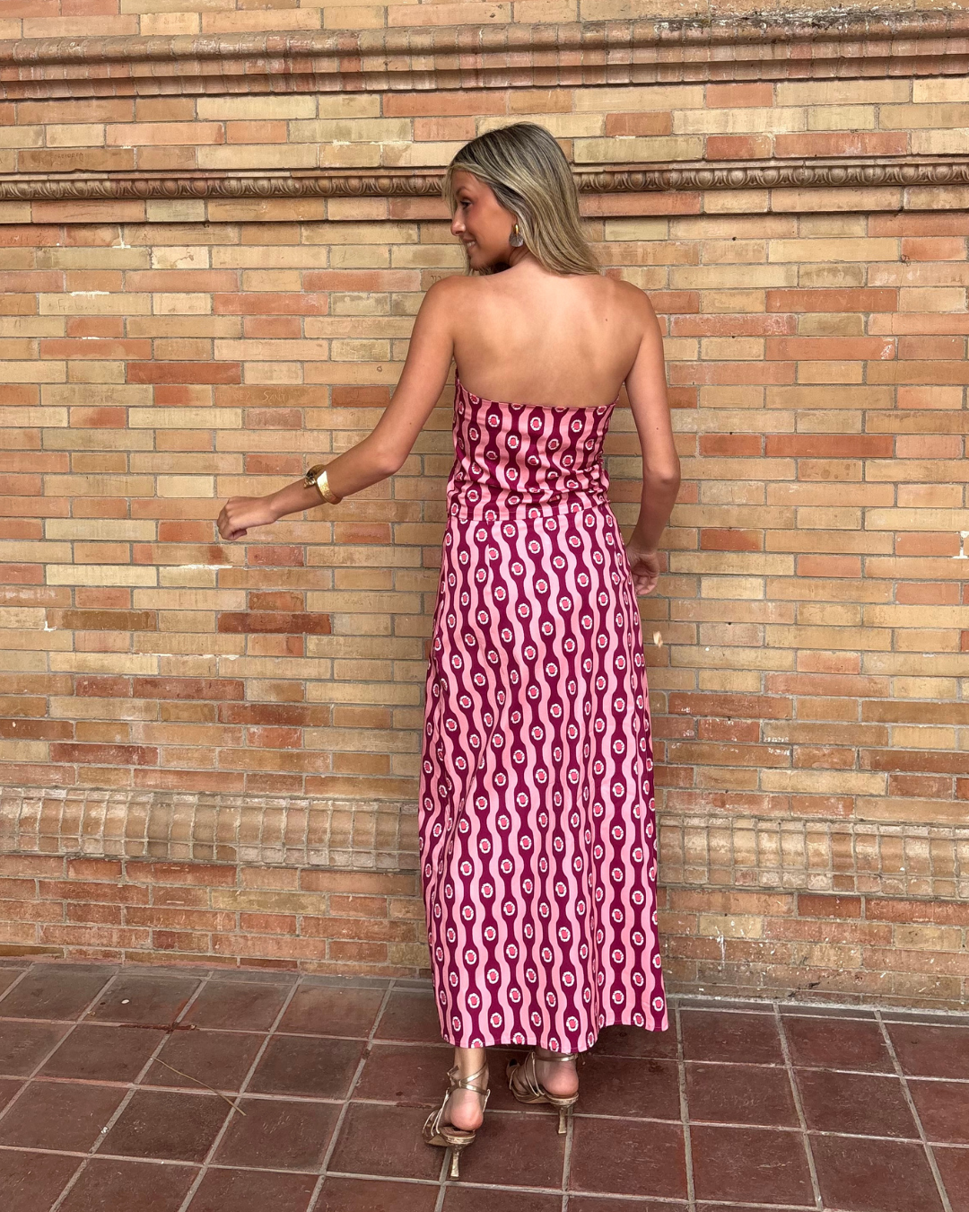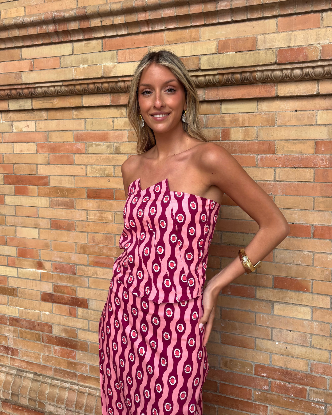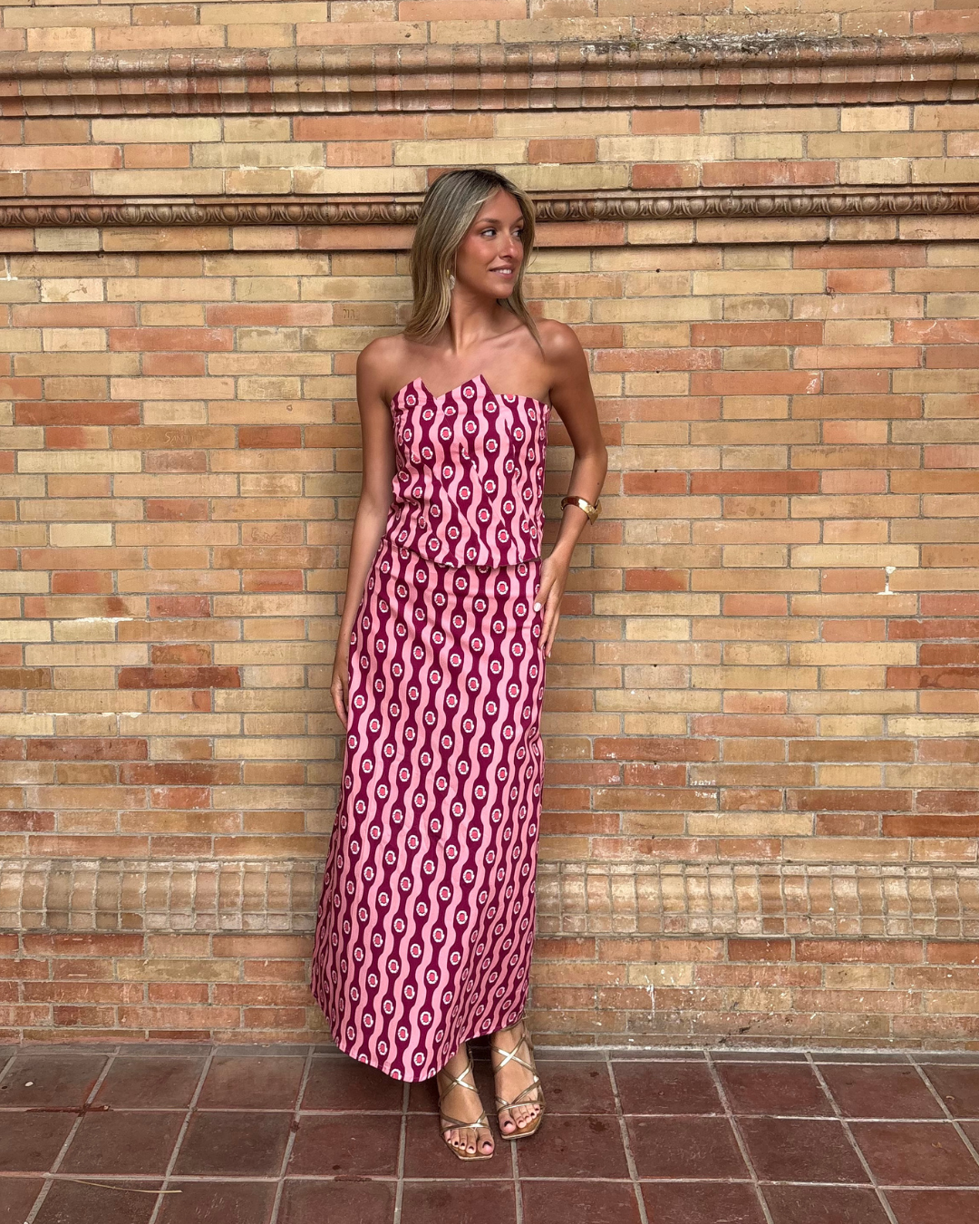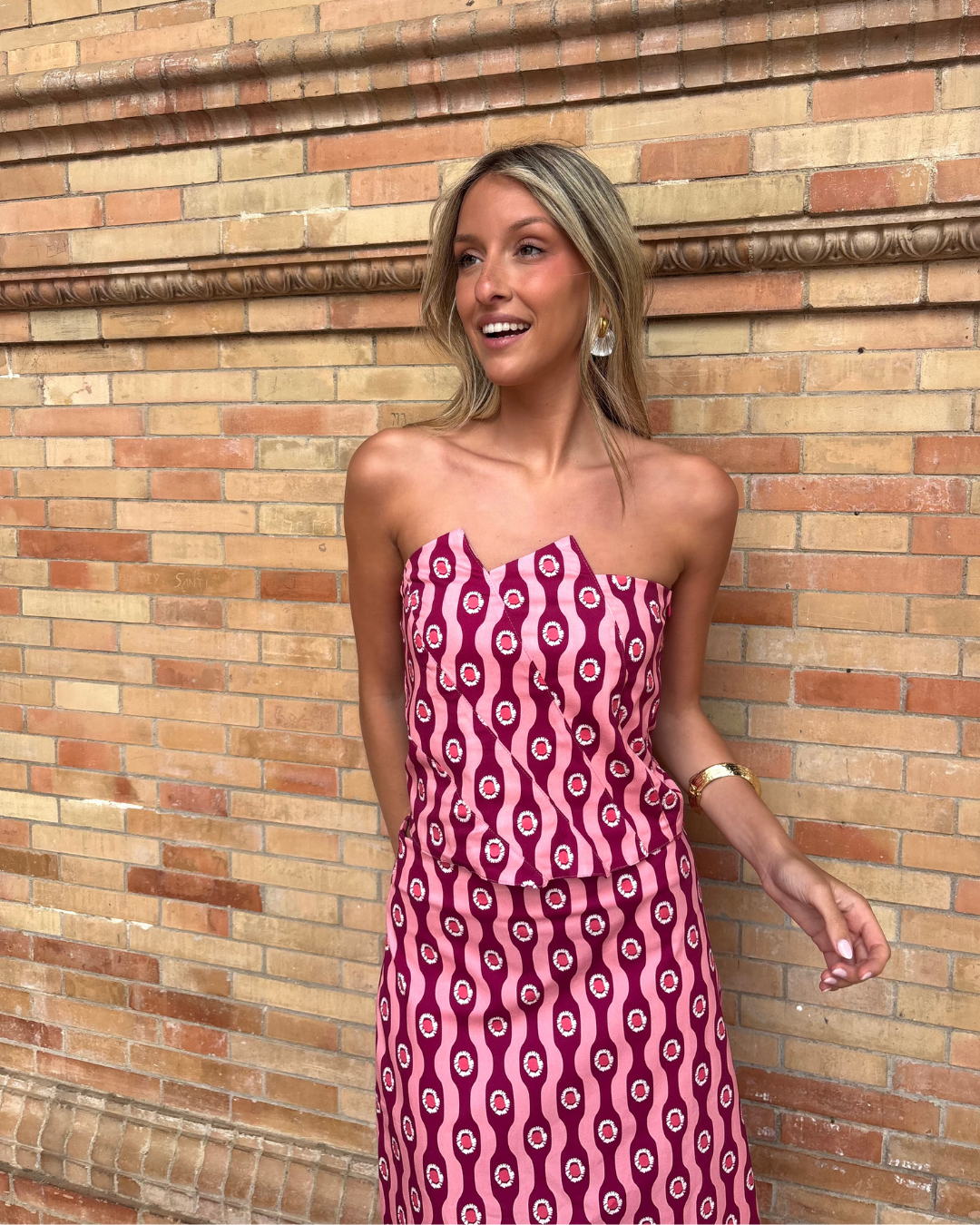 Falda estampada midi de talle alto. Cintura con cierre de cremallera lateral. Evasé desde la cadera.