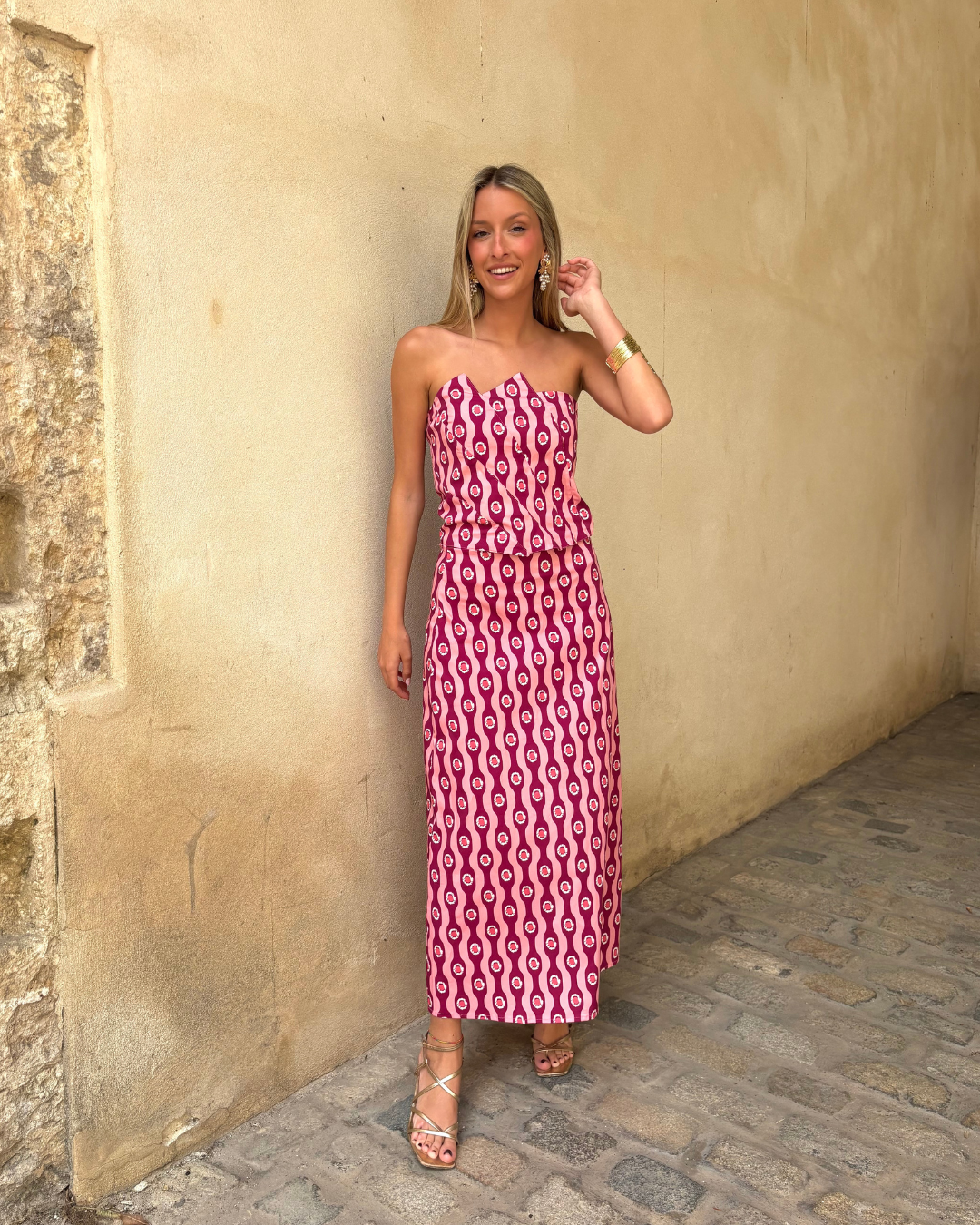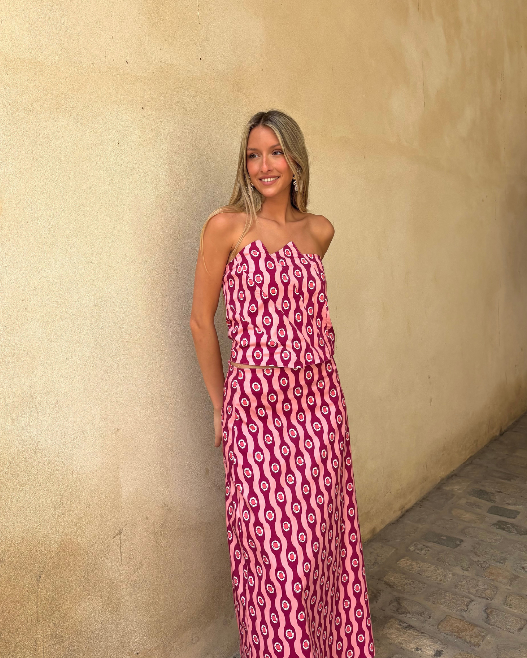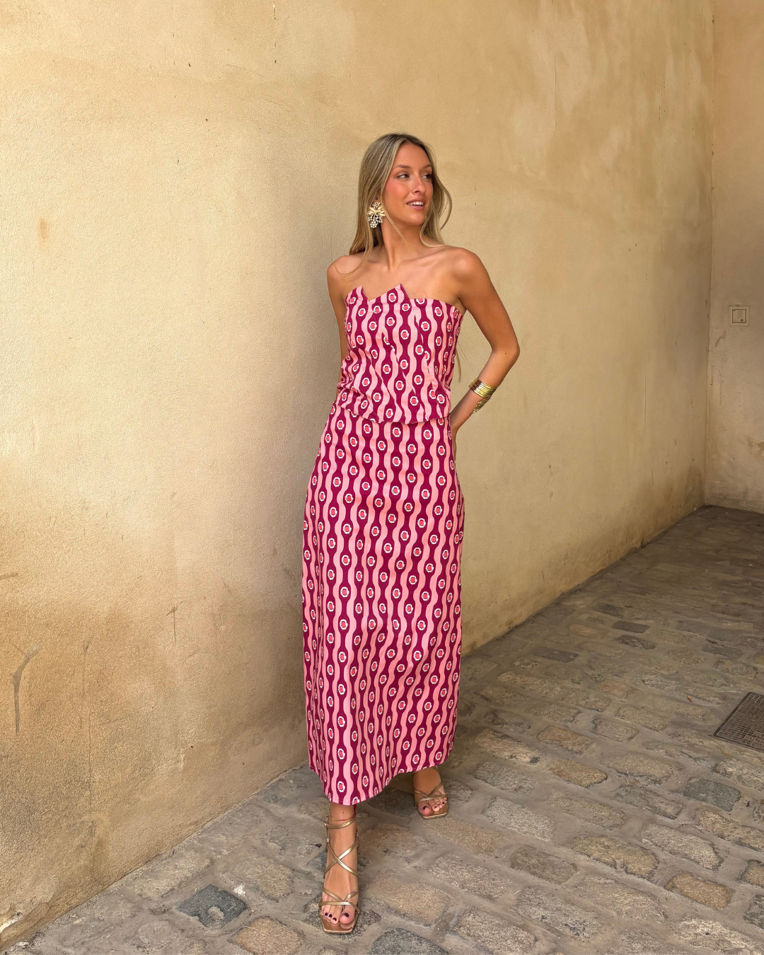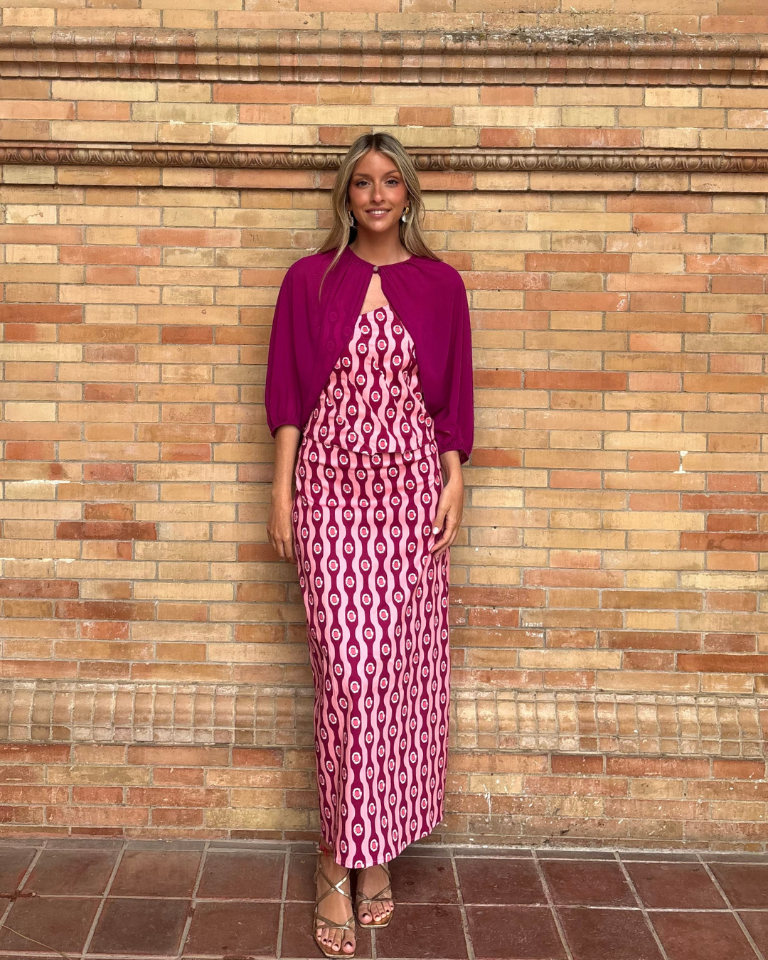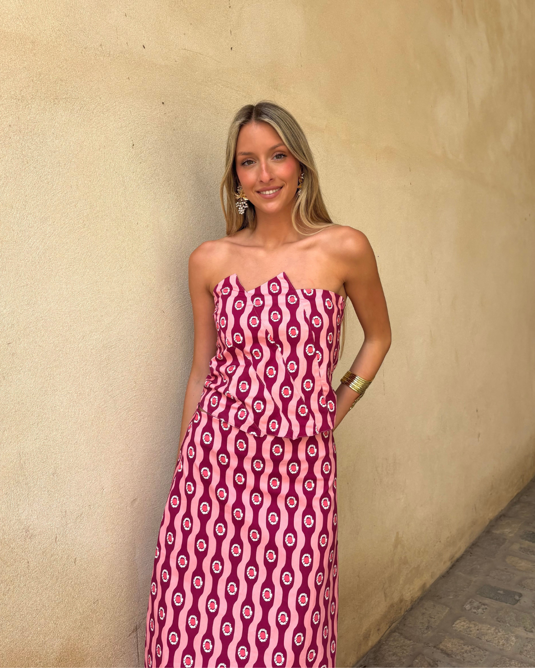Falda estampada midi de talle alto. Cintura con cierre de cremallera lateral. Evasé desde la cadera.