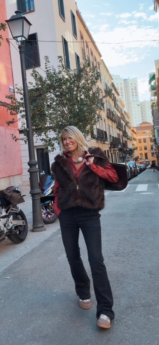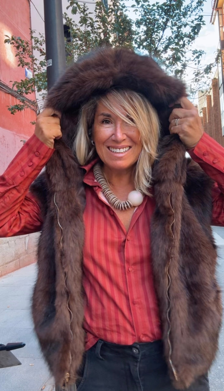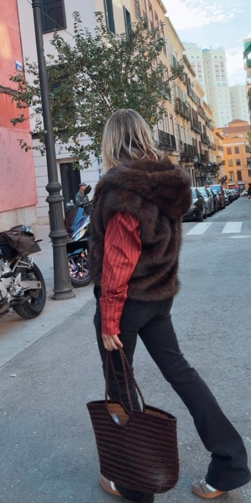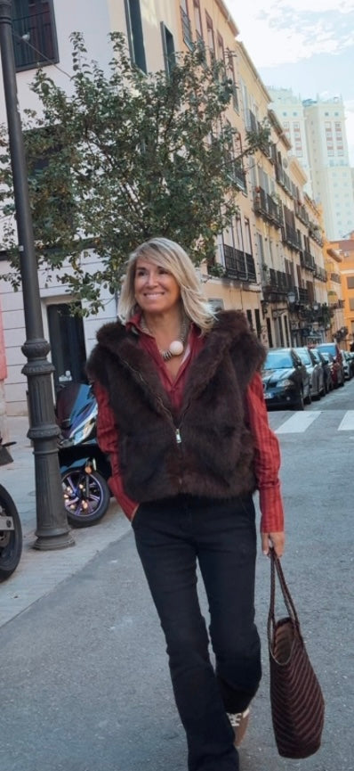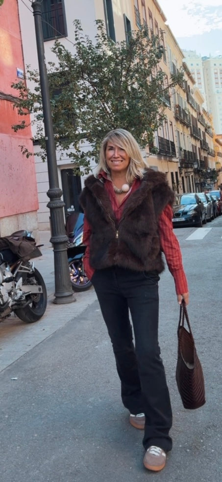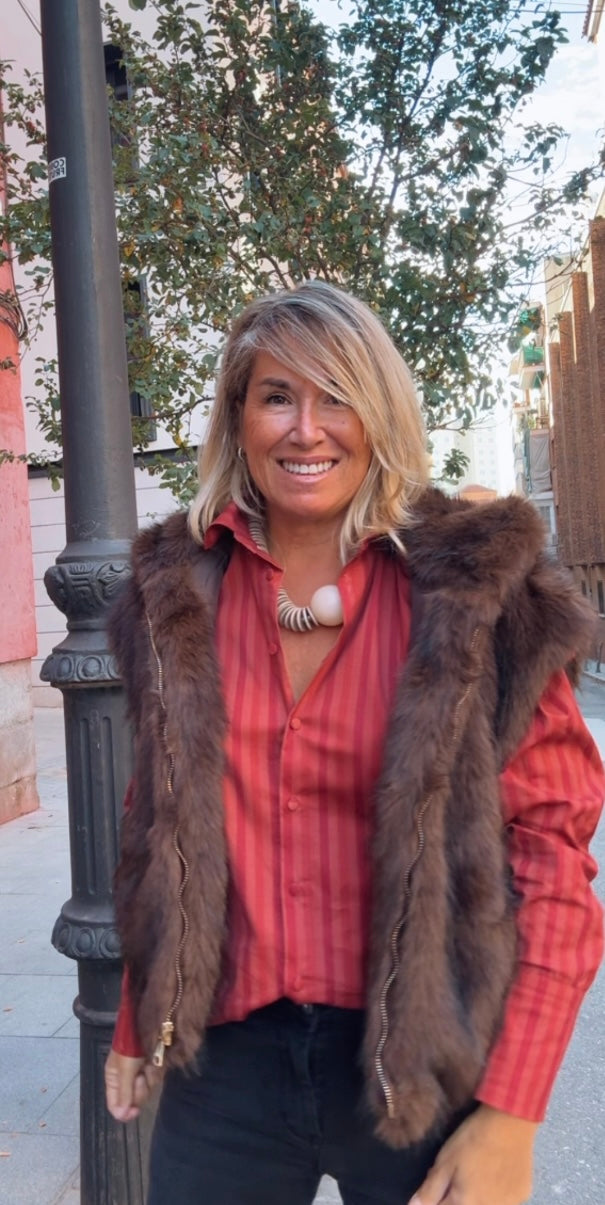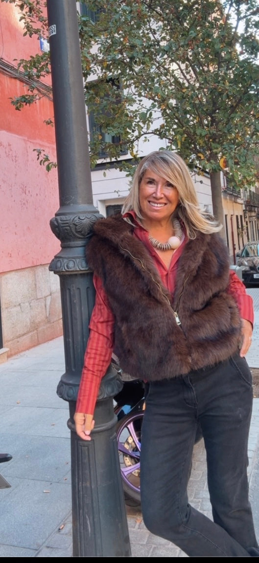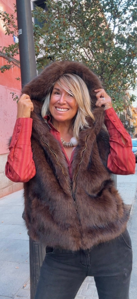 Chaleco de pelo de sintético con capucha. Corte recto. Cierre con cremallera. Sin mangas y con textura suave y voluminosa.