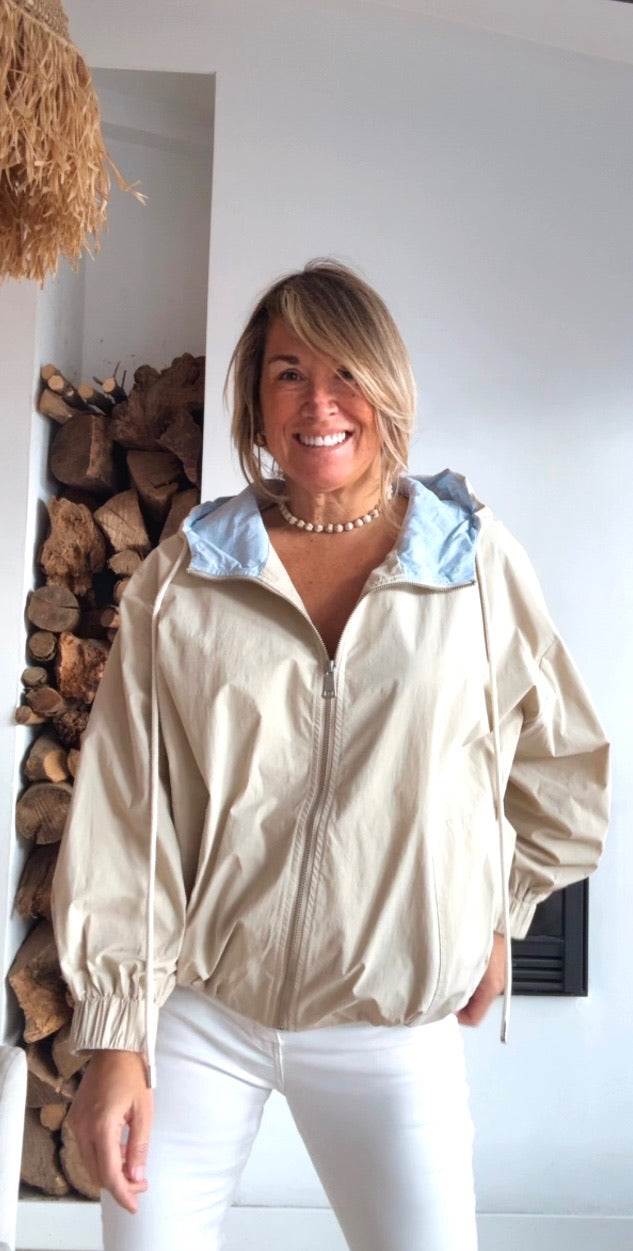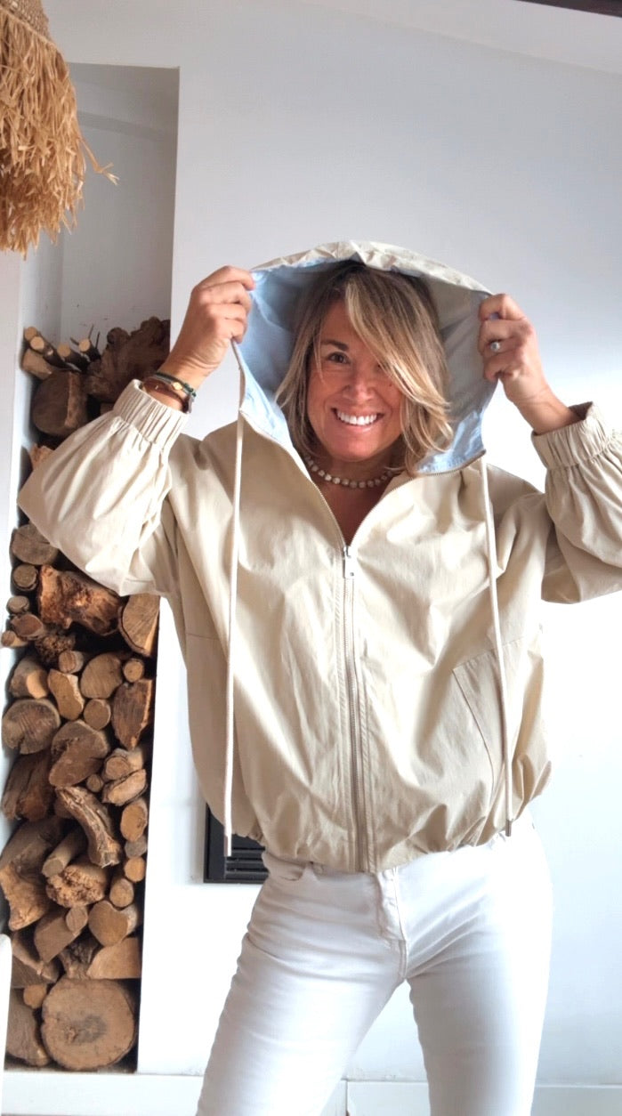 Chaqueta tipo bomber con capucha. Abertura delantera y cierre mediante cremallera metálica. Puño fruncido con goma interior. Bolsillos laterales. Corte recto.