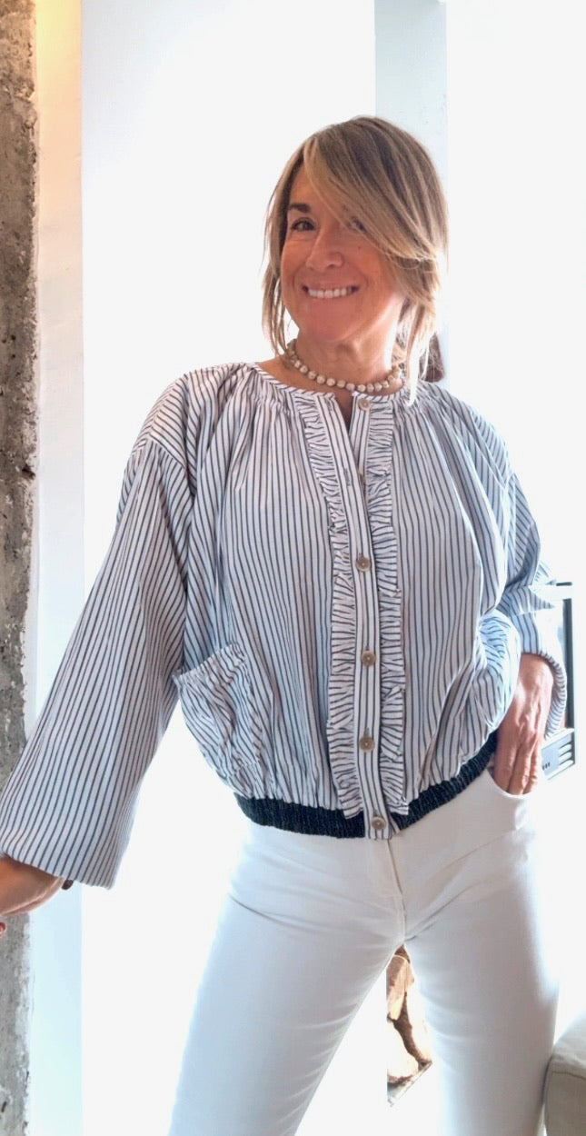 Chaqueta tipo bomber reversible. Cuello mao. Cierre frontal con botones visibles y tapeta fruncida. Dos bolsillos laterales.