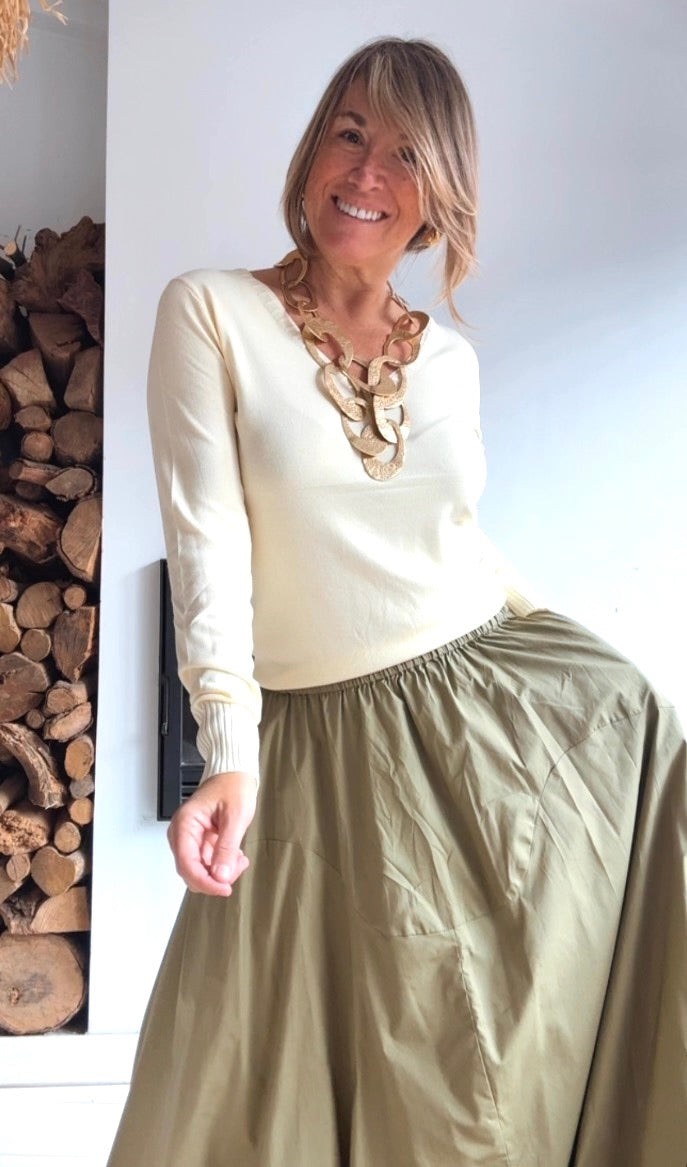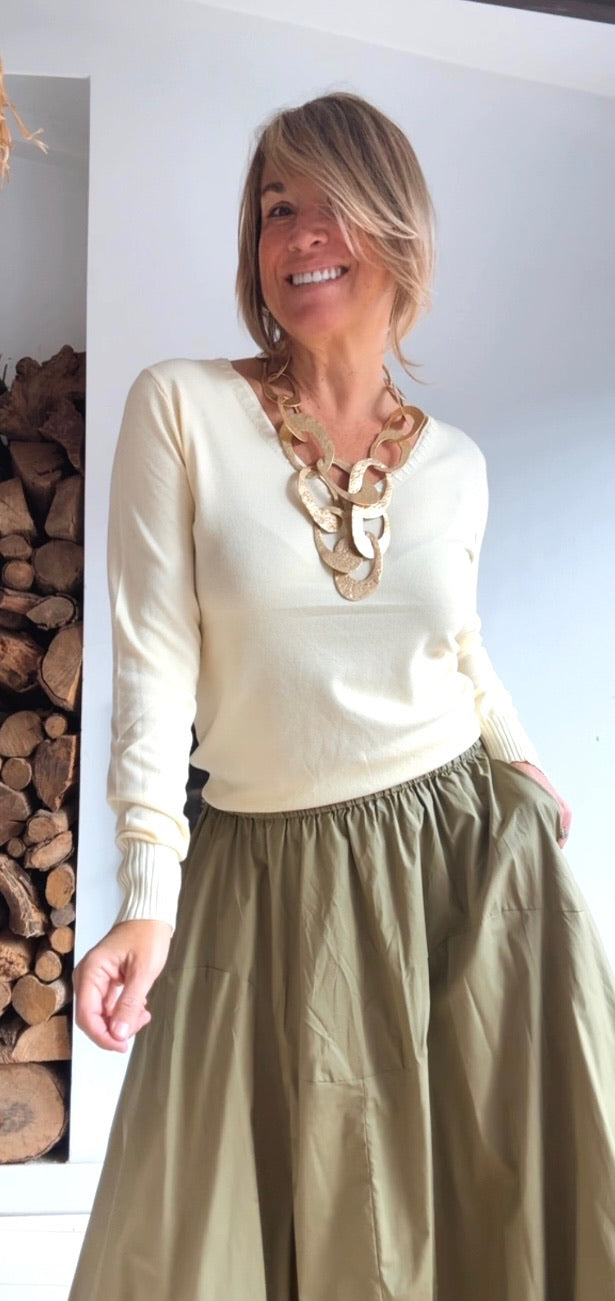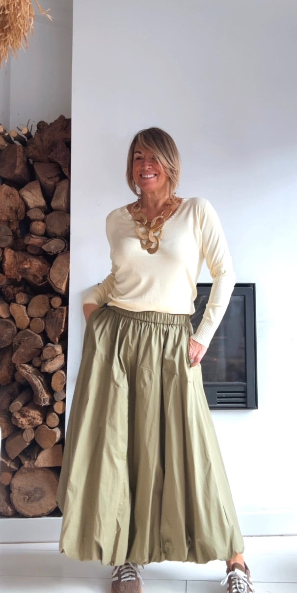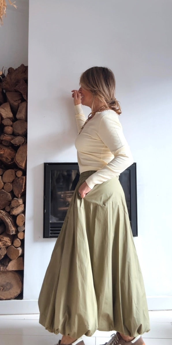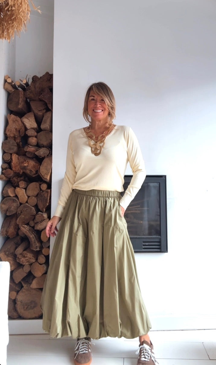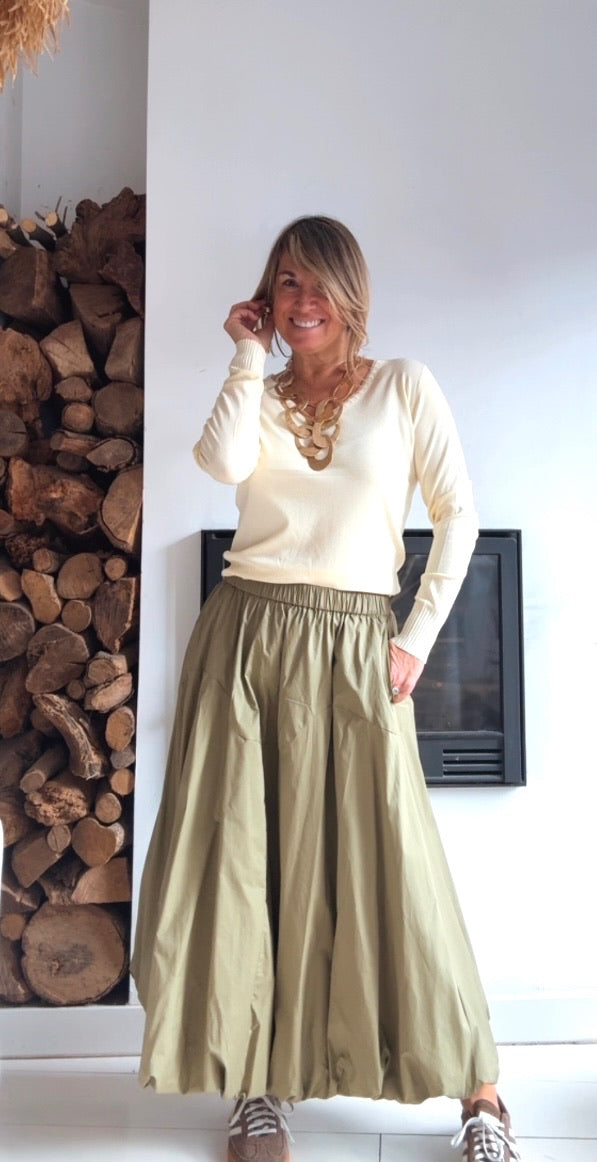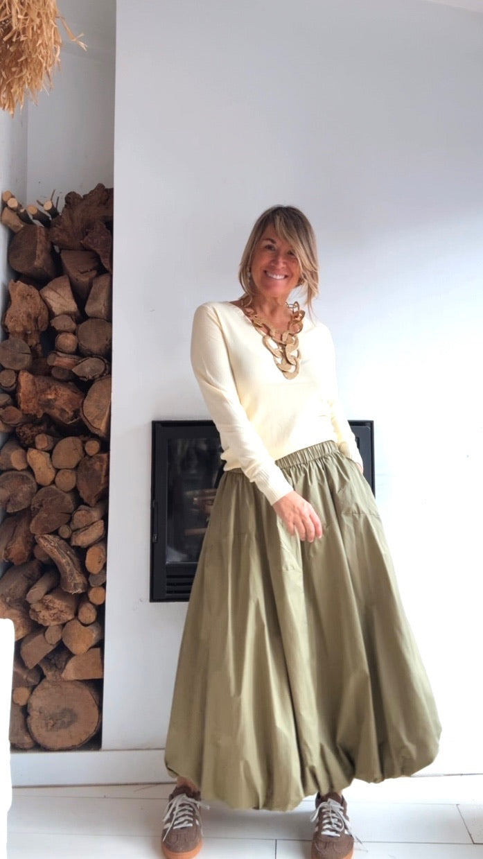 Falda larga. Cintura de goma elástica. Corte abullonado/bombacho pliegues uniformes en la cintura. Terminación inferior con dobladillo simple que mantiene la silueta bombacha.