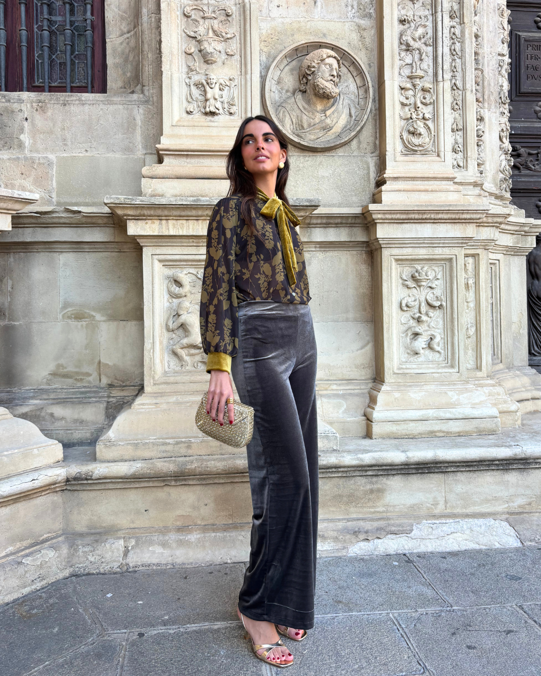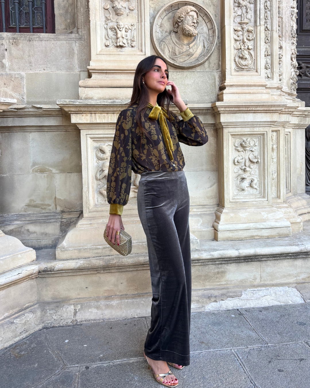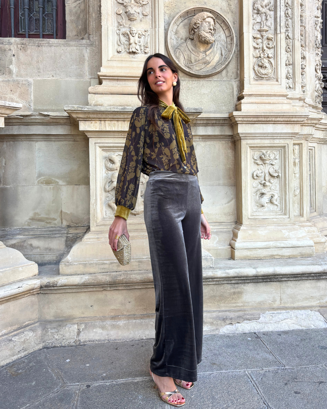 Pantalón de terciopelo. Corte ancho. Cintura de goma elástica.