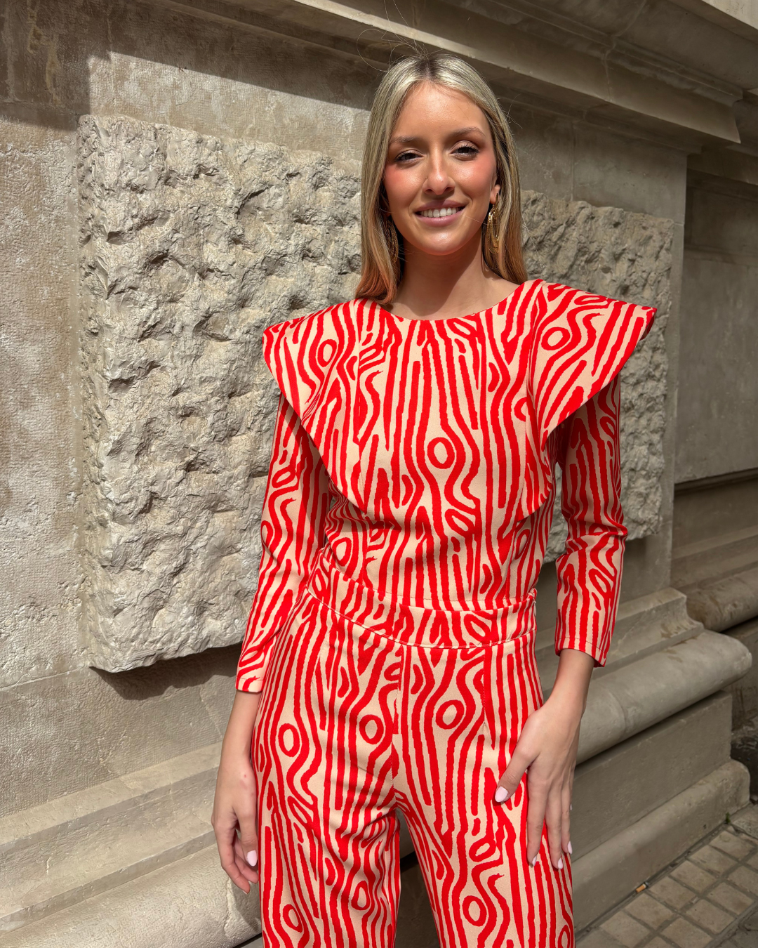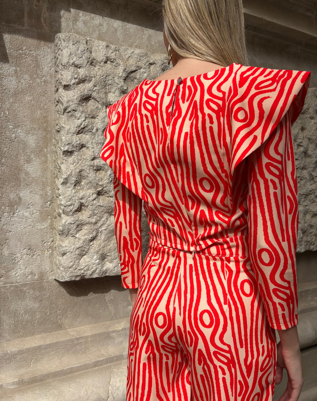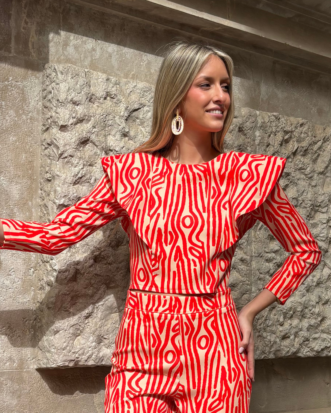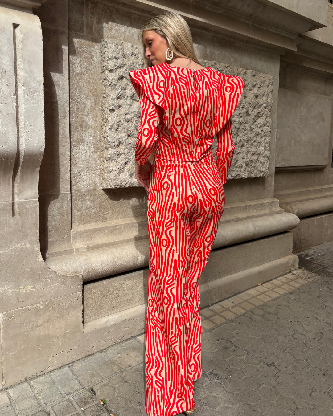 Traje de top y pantalón estampado. Top crop con mangas largas. Detalle de volantes en solapa en los hombros. Cuello redondo. Cierre con cremallera en espalda. Pantalón recto con bajo ligeramente acampanado.Tiro alto. Cierre lateral con cremallera. Sin bolsillos.