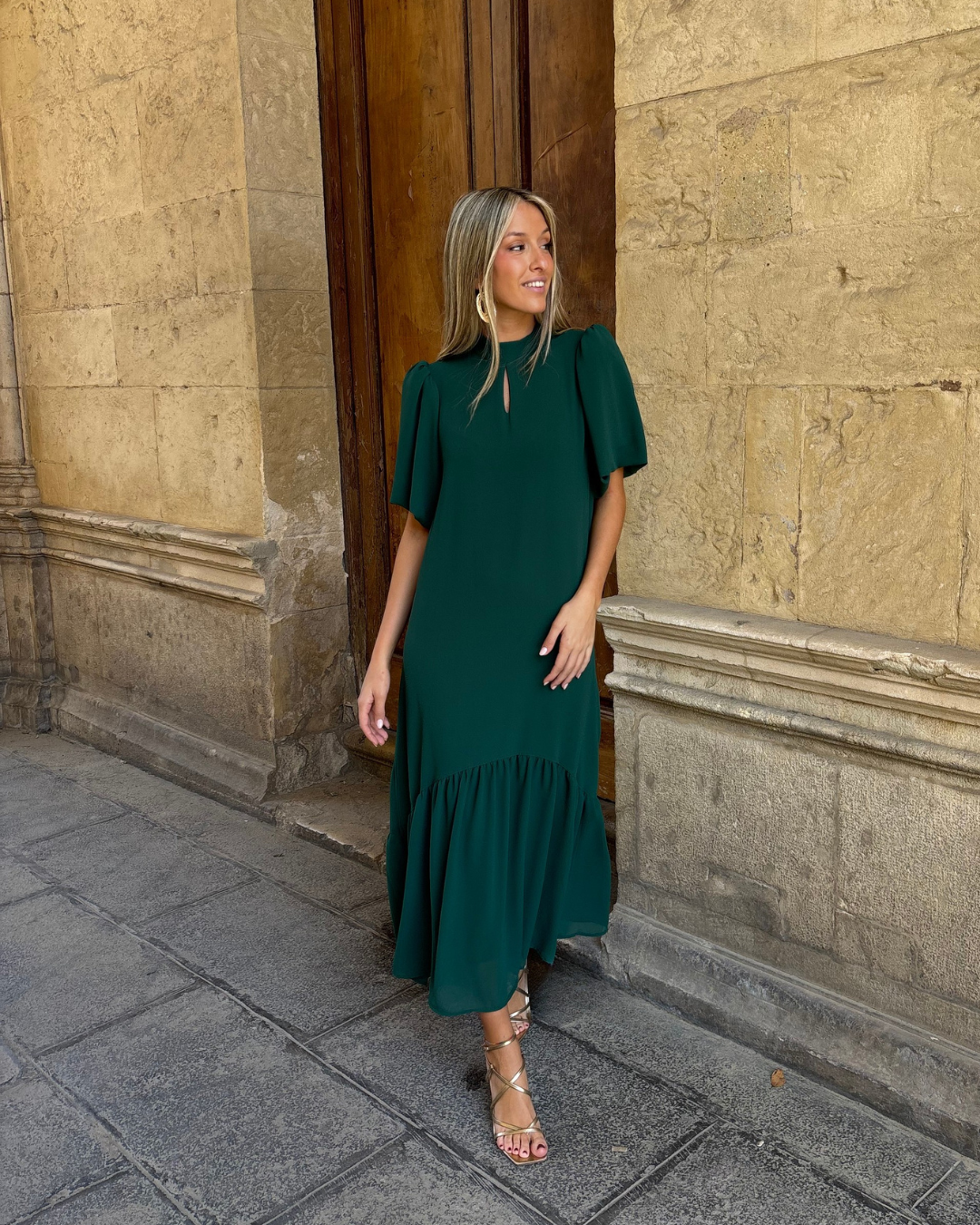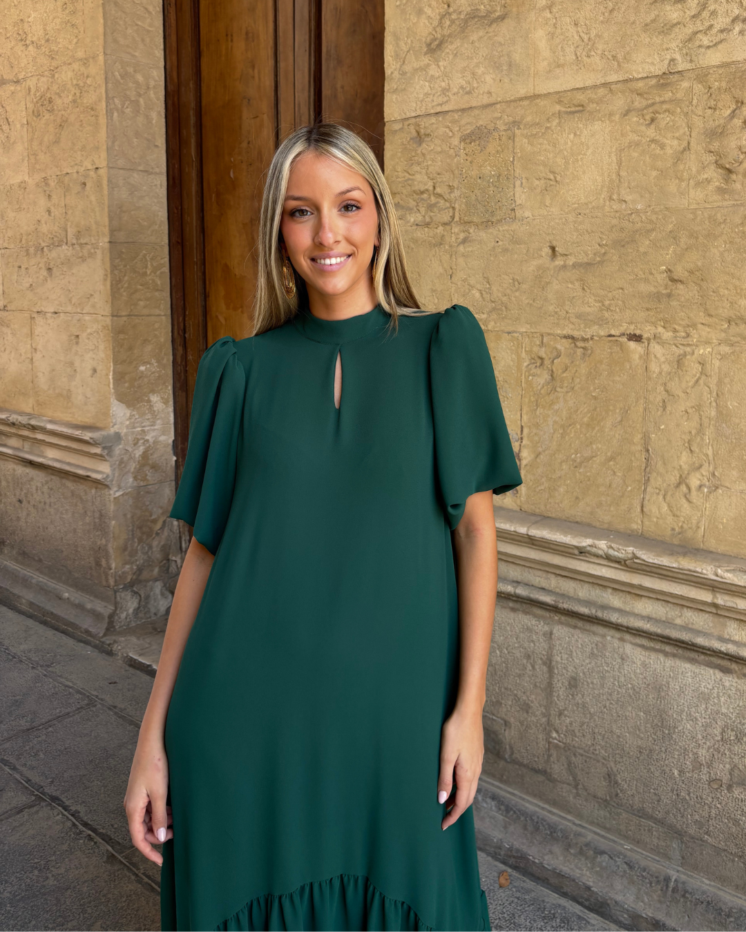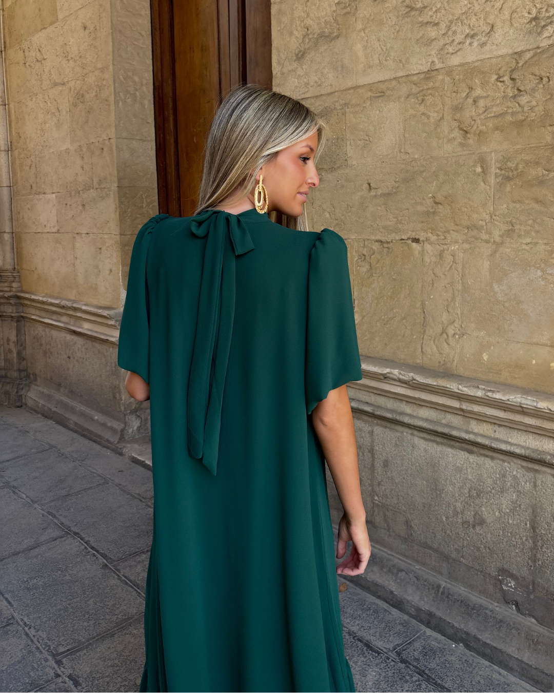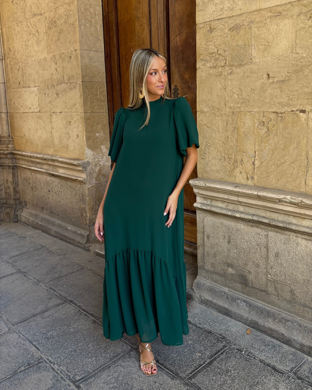 Vestido largo de diseño evasé desde el pecho. Cuello redondo con cierre de lazo en espalda. Mangas cortas globo. Forro interior.
