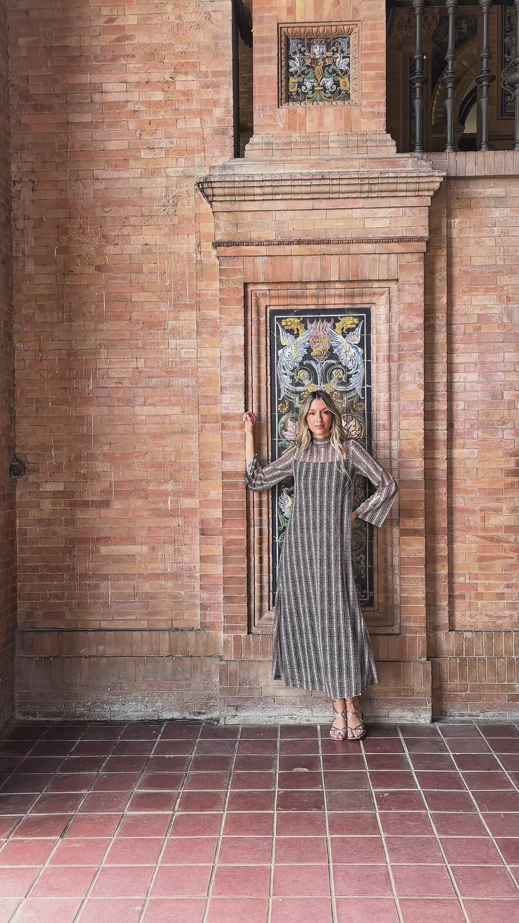 Vestido de tul midi con estampado de patrón retro. Diseño de corte evasé, cuello alto y mangas largas semitransparentes con sutil amplitud en los puños. Tiene forro interior.