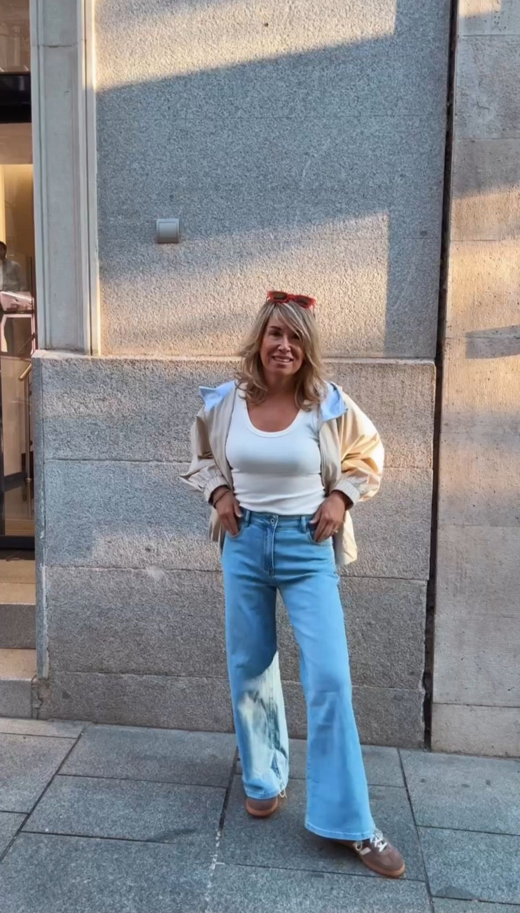 Pantalón vaquero wideleg. Tiro alto. Cierre de botón y cremallera. Ajuste en cintura y cadera. Piernas anchas. Tejido no elástico.